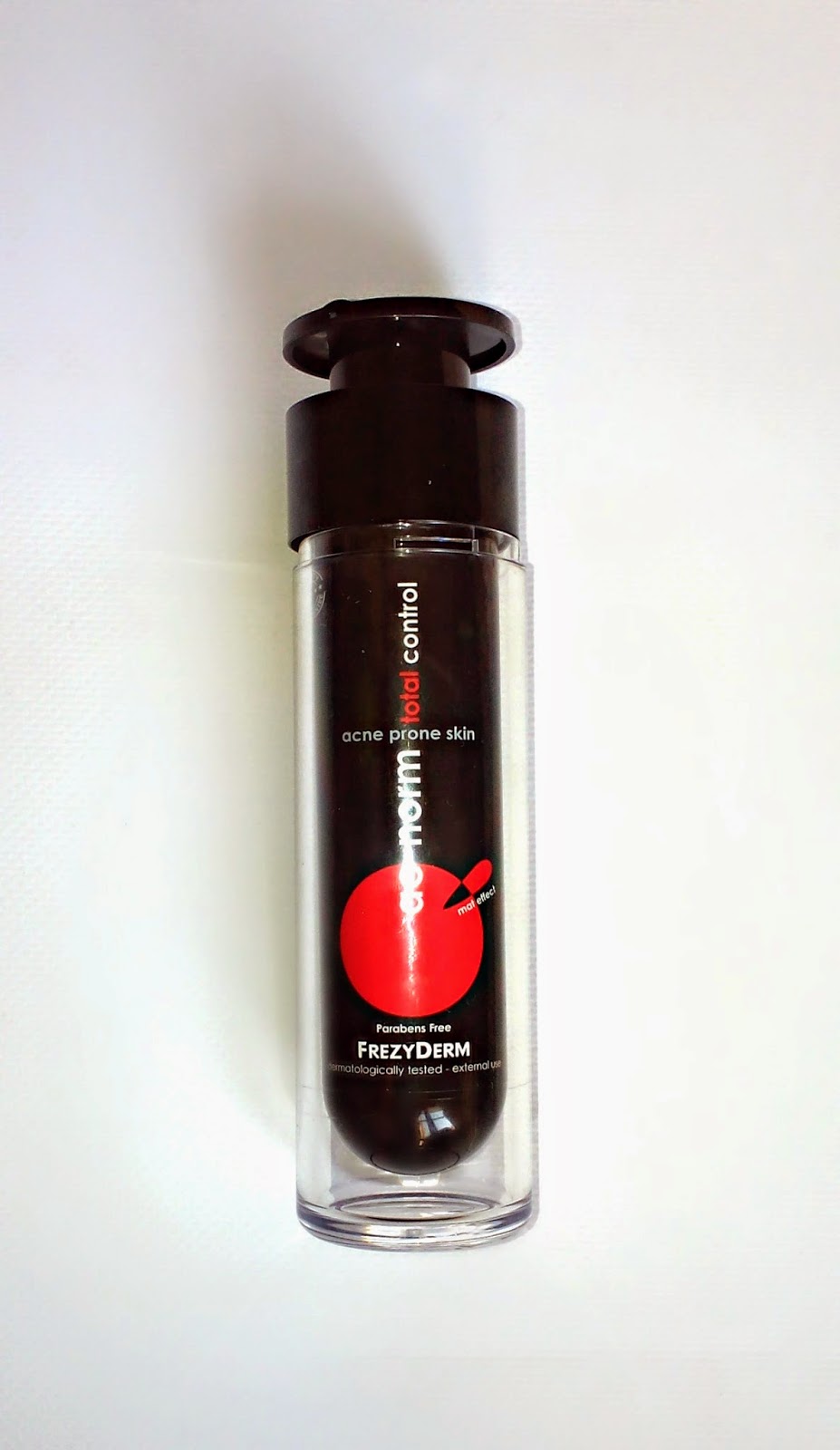 Στη συνέχεια, δοκιμάσαμε την Ac-Norm Total Control Cream. Είναι κρέμα εξισορρόπησης και αντιμετώπισης της ακμής. Δεν προκαλεί ερεθισμούς και κοκκινίλες. Μπορεί να μην έχουμε γενικότερα ακμή, όμως τις »δύσκολες μέρες» έχουμε σχεδόν πάντα σπυράκια και γενικότερα έντονο »κύμα» λιπαρότητας στο πρόσωπο. Παρόλο που δίνει ματ όψη στο δέρμα, το αφήνει ενυδατωμένο επαρκώς και γενικά είναι μια φοβερή κρέμα. Δεν υπάρχει περιορισμός στο διάστημα που μπορούμε να την χρησιμοποιούμε και μπορούμε να την εφαρμόζουμε 2-3 φορές την ημέρα. Μετά από αυτή την δοκιμή των προιόντων της Frezyderm σίγουρα θα την ξανα προτιμήσουμε.