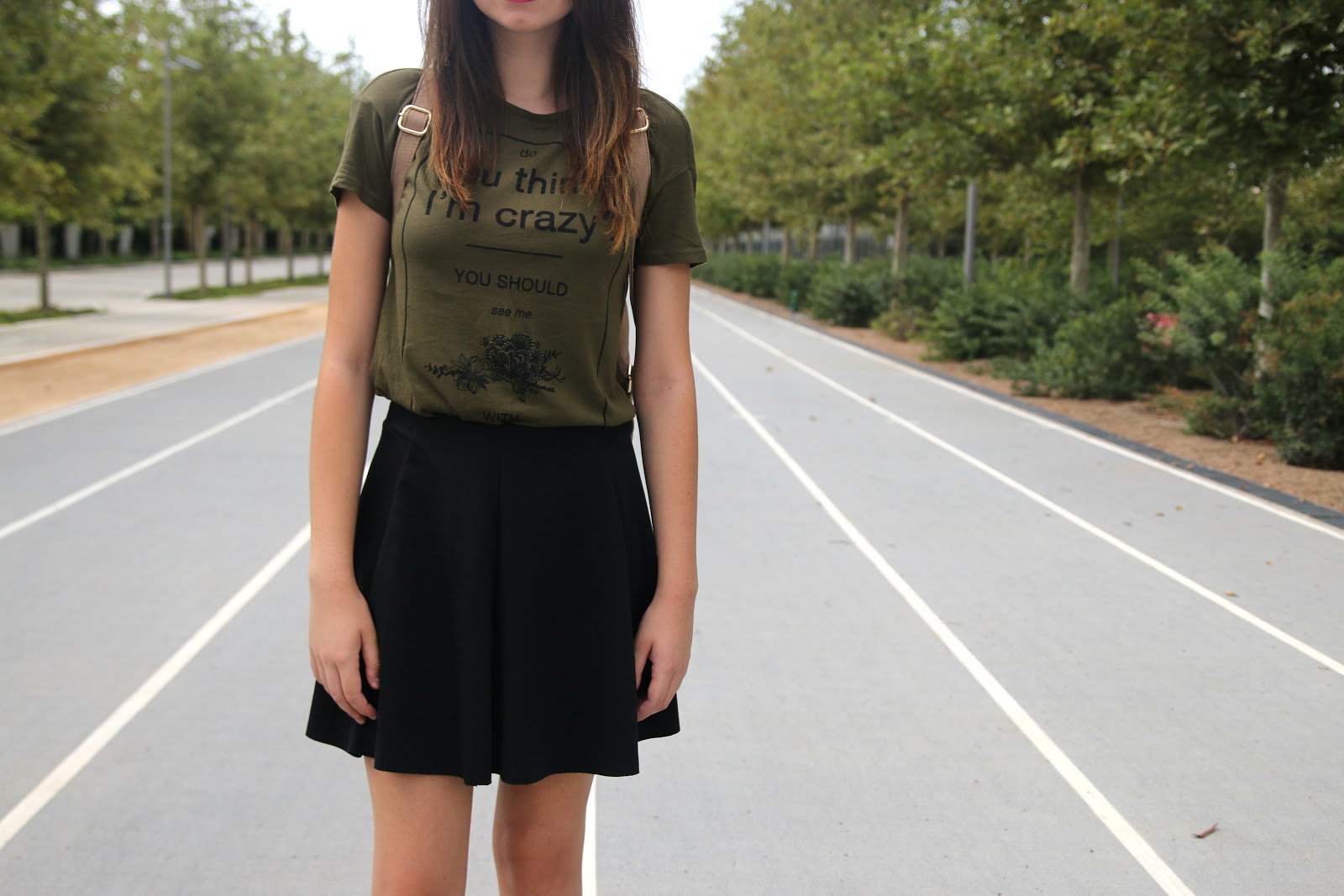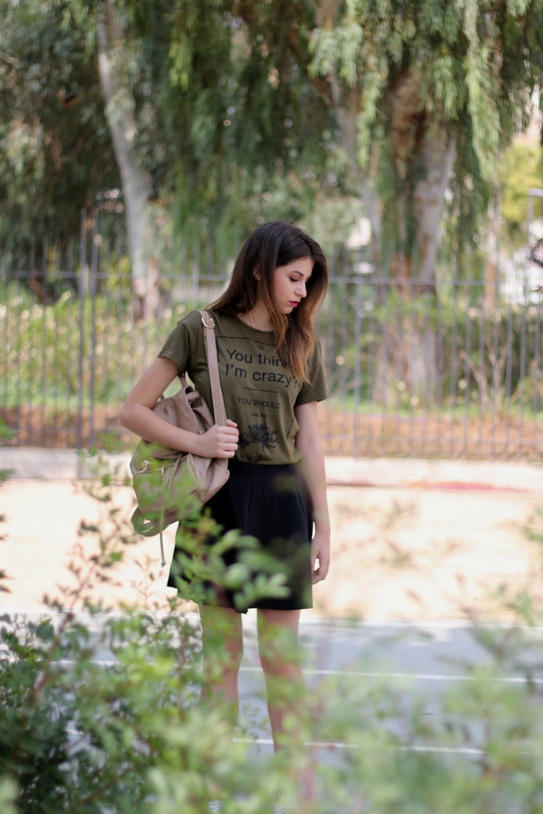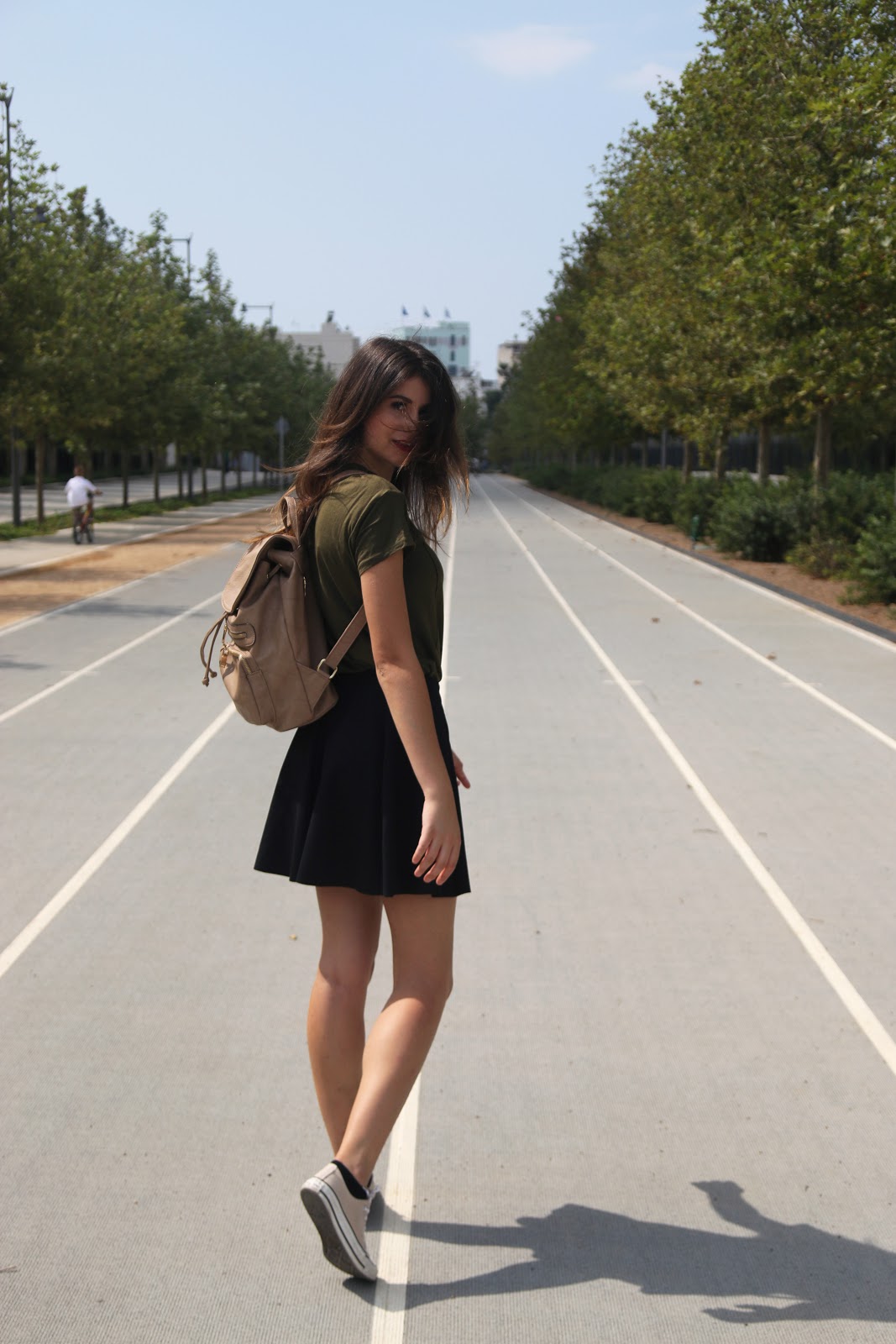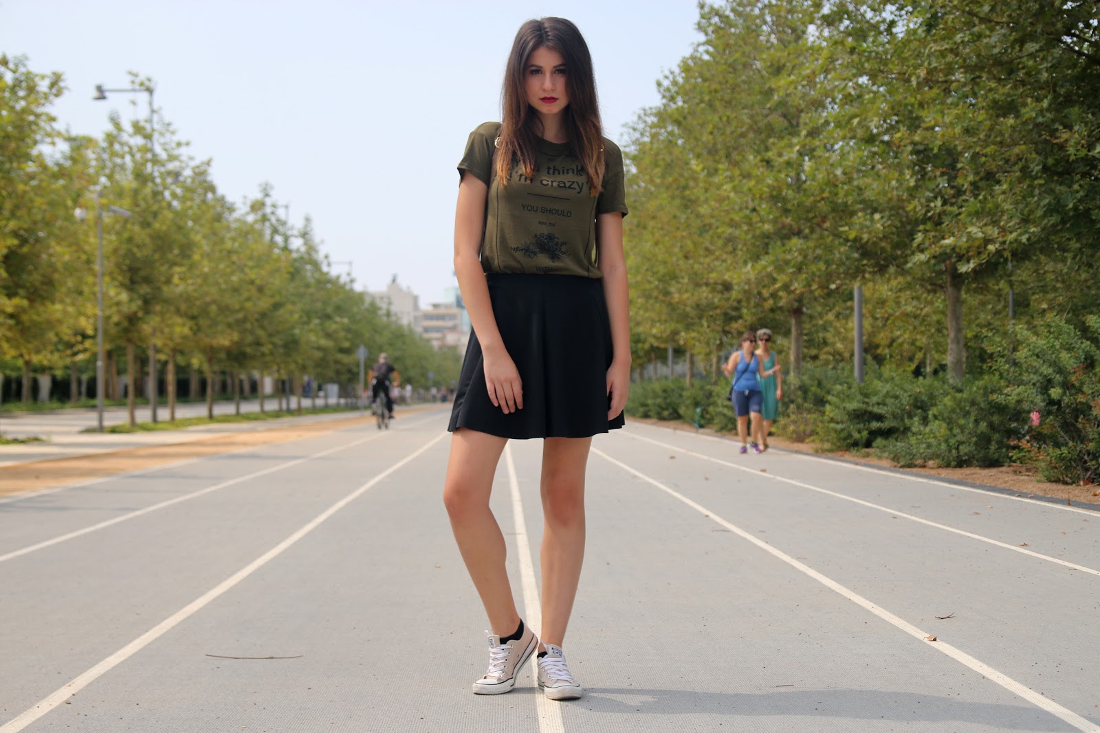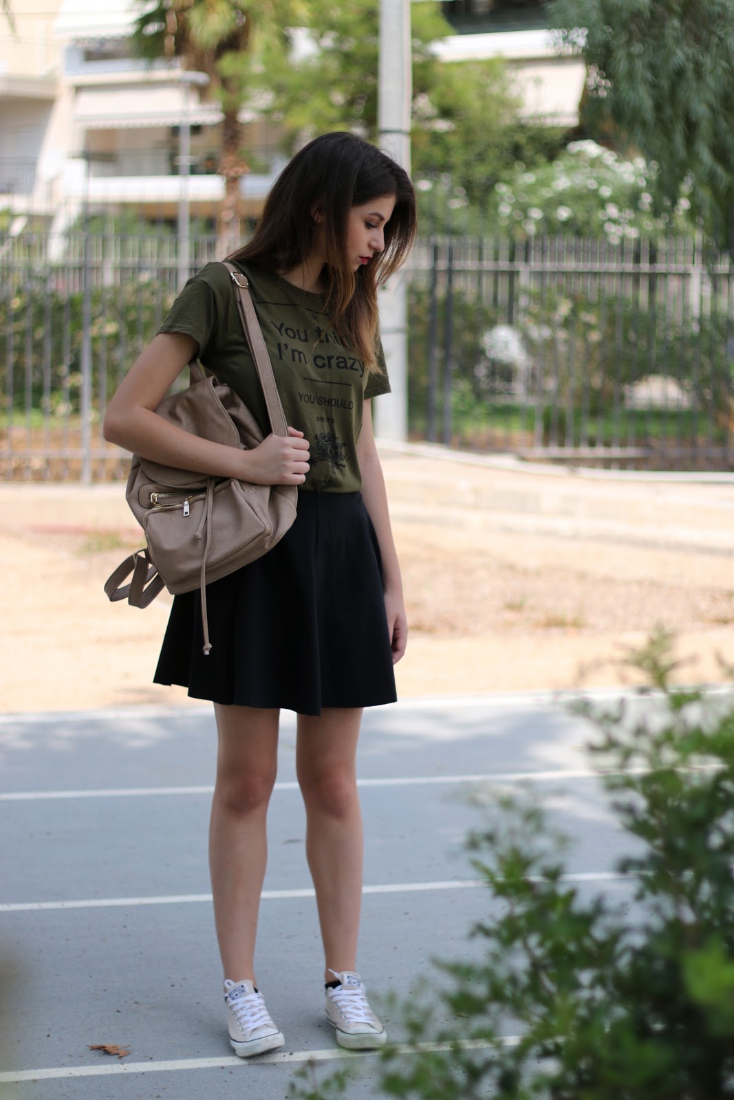 Αφού η Χριστίνα είναι η μαθήτρια της παρέας μας, είναι και η πρωταγωνίστρια σε αυτό το editorial και μας προτείνει ένα άνετο outfit που θυμίζει αρκετά το σχολείο. Επέλεξε μια ψήλόμεση μαύρη circular φούστα που δίνει παιχνιδιάρικο στυλ στο look της, συνδυάζοντας την με ένα T-shirt με στάμπα σε λαδί χρώμα, που παρόλο που η γραμμή της είναι καλοκαιρινή σε βάζει στο φθινοπωρινό κλίμα λόγω χρώματος. Ως παπούτσια δεν γινόταν να διαλέξει κάτι άλλο από τα αγαπημένα της All Star στο χρώμα της άμμου που είναι ουδέτερο, και ένα backpack σε ανοιχτό καφέ χρώμα, με χρυσές λεπτομέρειες και πολλές θήκες για να κρατήσει μαζί της όλα τα πράγματα της.