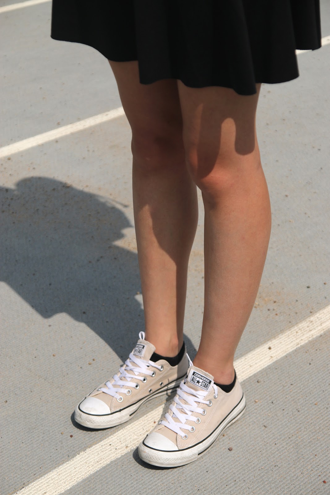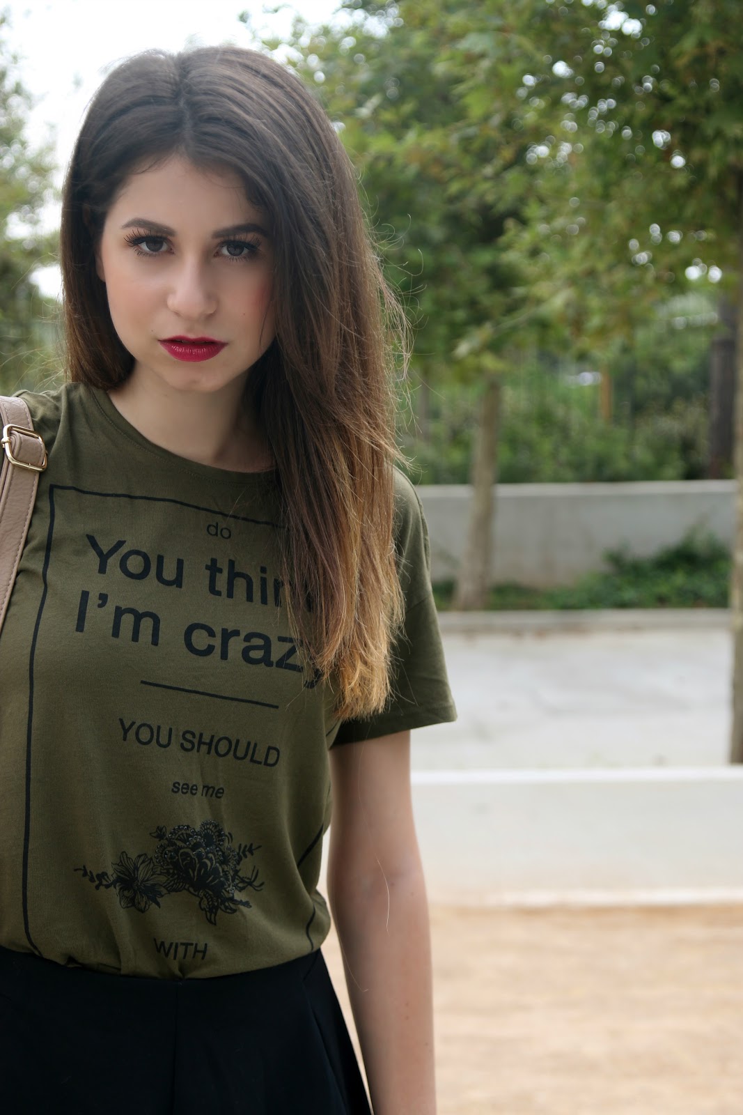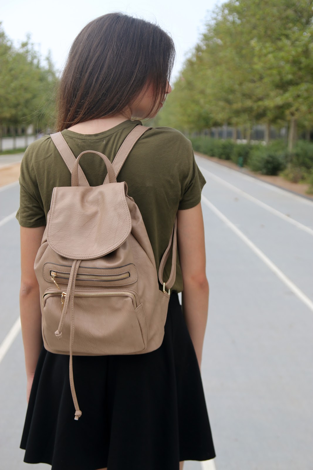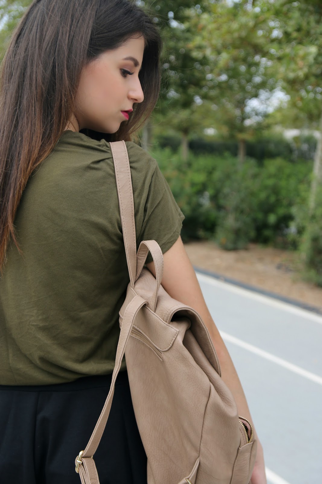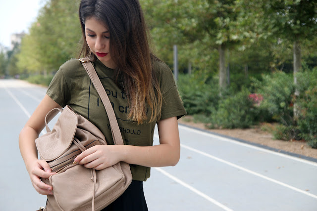 Αφού η Χριστίνα είναι η μαθήτρια της παρέας μας, είναι και η πρωταγωνίστρια σε αυτό το editorial και μας προτείνει ένα άνετο outfit που θυμίζει αρκετά το σχολείο. Επέλεξε μια ψήλόμεση μαύρη circular φούστα που δίνει παιχνιδιάρικο στυλ στο look της, συνδυάζοντας την με ένα T-shirt με στάμπα σε λαδί χρώμα, που παρόλο που η γραμμή της είναι καλοκαιρινή σε βάζει στο φθινοπωρινό κλίμα λόγω χρώματος. Ως παπούτσια δεν γινόταν να διαλέξει κάτι άλλο από τα αγαπημένα της All Star στο χρώμα της άμμου που είναι ουδέτερο, και ένα backpack σε ανοιχτό καφέ χρώμα, με χρυσές λεπτομέρειες και πολλές θήκες για να κρατήσει μαζί της όλα τα πράγματα της.