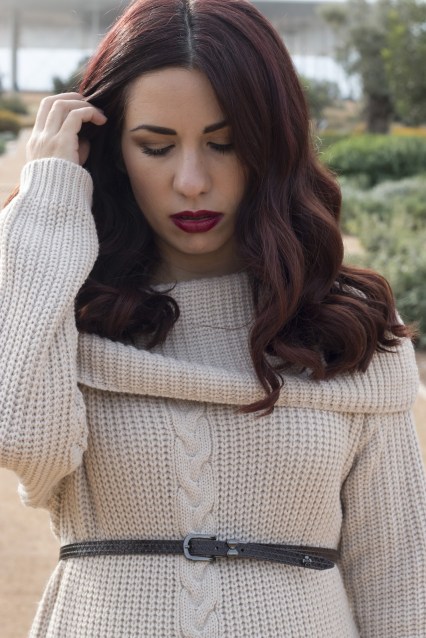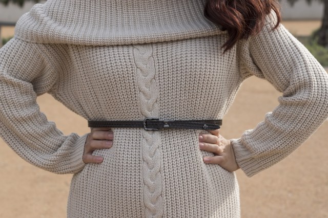 Σε αυτό το editorial,η ανανεωμένη Γεωργία μας, ως νέα μανούλα επέλεξε ένα sweater dress σε μπεζ χρώμα, με χοντρή πλέξη και off the shoulder.Δεν είναι ούτε πολύ κοντό ούτε και πολύ μακρύ, και έτσι μπορεί να κινηθεί άνετα χωρίς να ανησυχεί. Ακριβώς επειδή είναι oversized προτίμησε να προσθέσει μια λεπτή ζώνη σε σκούρο καφέ που τονίζει την μέση της και το κάνει πιο elegant,μαζί με ένα ζευγάρι ψηλοτάκουνες γόβες στην ίδια απόχρωση.