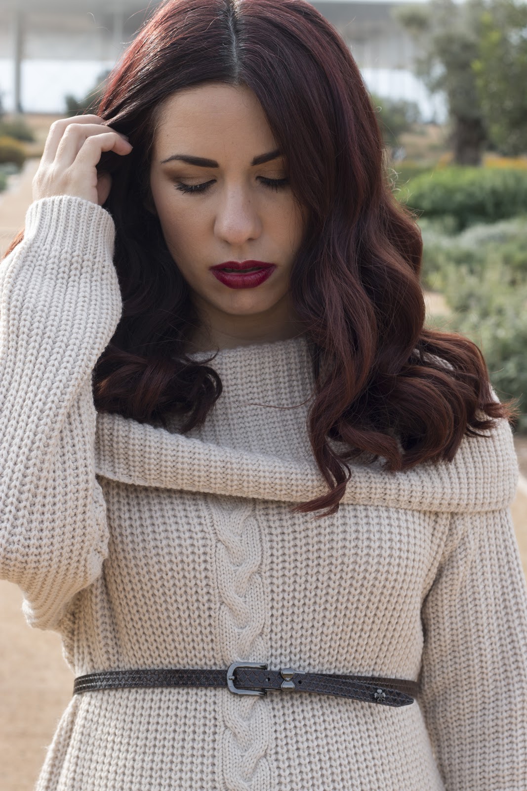 Προτίμησε να μην προσθέσει παραπάνω αξεσουάρ και να το αφήσει minimal,ώστε να μπορεί να το φορέσει όλες της ώρες της ημέρας, αλλάζοντας απλά τα τακούνια της με ίσως κάτι πιο άνετο. Δεν γινόταν να διαλέξει άλλο από ανάλαφρες μπούκλες και ένα μακιγιάζ βασισμένο στις γήινες αποχρώσεις στα μάτια και έντονα βυσσινί χείλη.