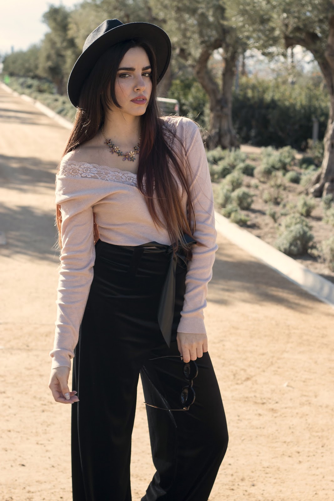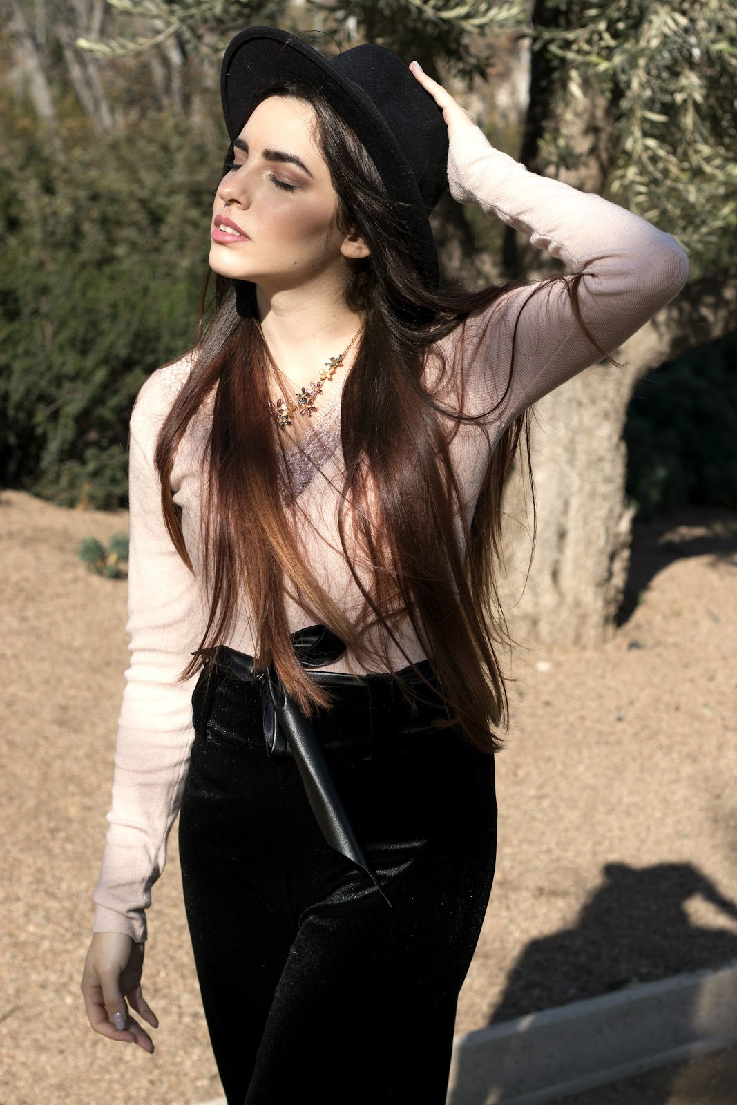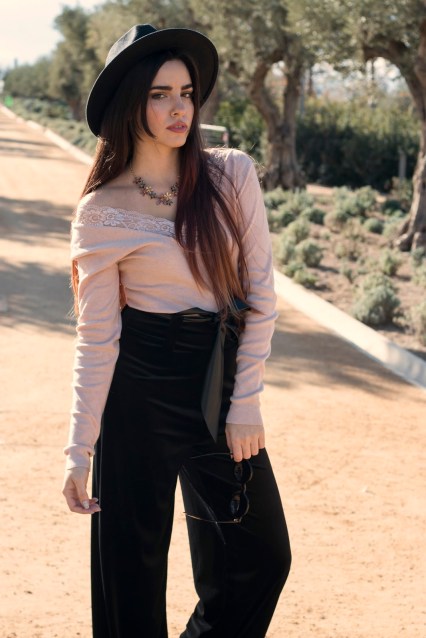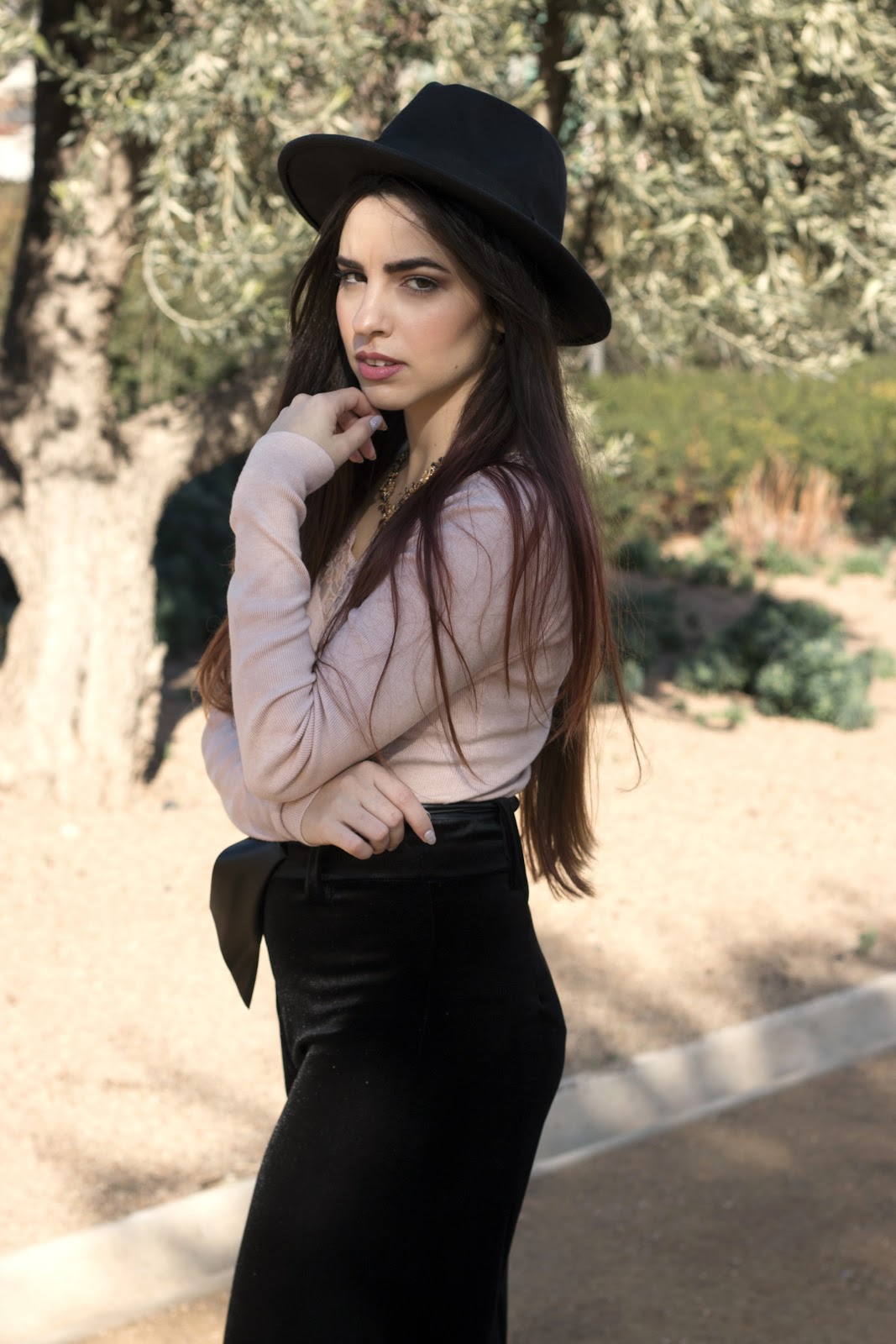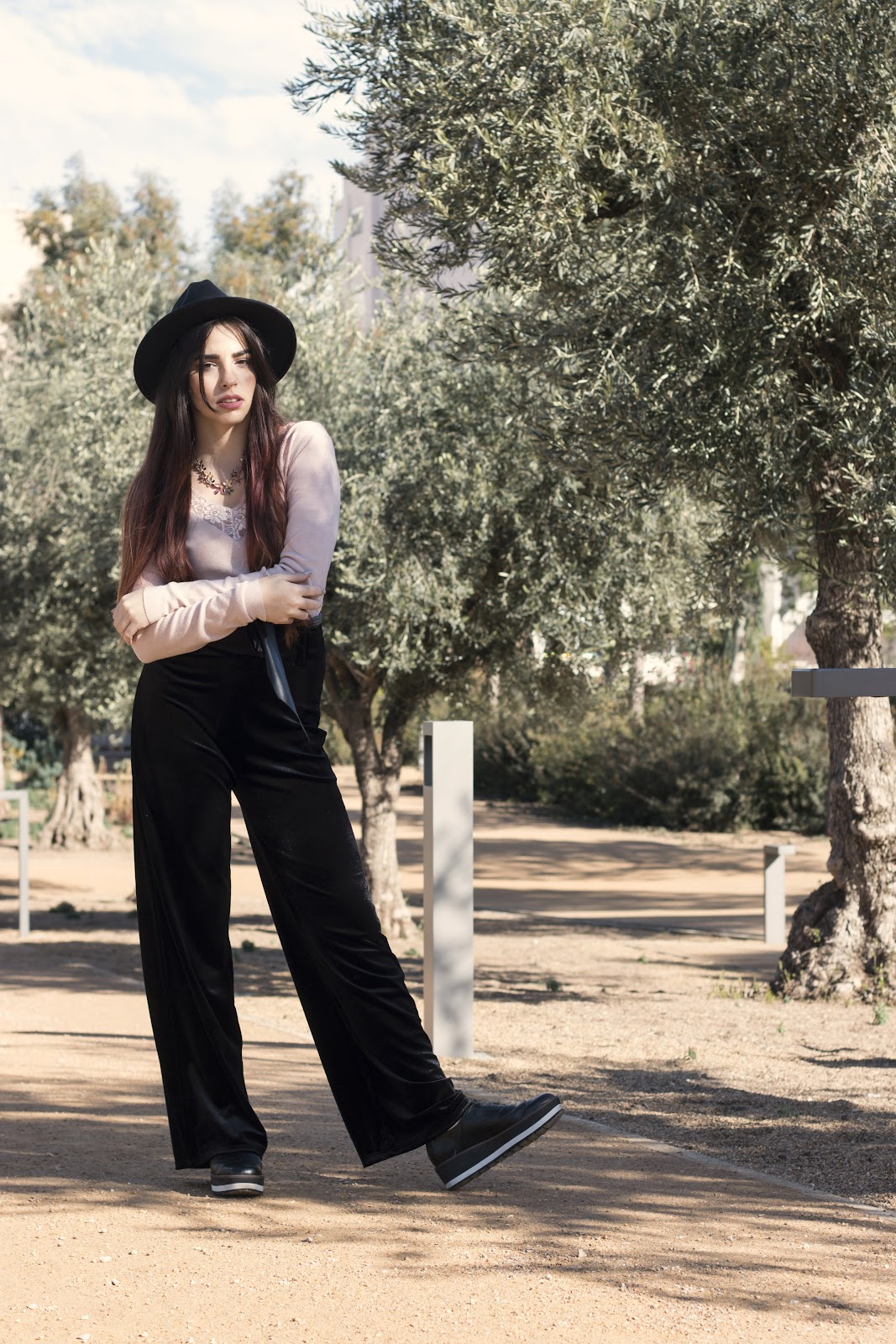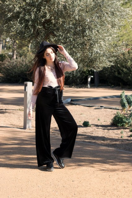 Φορώντας ένα μαύρο βελούδινο παντελόνι καμπάνα, το οποίο είναι ψηλόμεσο με μαύρη κορδέλα για ζωνίτσα, είναι άνετο και παράλληλα τονίζει την σιλουέτα και τα πόδια, ενώ το κορμάκι σε σομόν χρώμα με δαντέλα στο τελείωμα στους ώμους κολακεύει αυτό το σημείο άπειρα. Το μεγάλο του άνοιγμα τονίζει την περιοχή αρκετά ώστε να είναι chic αλλά να μπορεί να κινηθεί εύκολα χωρίς να έχει άγχος. Για παπούτσια επέλεξε ένα ζευγάρι μαύρα δερμάτινα oxfords που κάνουν το look πιο nerdy,ενώ για αξεσουάρ ένα κόσμημα στο λαιμό με λουλούδια σε παρόμοιες αποχρώσεις ένα μαύρο suede καπέλο που απογειώνει το όλο outfit,και ένα ζευγάρι στρογγυλά γυαλιά ηλίου σε σκούρα καφέ απόχρωση.