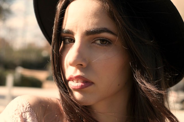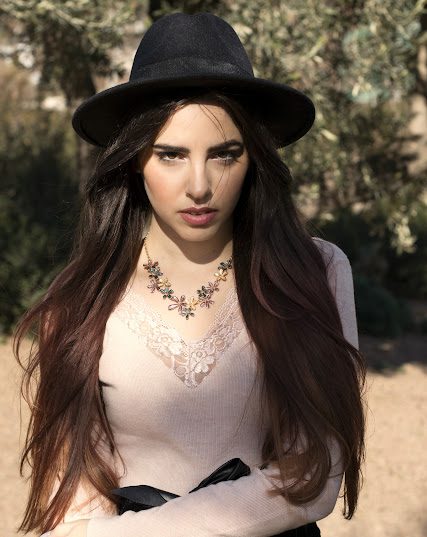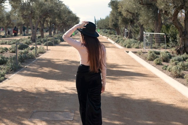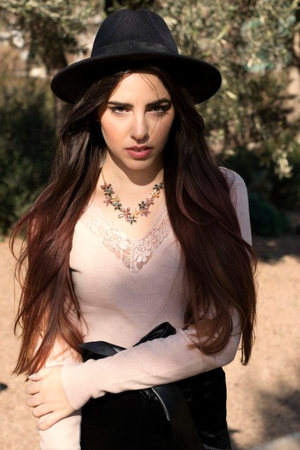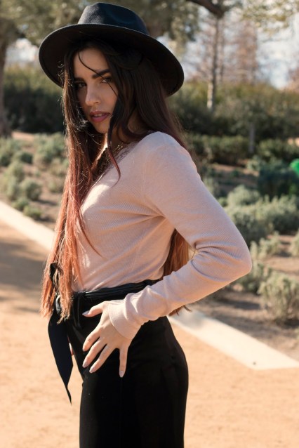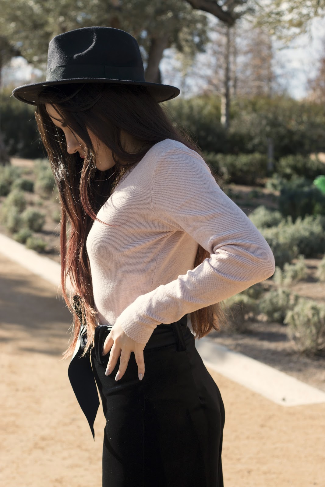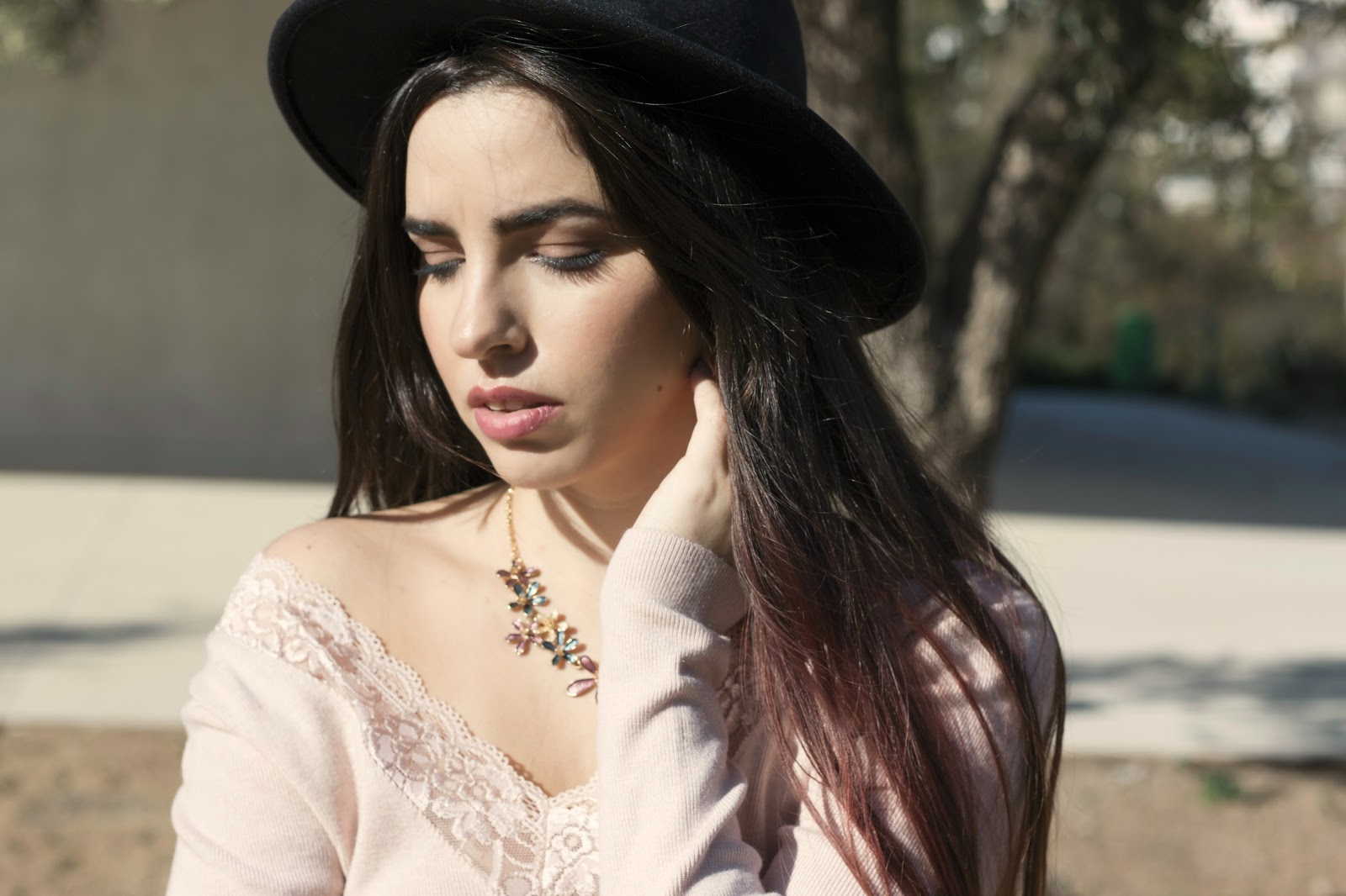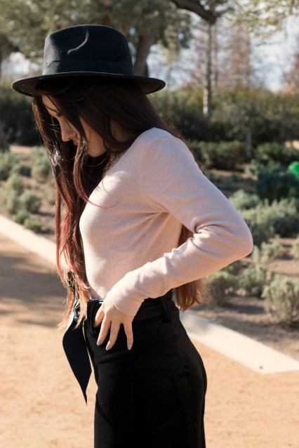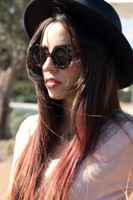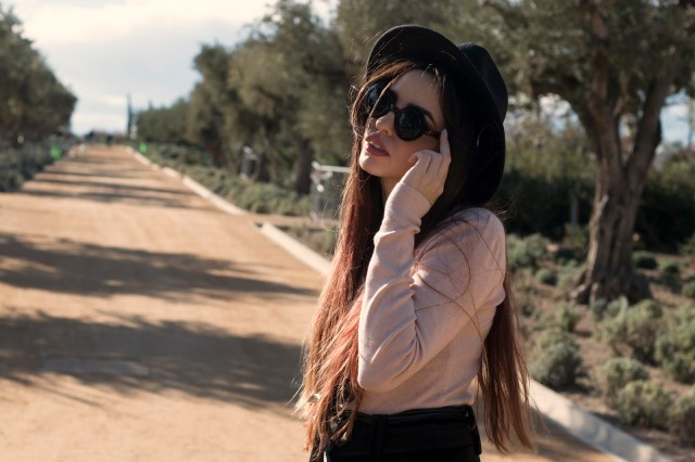 Φορώντας ένα μαύρο βελούδινο παντελόνι καμπάνα, το οποίο είναι ψηλόμεσο με μαύρη κορδέλα για ζωνίτσα, είναι άνετο και παράλληλα τονίζει την σιλουέτα και τα πόδια, ενώ το κορμάκι σε σομόν χρώμα με δαντέλα στο τελείωμα στους ώμους κολακεύει αυτό το σημείο άπειρα. Το μεγάλο του άνοιγμα τονίζει την περιοχή αρκετά ώστε να είναι chic αλλά να μπορεί να κινηθεί εύκολα χωρίς να έχει άγχος. Για παπούτσια επέλεξε ένα ζευγάρι μαύρα δερμάτινα oxfords που κάνουν το look πιο nerdy,ενώ για αξεσουάρ ένα κόσμημα στο λαιμό με λουλούδια σε παρόμοιες αποχρώσεις ένα μαύρο suede καπέλο που απογειώνει το όλο outfit,και ένα ζευγάρι στρογγυλά γυαλιά ηλίου σε σκούρα καφέ απόχρωση.