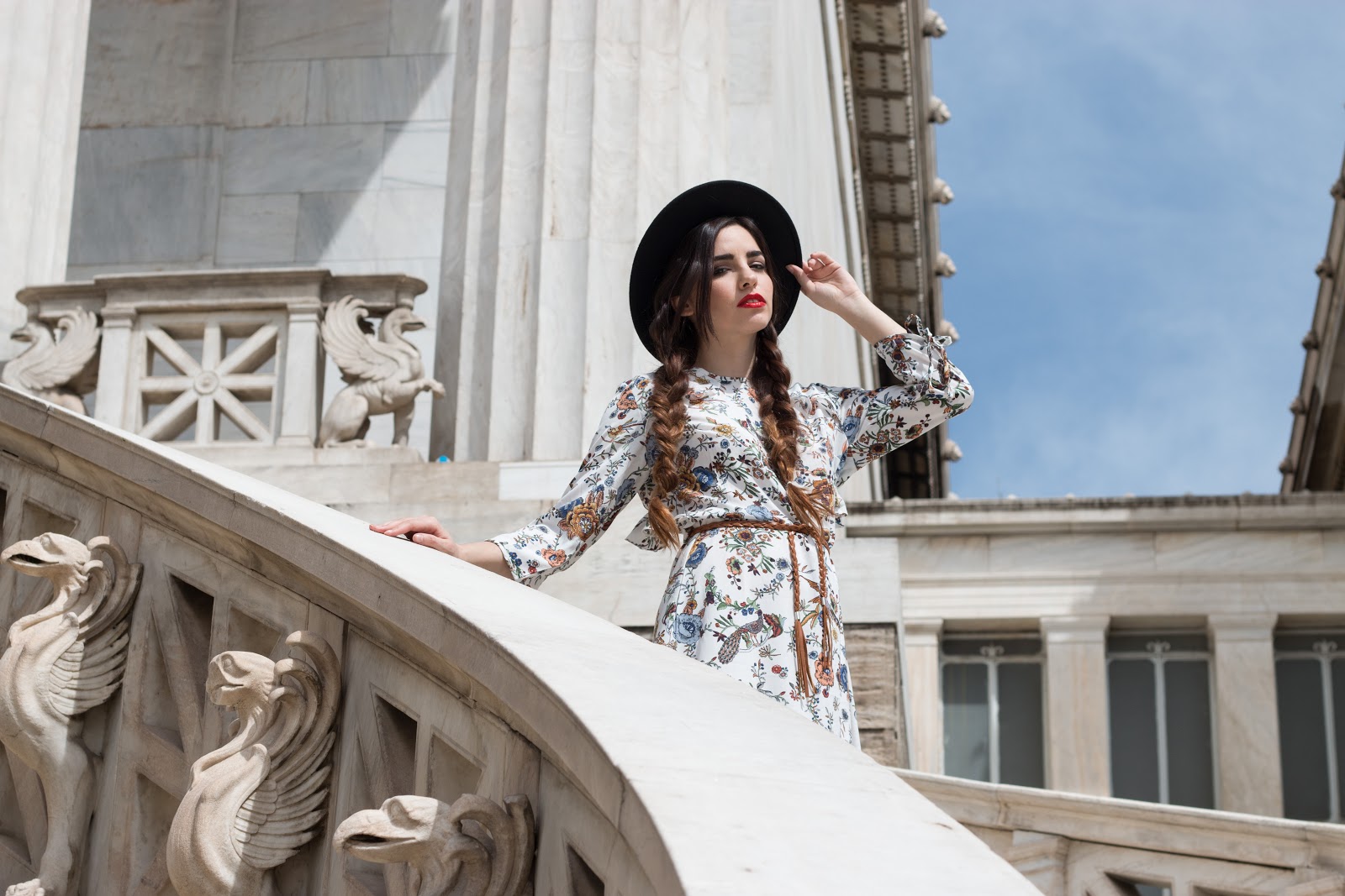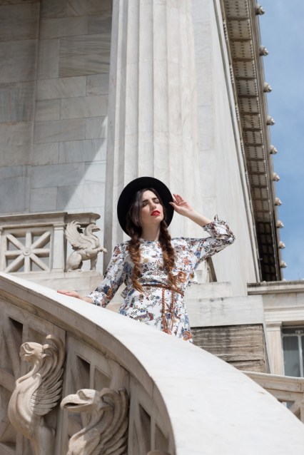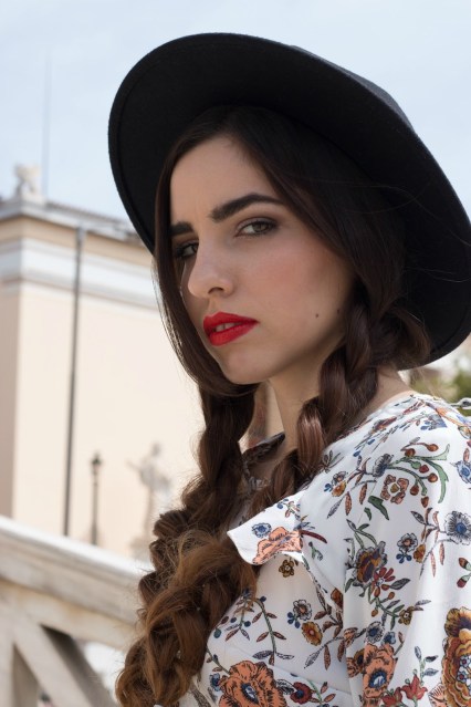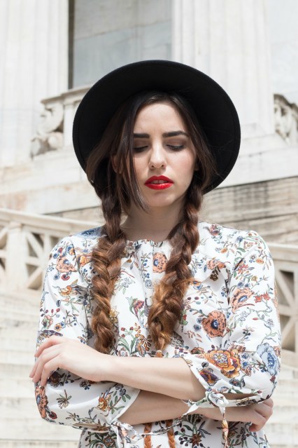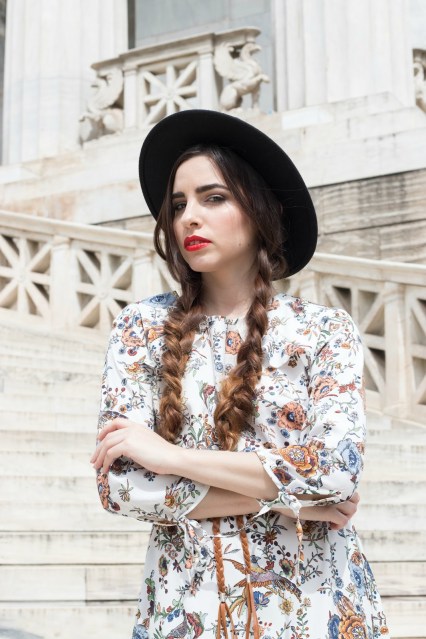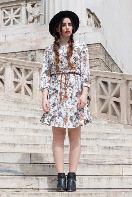 Έχει ως βάση το λευκό χρώμα και το μήκος του είναι μέχρι λίγο πάνω από το γόνατο, για αυτό και είναι άνετο για όλες τις ώρες της ημέρας. Το συνδυάσαμε με μαύρα ankle boots με μέτριο και χοντρό τακούνι που είναι εύκολα στο περπάτημα και με μια λεπτή και πλεχτή σε πλεξούδα ζώνη, σε καφέ χρώμα για να τονίσει την μέση. Ως τελικό αξεσουάρ αλλά και για να κάνει το look πιο ιδιαίτερο επιλέξαμε ένα μαύρο suede καπέλο, που δίνει πιο παιχνιδιάρικη πινελιά και το μετατρέπει αυτόματα σε ένα διαφορετικό outfit.