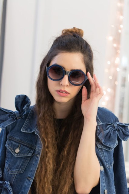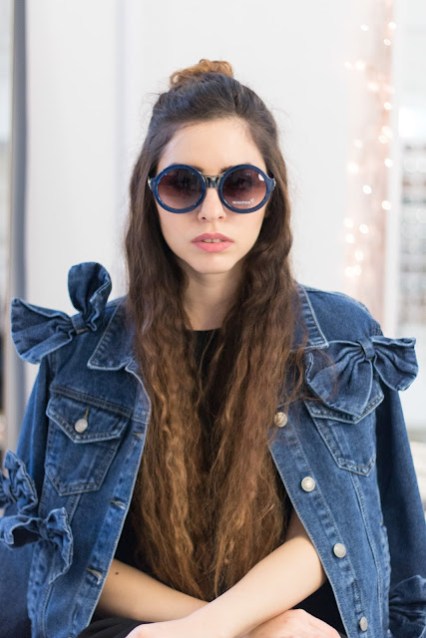 Έχοντας λοιπόν ως βάση το μαύρο φόρεμα, το οποίο έχει κουμπάκια κατά μήκος τις πλάτης, το τελείωμα του είναι βολάν και είναι σε Α γραμμή οπότε είναι πολύ άνετο, επιλέγουμε να το φορέσουμε το πρωί με ένα denim jacket το οποίο έχει ραμμένους φιόγκους παντού και έτσι είναι και πιο παιχνιδιάρικο, και για παπούτσια ένα ζευγάρι flatform floral εσπαντρίγιες. Το μόνο αξεσουάρ που προσθέσαμε και δεν γινόταν να λείπει είναι ένα ζευγάρι γυαλιά ηλίου σε μπλε χρώμα με στρογγυλό σκελετό.
