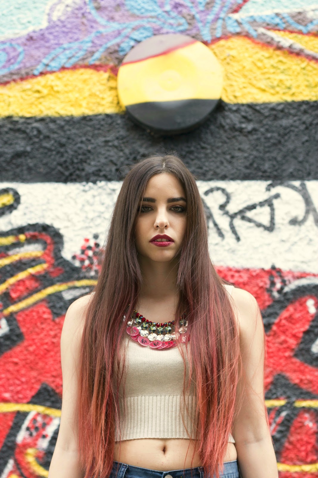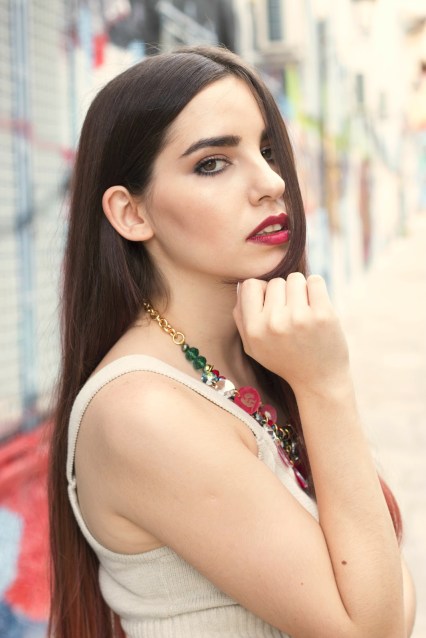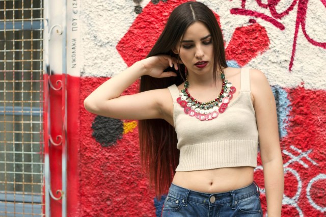 Αυτή η λεπτομέρεια το κάνει πιο παιχνιδιάρικο αλλά και πιο εύκολο στον συνδυασμό του. Σαν top ,επιλέξαμε ένα cropped σε ουδέτερο μπεζ χρώμα ώστε να ταιριάξει με το φανταστικό κόσμημα στον λαιμό από την νέα collection της Maliya, με τίτλο «Nebulae». Είναι σε πράσινες και κόκκινες αποχρώσεις και συμβολίζει τον Υδροχόο, το οποίο είναι και το ζώδιο της Χριστίνας. Για να ολοκληρώσουμε το outfit επιλέξαμε ένα ζευγάρι πλατφόρμες σε athletic γραμμή για να παραμένει στα όρια του street σε μαύρο χρώμα με λευκά κορδόνια.