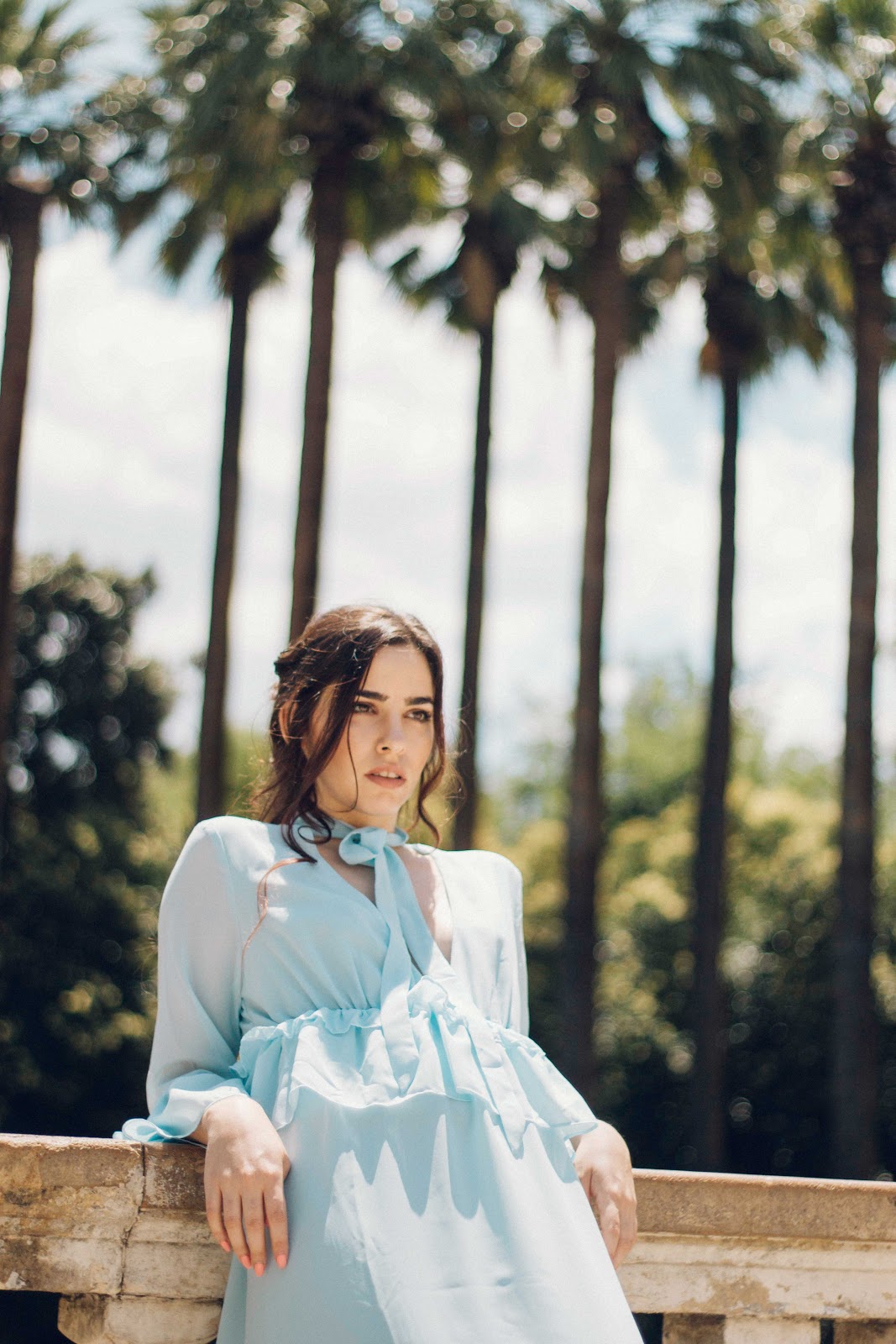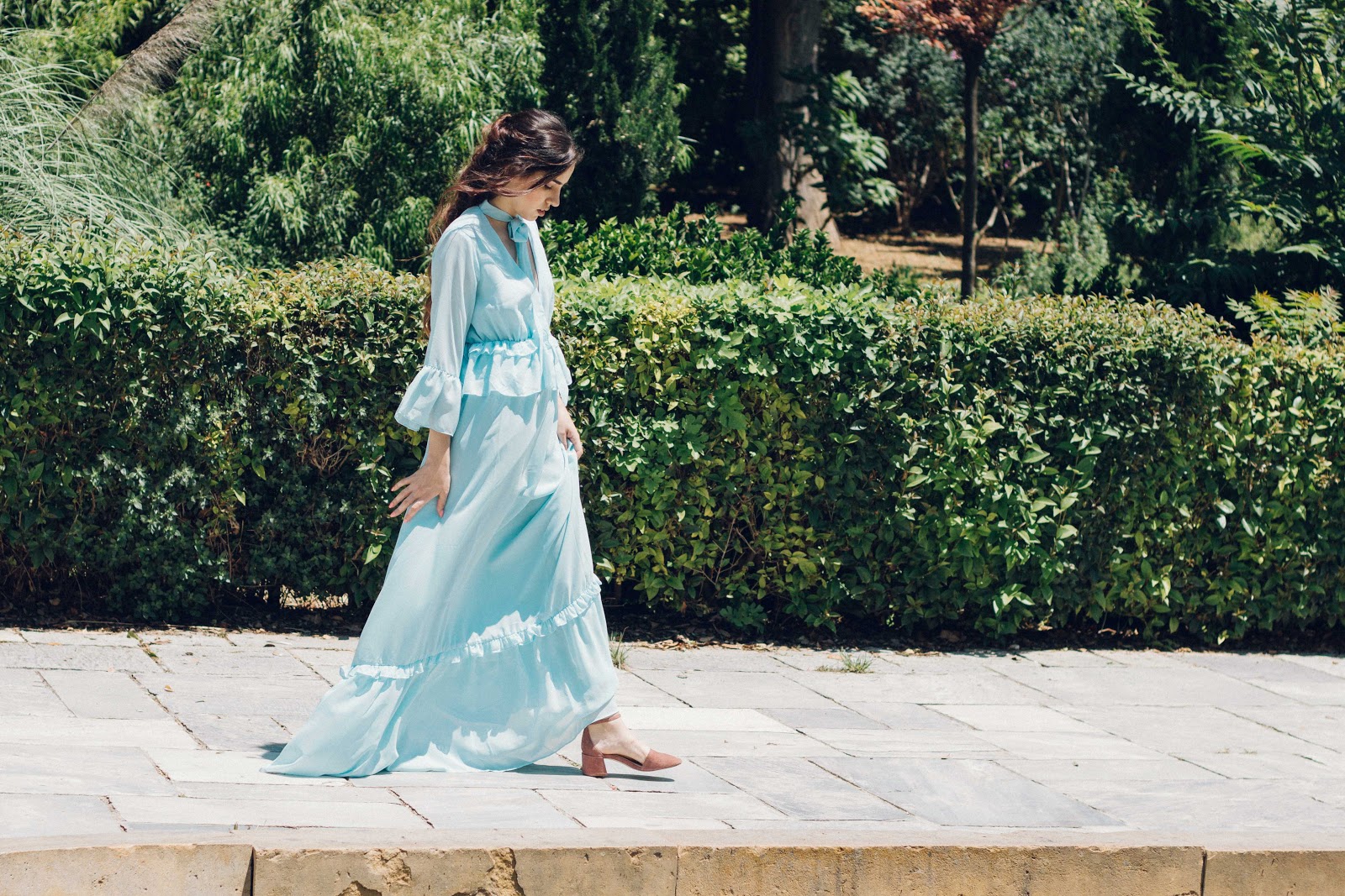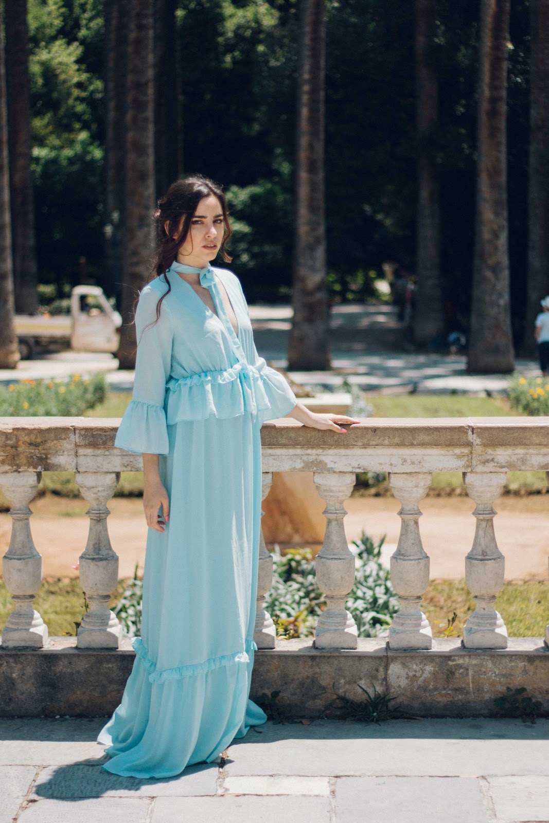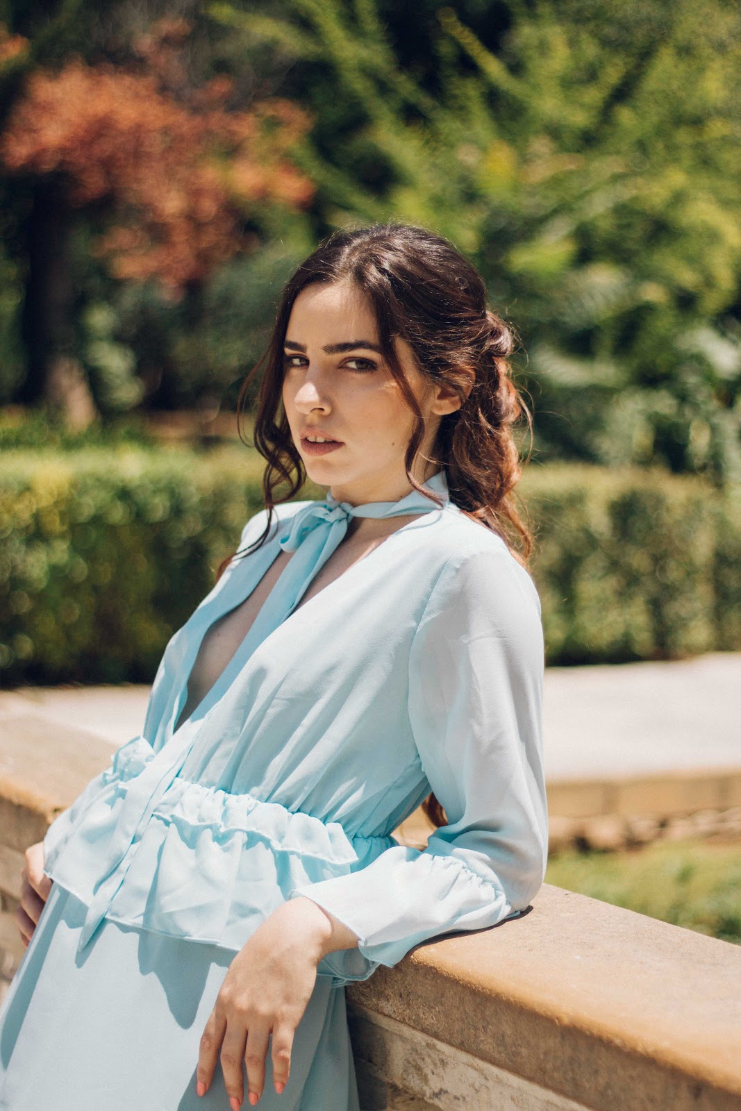 Υπάρχουν κάποιες τάσεις οι οποίες δεν εξαλείφονται ποτέ και πάντα θεωρούνται διαχρονικές και αγαπημένες. Μια από αυτές είναι και οι «βικτωριανές» γραμμές, τα βολάν ,τα φορέματα που μοιάζουν να έχουν έρθει από άλλη εποχή. Ειδικά για όσες αγαπούν το ρομαντικό στυλ, αυτό που θυμίζει τις πριγκίπισσες και θέλουν να το προσαρμόσουν στην σημερινή εποχή, το φόρεμα που φοράει η Χριστίνα σε αυτό το editorial είναι η καλύτερη επιλογή. Maxi φόρεμα σε baby blue ,με βολάν στα μανίκια, στη μέση αλλά και κατά μήκος του φορέματος αλλά και δέσιμο στο λαιμό δίνοντας την ψευδαίσθηση του choker,ενώ το βαθύ του ντεκολτέ το κάνει καθόλου συντηρητικό. Μπορεί να είναι ανάλαφρο και πολύ ρομαντικό, όμως τα βολάν είναι υπεραρκετά και έτσι προτιμήσαμε να μην προσθέσουμε αξεσουάρ. Για παπούτσια επιλέξαμε ένα ζευγάρι σε σκούρο ροζ τακούνια μεσαίου μεγέθους με λουράκι στον αστράγαλο για να ολοκληρώσουμε το «victorian» outfit το οποίο μπορείτε να βρείτε και εσείς σε ένα κατάστημα της Favela.