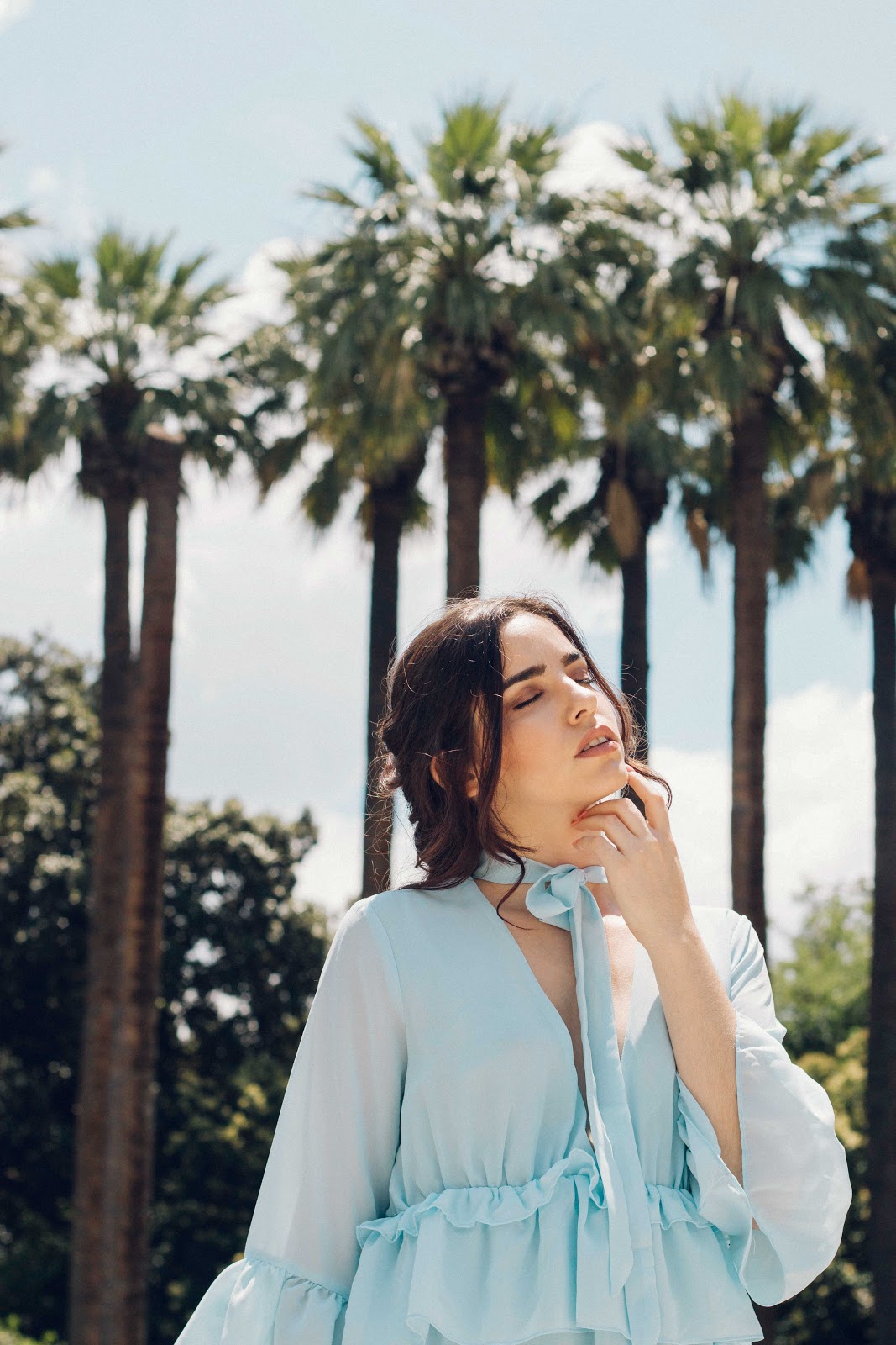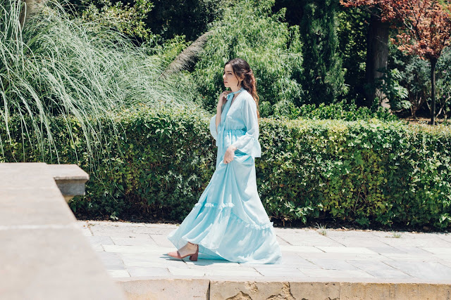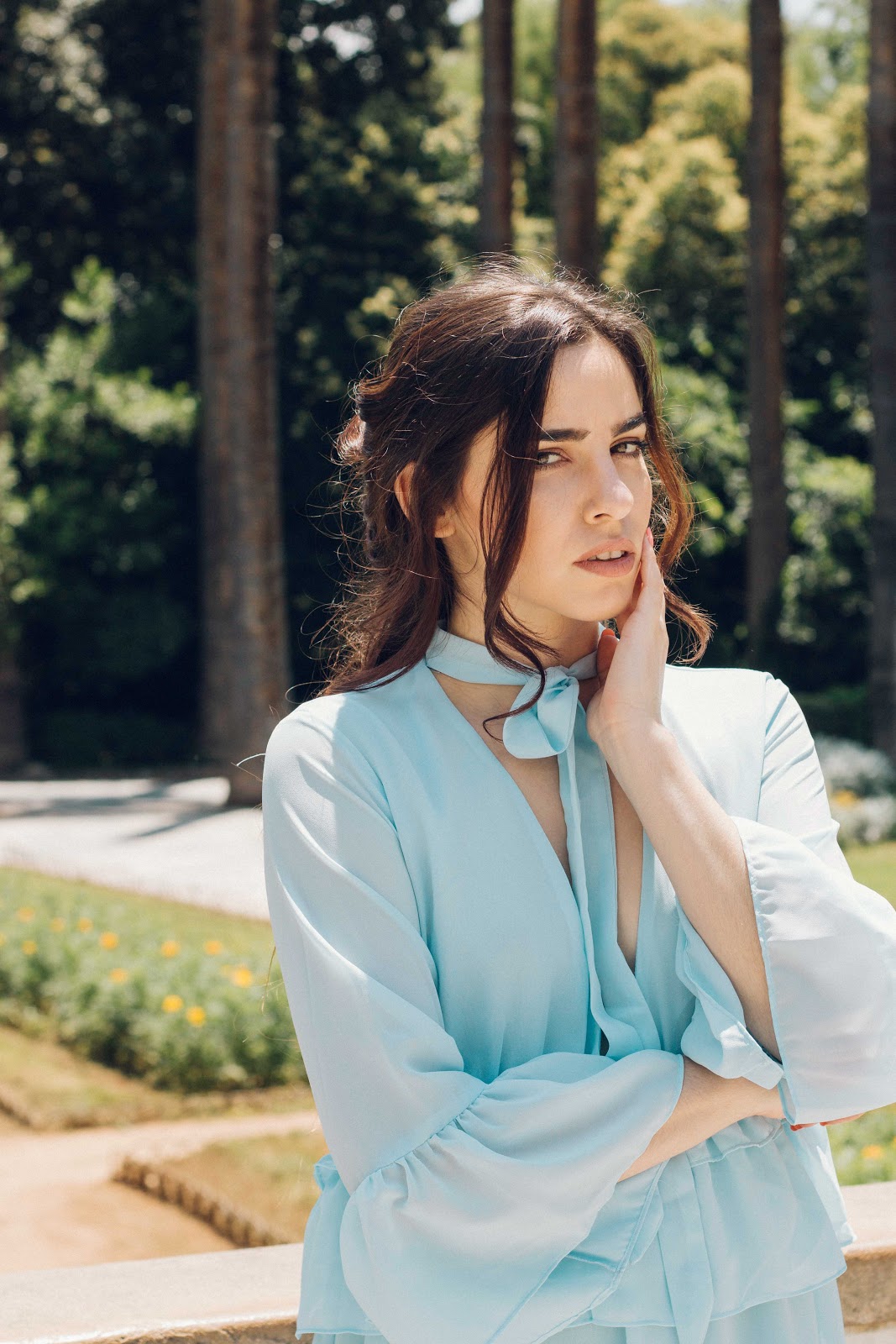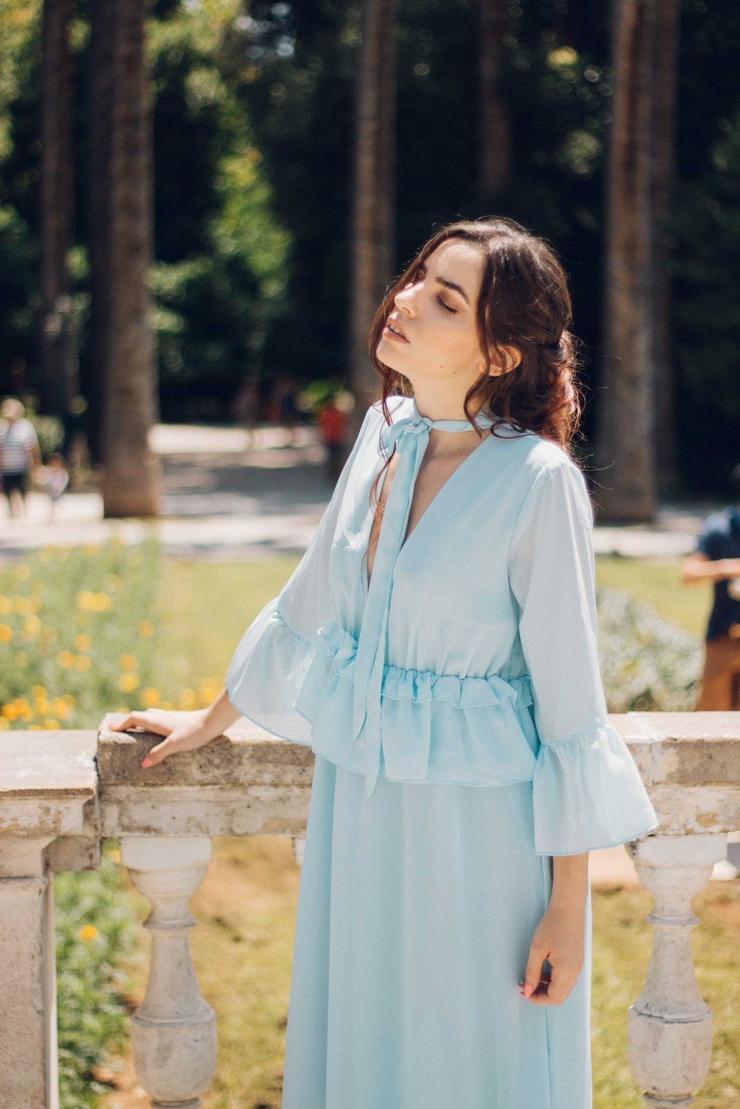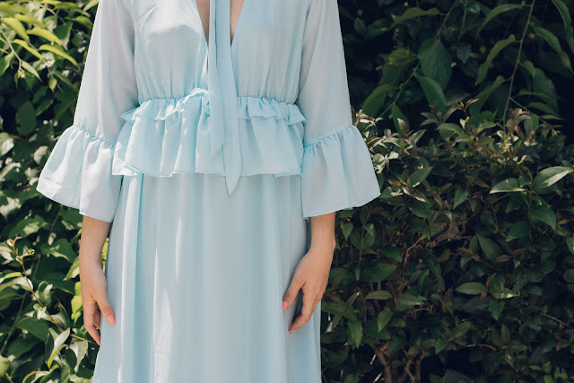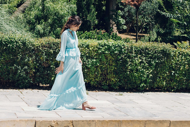 Υπάρχουν κάποιες τάσεις οι οποίες δεν εξαλείφονται ποτέ και πάντα θεωρούνται διαχρονικές και αγαπημένες. Μια από αυτές είναι και οι «βικτωριανές» γραμμές, τα βολάν ,τα φορέματα που μοιάζουν να έχουν έρθει από άλλη εποχή. Ειδικά για όσες αγαπούν το ρομαντικό στυλ, αυτό που θυμίζει τις πριγκίπισσες και θέλουν να το προσαρμόσουν στην σημερινή εποχή, το φόρεμα που φοράει η Χριστίνα σε αυτό το editorial είναι η καλύτερη επιλογή. Maxi φόρεμα σε baby blue ,με βολάν στα μανίκια, στη μέση αλλά και κατά μήκος του φορέματος αλλά και δέσιμο στο λαιμό δίνοντας την ψευδαίσθηση του choker,ενώ το βαθύ του ντεκολτέ το κάνει καθόλου συντηρητικό. Μπορεί να είναι ανάλαφρο και πολύ ρομαντικό, όμως τα βολάν είναι υπεραρκετά και έτσι προτιμήσαμε να μην προσθέσουμε αξεσουάρ. Για παπούτσια επιλέξαμε ένα ζευγάρι σε σκούρο ροζ τακούνια μεσαίου μεγέθους με λουράκι στον αστράγαλο για να ολοκληρώσουμε το «victorian» outfit το οποίο μπορείτε να βρείτε και εσείς σε ένα κατάστημα της Favela.