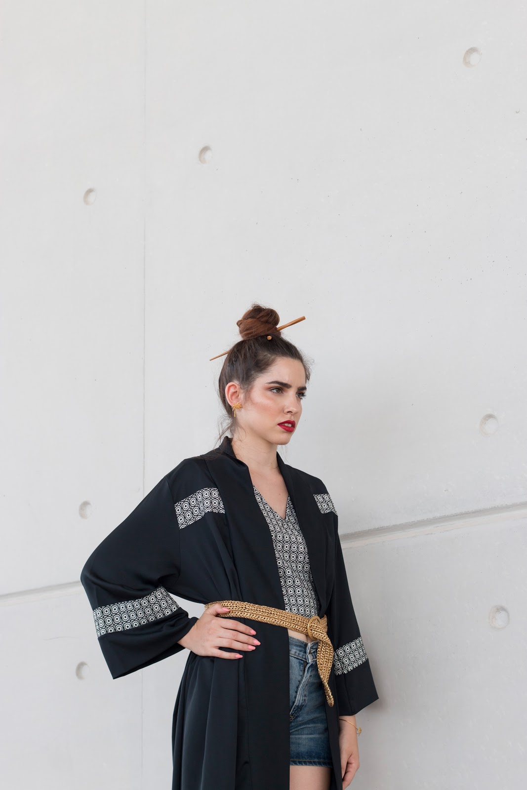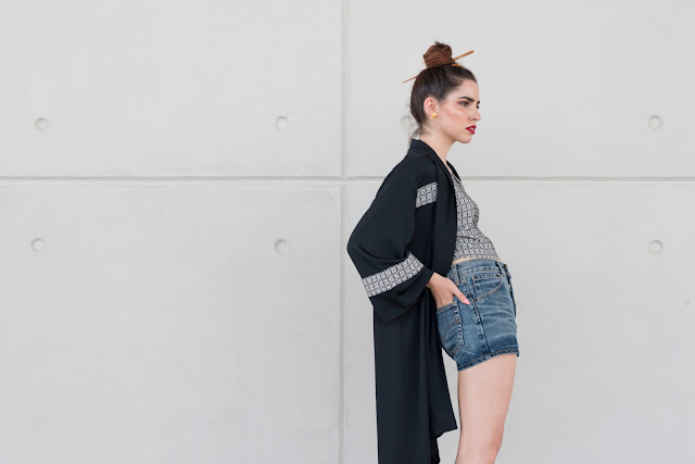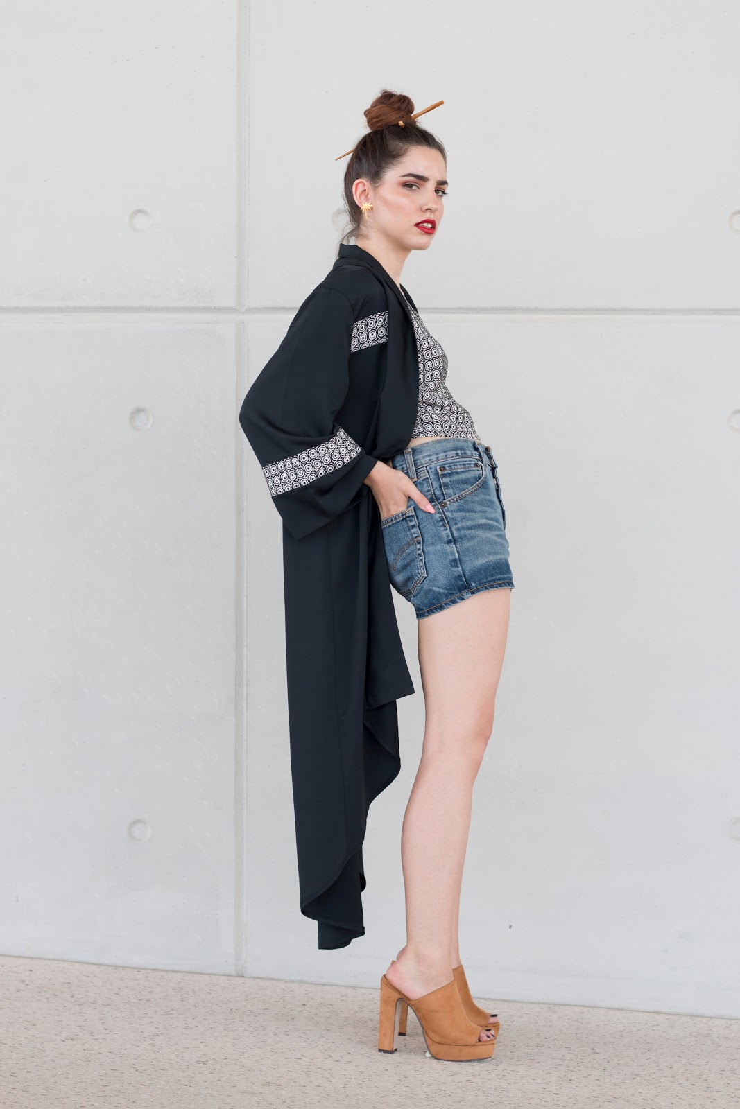Για να το διατηρήσουμε όμως καλοκαιρινό outfit,εμείς επιλέξαμε να το συνδυάσουμε με ένα denim ψηλόμεσο shorts το οποίο έχει την κλασσική γραμμή που όλες θέλουμε να έχουμε στην ντουλάπα μας, μαζί με ένα crop top το οποίο είναι αμάνικο και έχει ίδιο γεωμετρικό μοτίβο με τις λεπτομέρειες του κιμονό. Τα παπούτσια είναι τα αγαπημένα mules σε καφέ χρώμα, τα οποία είναι πολύ άνετα στο περπάτημα τους πάρα το ύψος και δίνουν ένα πιο retro ύφος στο look συνολικά. Τα αξεσουάρ μας επιλέξαμε να είναι πιο minimal,και έτσι φοράει ένα λεπτό bracelet και ένα ζευγάρι σκουλαρίκια σε χρυσό χρώμα με φοίνικες, και έτσι δεν γίνεται να γίνει πιο καλοκαιρινό το outfit.