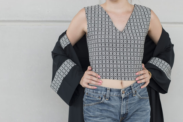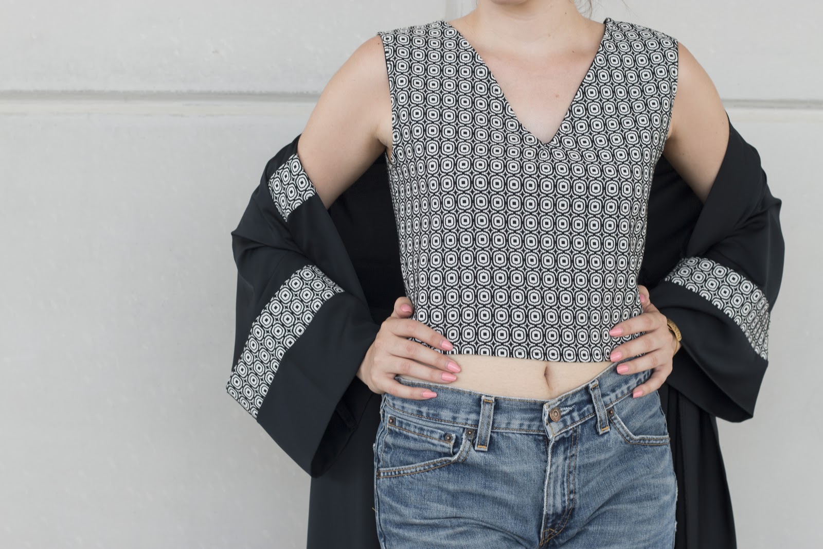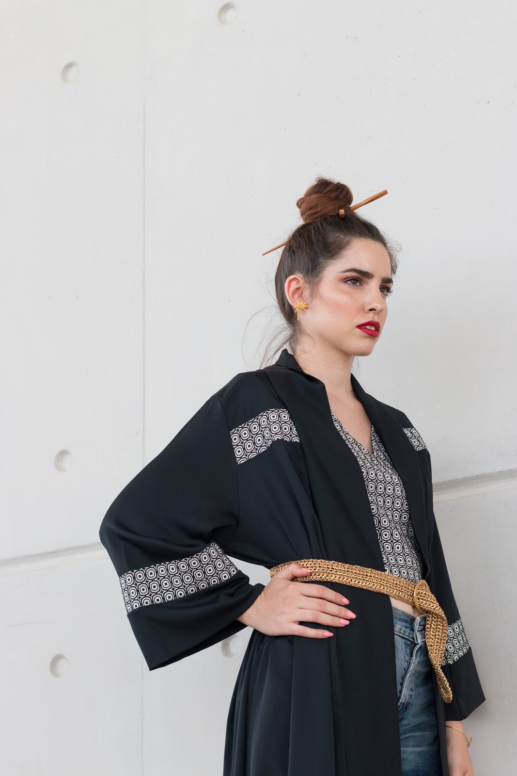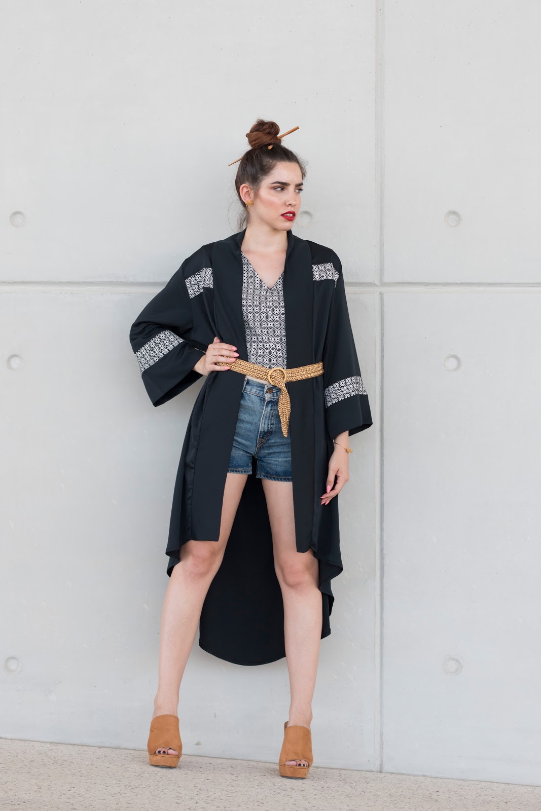 Για να το διατηρήσουμε όμως καλοκαιρινό outfit,εμείς επιλέξαμε να το συνδυάσουμε με ένα denim ψηλόμεσο shorts το οποίο έχει την κλασσική γραμμή που όλες θέλουμε να έχουμε στην ντουλάπα μας, μαζί με ένα crop top το οποίο είναι αμάνικο και έχει ίδιο γεωμετρικό μοτίβο με τις λεπτομέρειες του κιμονό. Τα παπούτσια είναι τα αγαπημένα mules σε καφέ χρώμα, τα οποία είναι πολύ άνετα στο περπάτημα τους πάρα το ύψος και δίνουν ένα πιο retro ύφος στο look συνολικά. Τα αξεσουάρ μας επιλέξαμε να είναι πιο minimal,και έτσι φοράει ένα λεπτό bracelet και ένα ζευγάρι σκουλαρίκια σε χρυσό χρώμα με φοίνικες, και έτσι δεν γίνεται να γίνει πιο καλοκαιρινό το outfit.