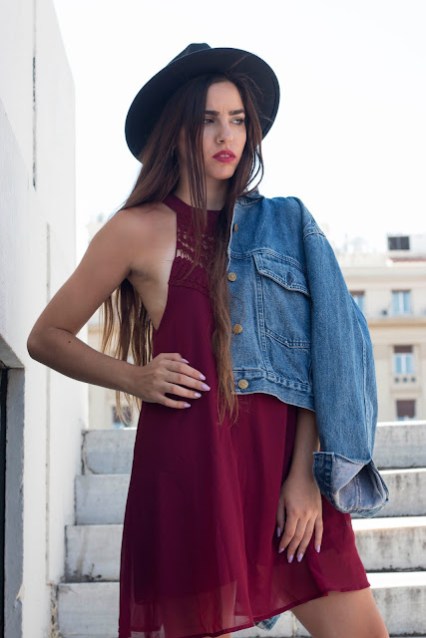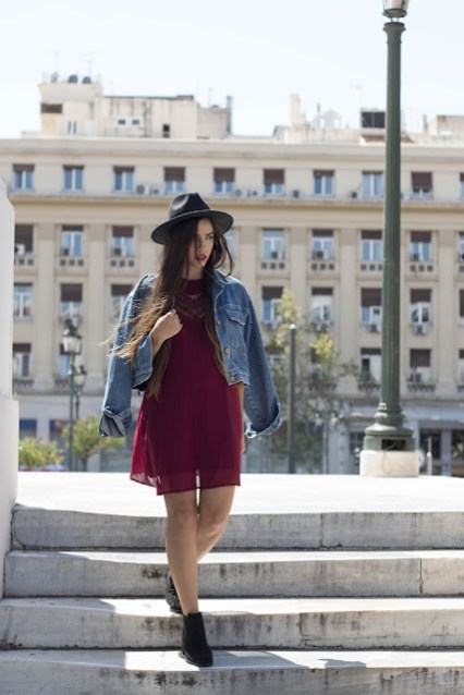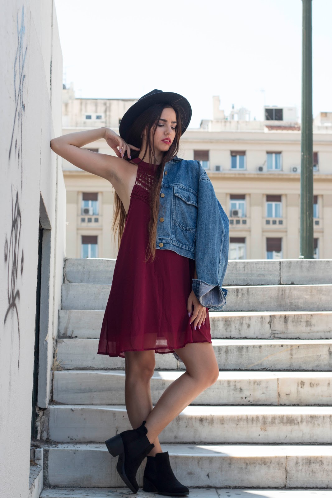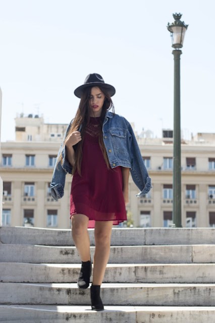 Σε αυτό το editorial,επιλέξαμε ένα ανάλαφρο καλοκαιρινό φόρεμα, το οποίο είναι mini αλλά σε Α γραμμή, με κέντημα στο στήθος σε μπορντώ χρώμα, το οποίο παραπέμπει στον χειμώνα λόγω χρώματος. Το συνδυάσαμε με ένα ζευγάρι ankle boots με μέτριο τακούνι για άνετο περπάτημα και το αγαπημένο μας denim jacket.Αυτό που το κάνει πιο ιδιαίτερο είναι καταρχήν πως είναι το jacket του μπαμπά μας ,και έτσι είναι vintage.( Αν τύχει και δεις το post μπαμπά, σε ευχαριστούμε πολύ .)Σαν γραμμή, αυτό που λατρεύουμε πέρα από το χρώμα του, είναι η φαρδιά γραμμή του σε συνδυασμό με το μεσάτο του τελείωμα, και έτσι δίνει έμφαση εκεί. Η τελευταία μας πινελιά ήταν το καπέλο που δίνει άλλο αέρα στο outfit και είναι κατάλληλο και για τις ηλιόλουστες μέρες, ενώ το μόνο αξεσουάρ είναι ένα ζευγάρι διακριτικά σκουλαρίκια σε χρυσή απόχρωση.
