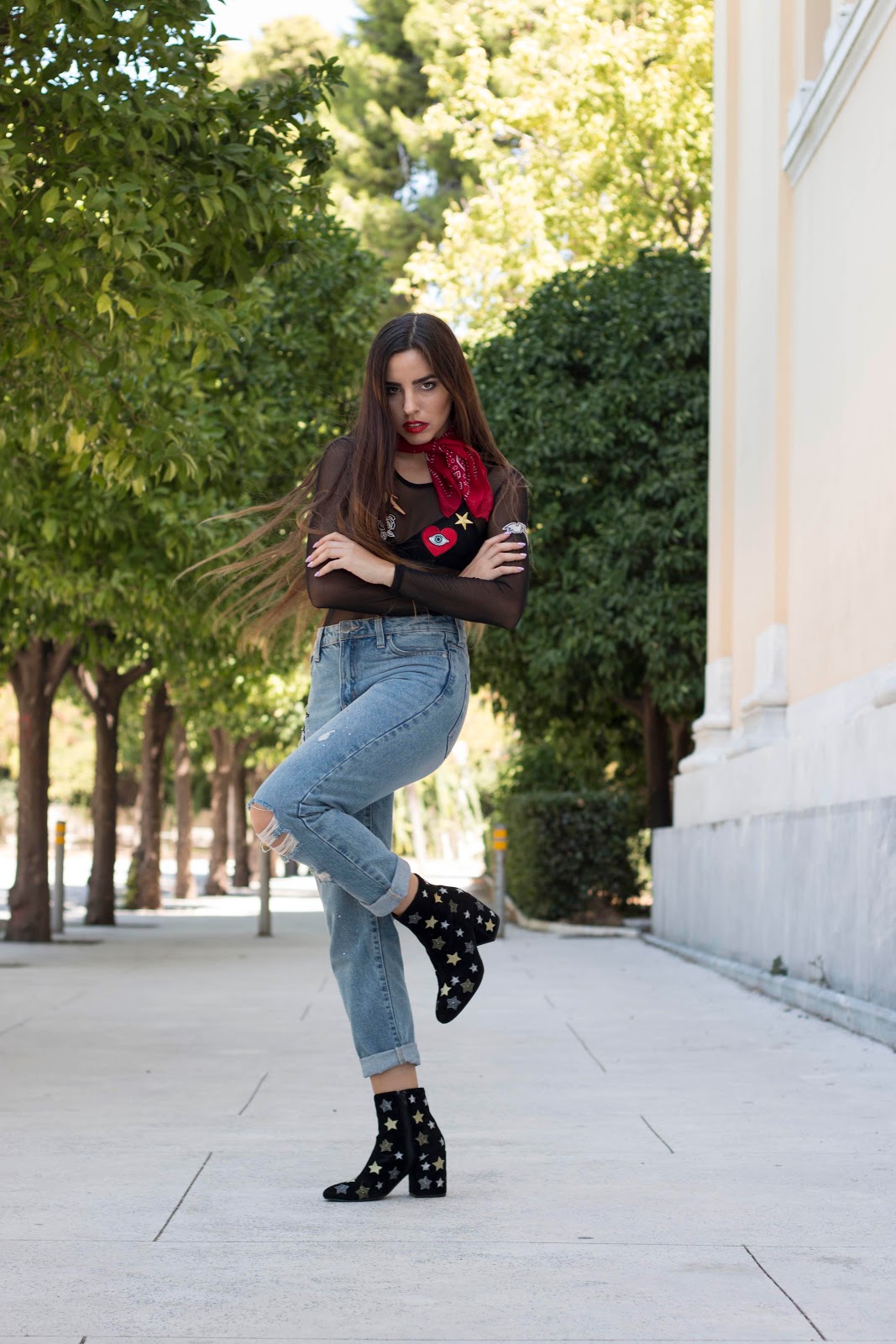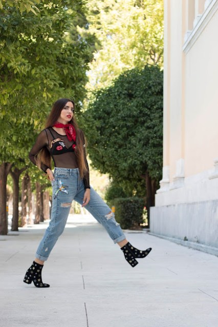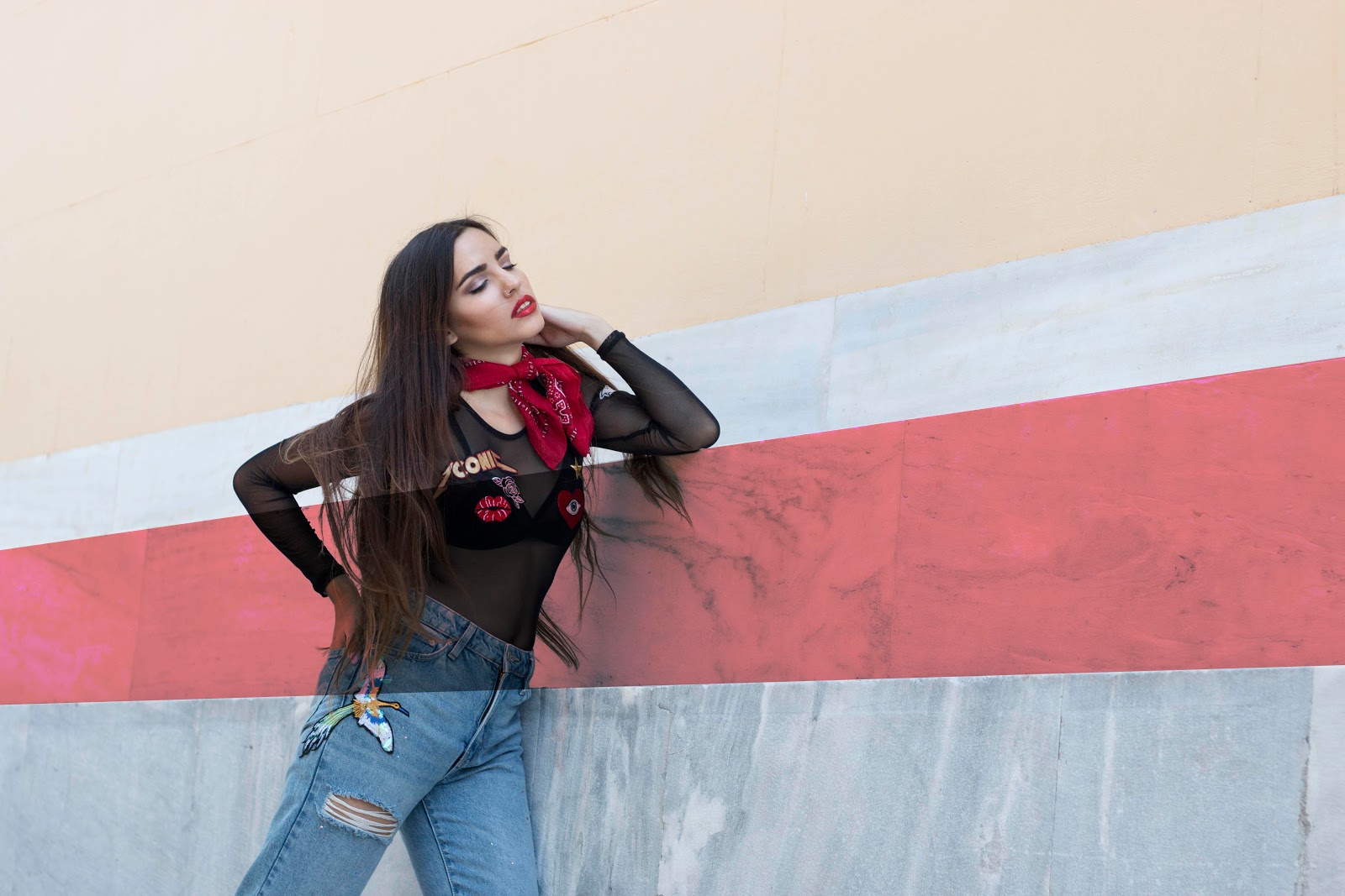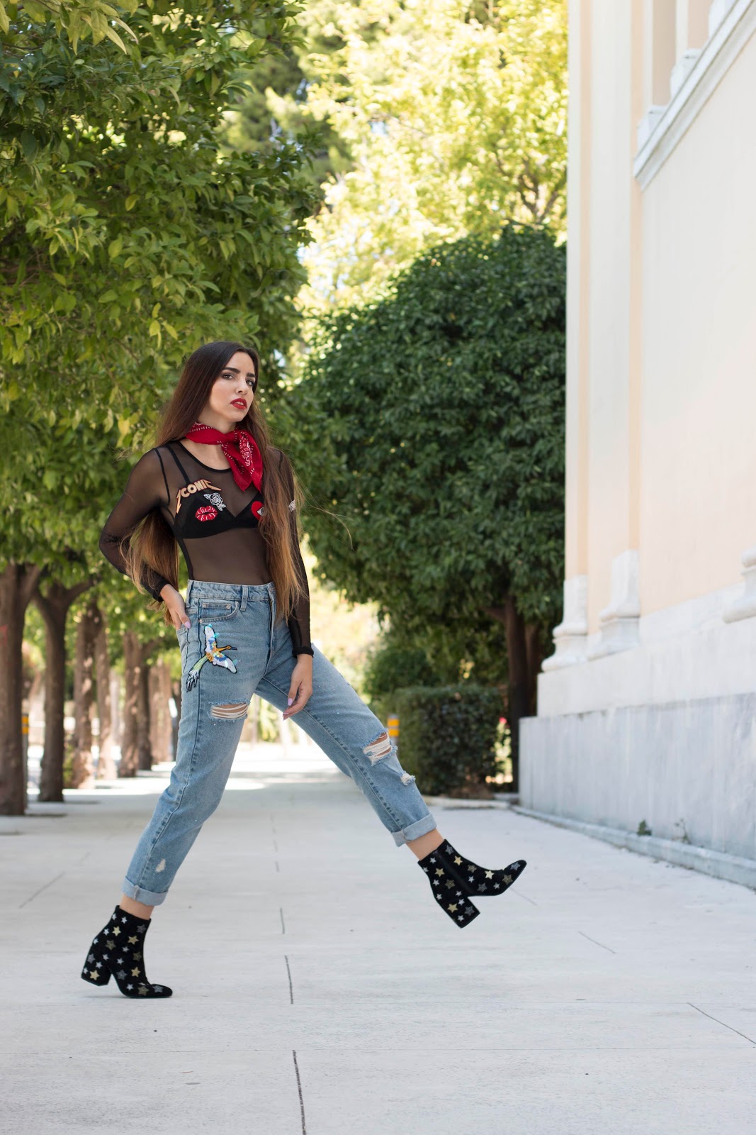 Το κορμάκι έχει τον τέλειο συνδυασμό αφού τα logos που έχει ραμμένα πάνω του και τα χρώματα το κάνουν πιο παιχνιδιάρικο παρά την διαφάνεια – ακόμα περισσότερο αν συνδυαστεί με ένα bralette που θυμίζει κάτι σε εφηβεία. Τα παπούτσια είναι ένα ζευγάρι ankle boots σε μαύρο χρώμα με χρυσά και ασημένια αστέρια κάνοντας ακόμα πιο 80’s groove το στυλ ενώ χάρη σε αυτά δεν χρειάζεται να προσθέσουμε αξεσουάρ αφού είναι έντονα από μόνα τους. Το μόνο που φορέσαμε είναι ένα κόκκινο μαντήλι στο λαιμό το οποίο είναι must item για να αναβαθμίσεις ένα look.