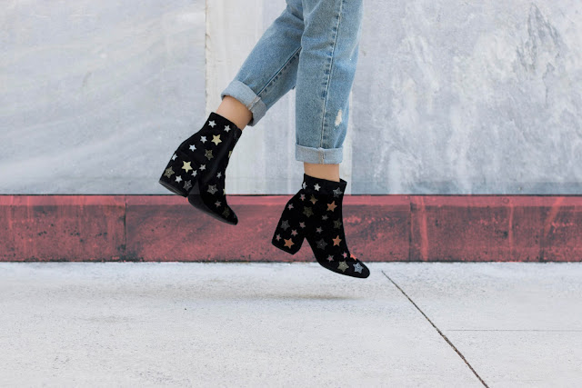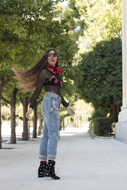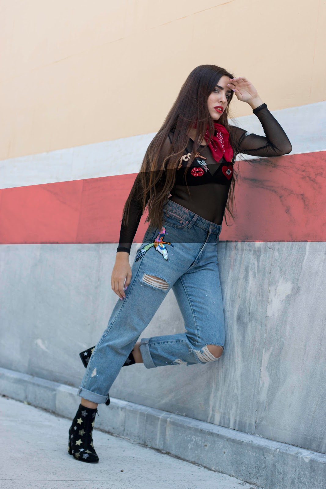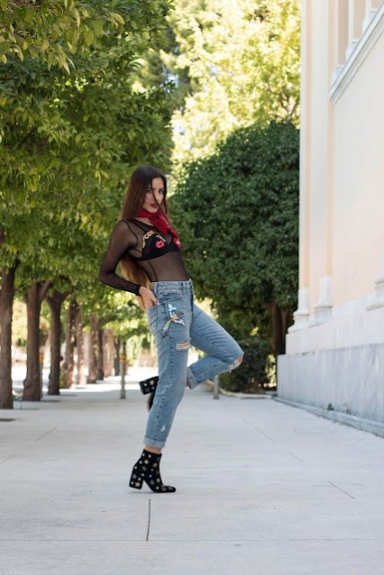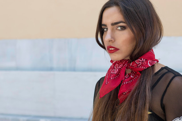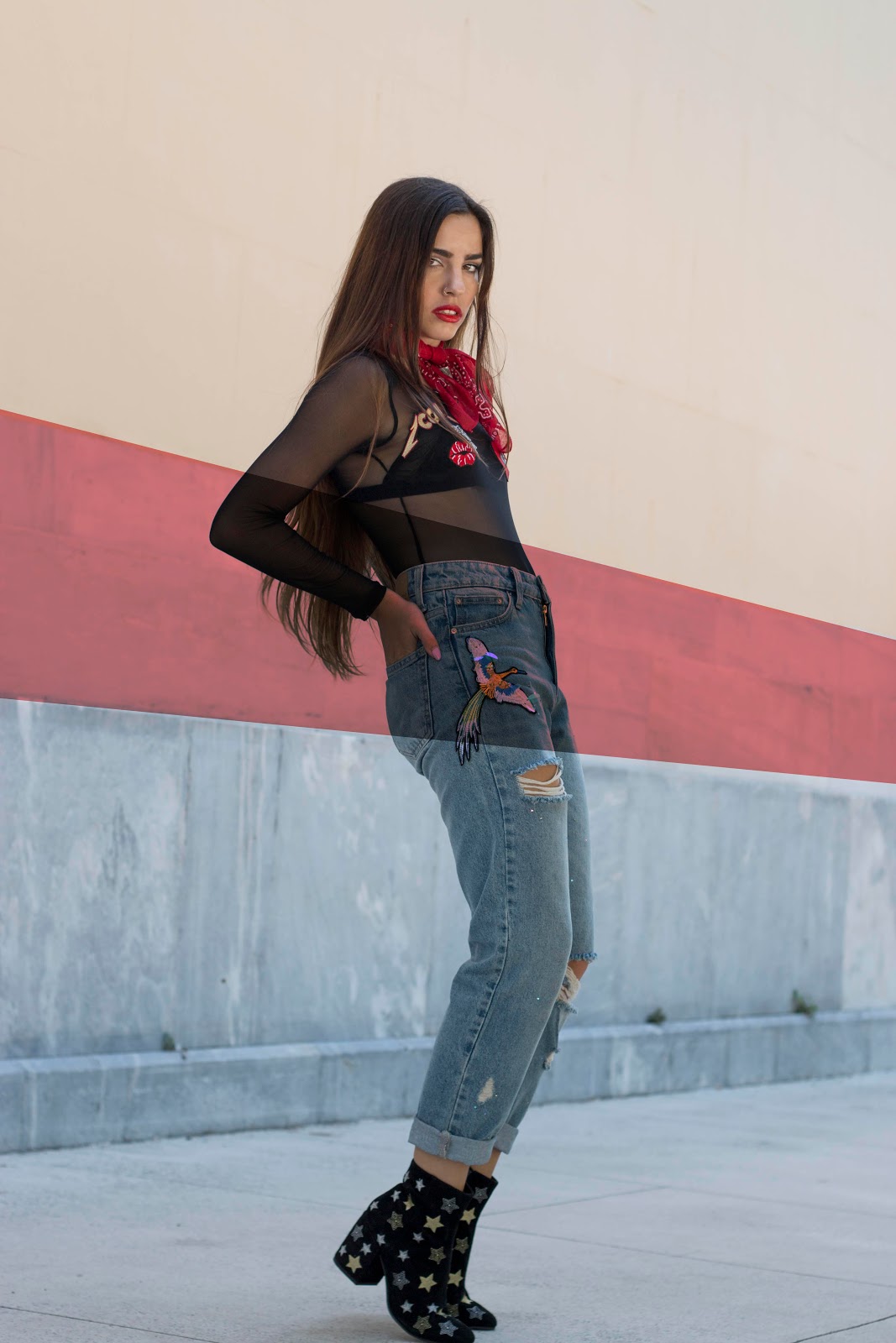 Το κορμάκι έχει τον τέλειο συνδυασμό αφού τα logos που έχει ραμμένα πάνω του και τα χρώματα το κάνουν πιο παιχνιδιάρικο παρά την διαφάνεια – ακόμα περισσότερο αν συνδυαστεί με ένα bralette που θυμίζει κάτι σε εφηβεία. Τα παπούτσια είναι ένα ζευγάρι ankle boots σε μαύρο χρώμα με χρυσά και ασημένια αστέρια κάνοντας ακόμα πιο 80’s groove το στυλ ενώ χάρη σε αυτά δεν χρειάζεται να προσθέσουμε αξεσουάρ αφού είναι έντονα από μόνα τους. Το μόνο που φορέσαμε είναι ένα κόκκινο μαντήλι στο λαιμό το οποίο είναι must item για να αναβαθμίσεις ένα look.