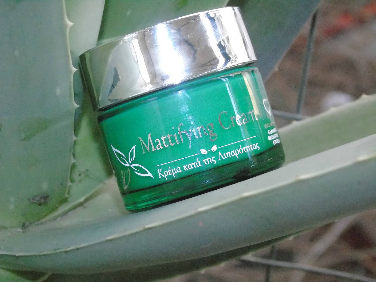 Συνεχίζοντας, το δεύτερο βήμα είναι να εφαρμόσω την κρέμα που θα ενυδατώσει σε βάθος το πρόσωπο μου, χωρίς όμως να ευνοήσει την λιπαρότητα η οποία καραδοκεί και με κάθε ευκαιρία ξεπερνάει το όριο δημιουργώντας πολλές γυαλάδες. Η mattifying cream με εκχύλισμα τσουκνίδας υπόσχεται τον έλεγχο της λιπαρότητας χωρίς όμως να αφυδατώνει την επιδερμίδα. Είναι αρκετά ελαφριά σαν σύνθεση, με διακριτικό άρωμα και σχετικά συμπυκνωμένη υφή και έτσι δεν χρειάζεται μεγάλη ποσότητα στην κάθε εφαρμογή. Την χρησιμοποίησα και ως βάση πριν απο το μακιγιάζ μου αλλά και σκέτη, και ρυθμίζει όντως την έκκριση σμήγματος, διατηρεί το πρόσωπο μου λαμπερό αλλά όσο πρέπει ,και όχι περισσότερο.