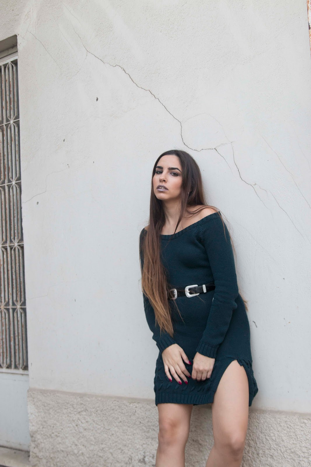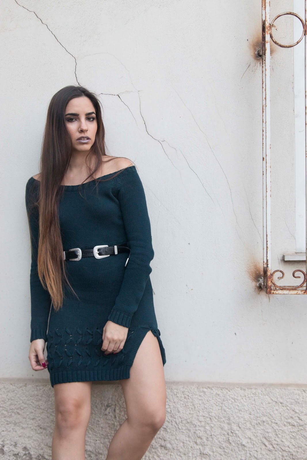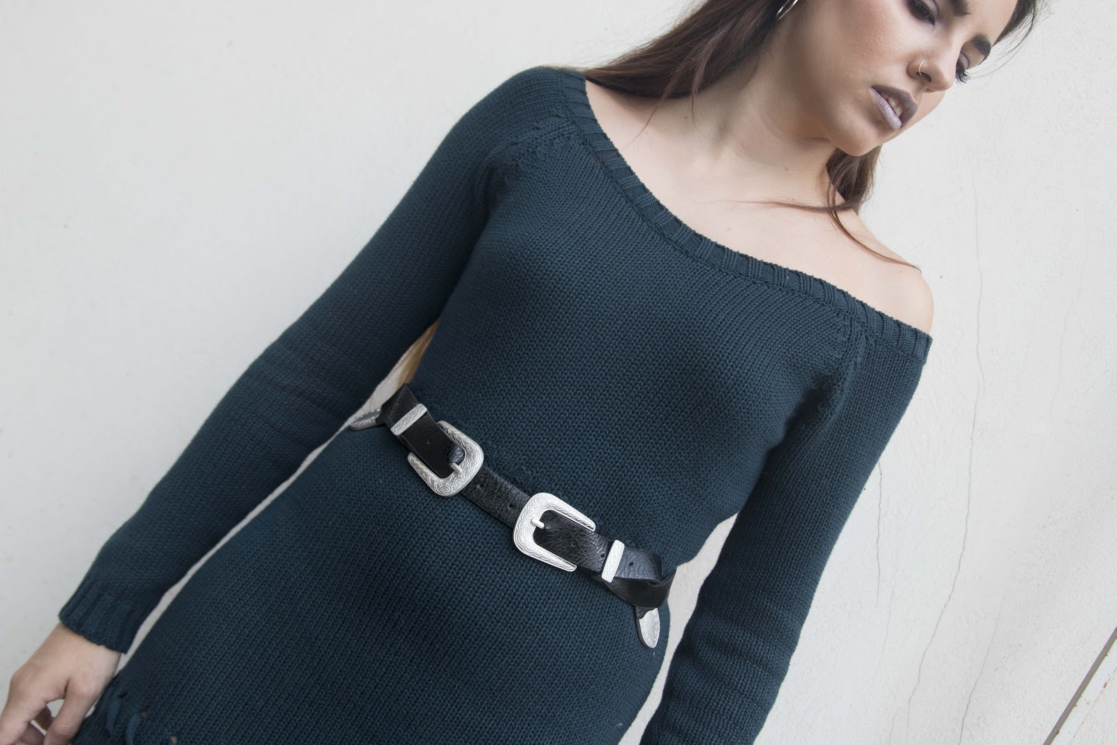 Επέλεξα λοιπόν ένα φόρεμα σε petrol χρώμα, και off-shoulder το οποίο κολακεύει τους ώμους, και με σκίσιμο στο πόδι για ακόμα πιο feminine και sexy αποτέλεσμα. Για να τονίσω την μέση μιας και το φόρεμα δεν αγκαλιάζει το σώμα μου, επέλεξα μια μαύρη ζώνη με δύο αγκράφες που αυτόματα την κάνουν πολύ διαφορετική από μια κλασσική ζώνη, ενώ αξεσουάρ φόρεσα μόνο ένα ζευγάρι ασημένιους κρίκους σε μεσαίο μέγεθος.