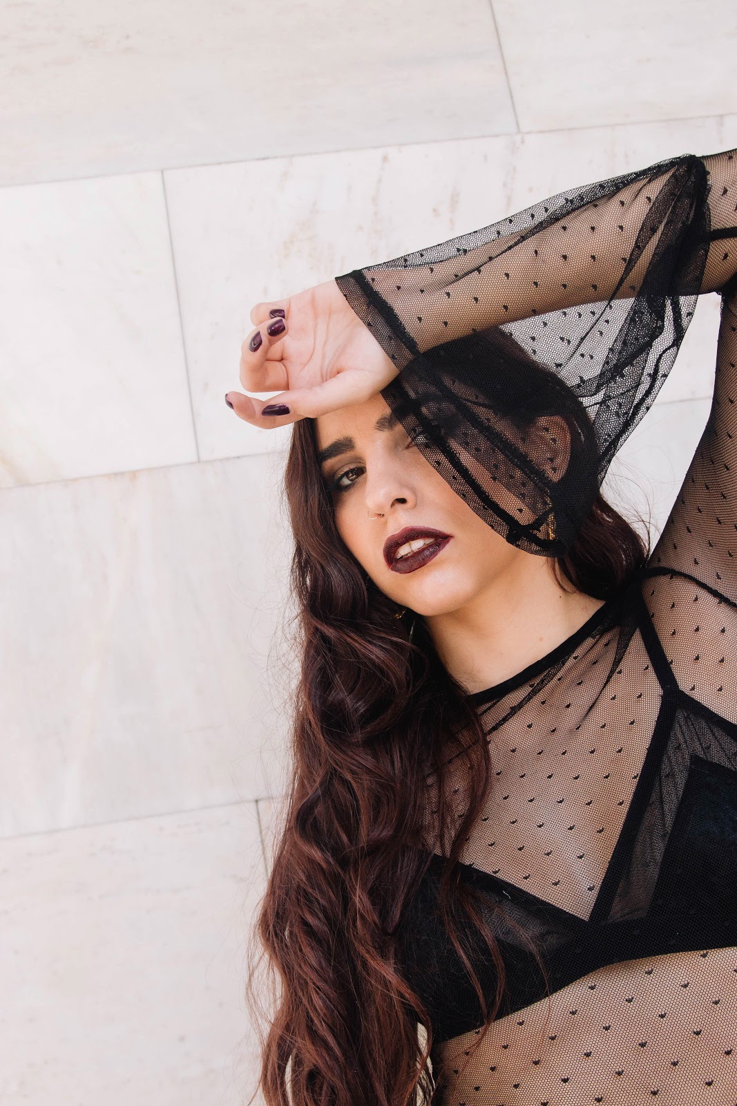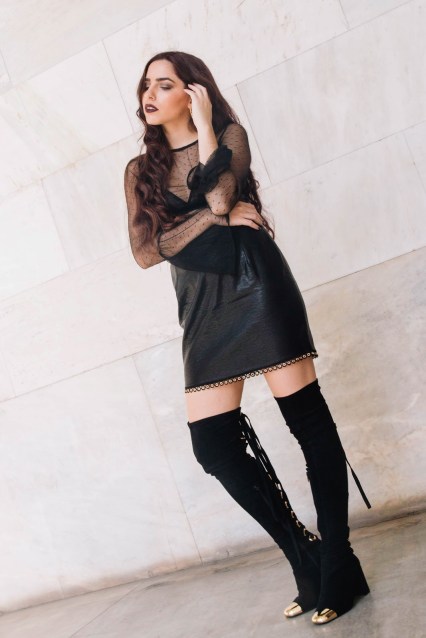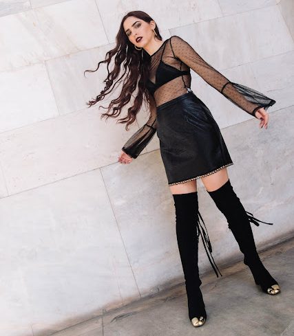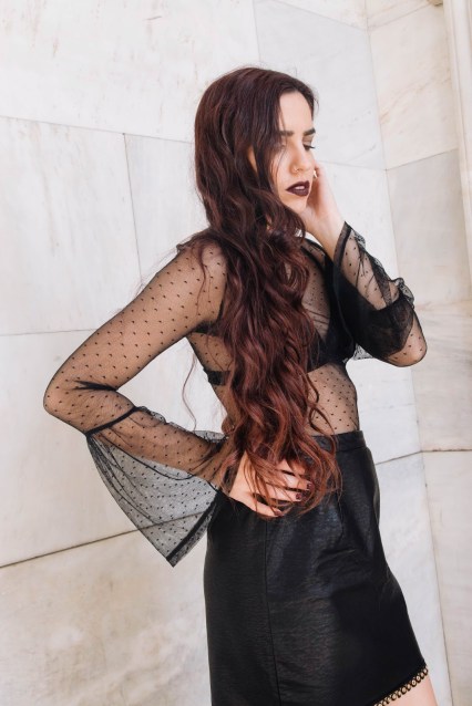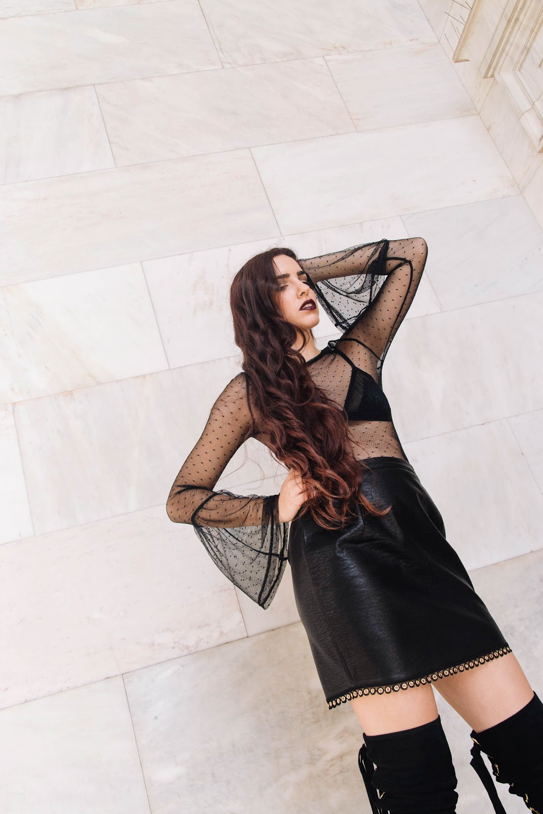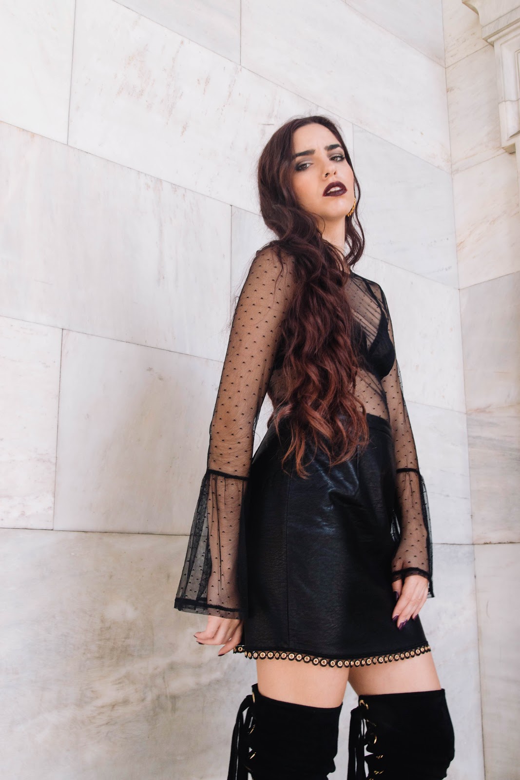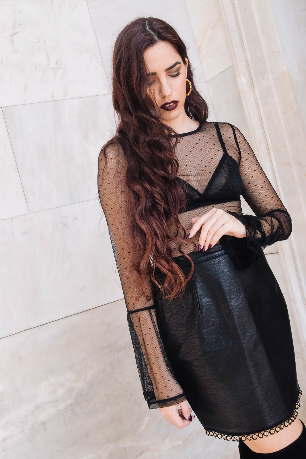 Τελευταίο editorial για το 2017 και είναι ένα outfit πρόταση για την βραδιά του Ρεβεγιόν. Έχοντας ως βάση το αγαπημένο και κλασσικό μαύρο χρώμα, προτίμησα να «παίξω» με υφές και patterns,αφού συνδύασα μια μαύρη δερμάτινη ψηλόμεση φούστα σε Α γραμμή με χρυσές λεπτομέρειες στο τελείωμα της, με ένα διάφανο top,με μικρές καρδούλες σαν μοτίβο και μανίκια που φαρδαίνουν κοντά στον καρπό.