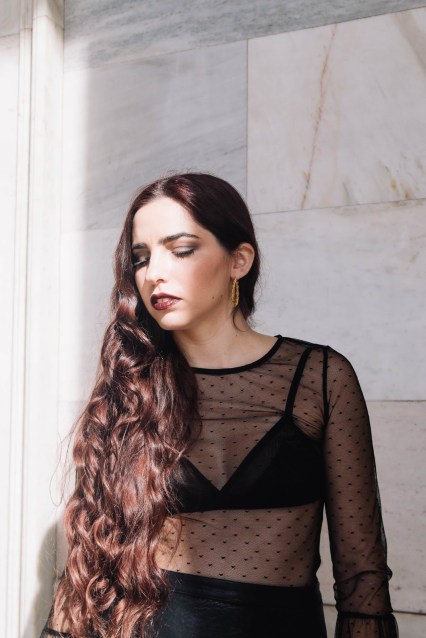 Οι συγκεκριμένες έχουν μετρίου ύψους χοντρό τακούνι και έτσι περπατώ εύκολα και πιο ξεκούραστα, μεταλλική λεπτομέρεια στα δάχτυλα των ποδιών και στο πίσω μέρος δίνει την αίσθηση του κορσέ με τα κορδόνια, έχοντας την δυνατότητα να τις σφίξω όσο χρειάζεται. Το μόνο αξεσουάρ που πρόσθεσα είναι μεσαίου μεγέθους χρυσούς κρίκους και έδωσα έμφαση στα χείλη με πολύ σκούρο κραγιόν.