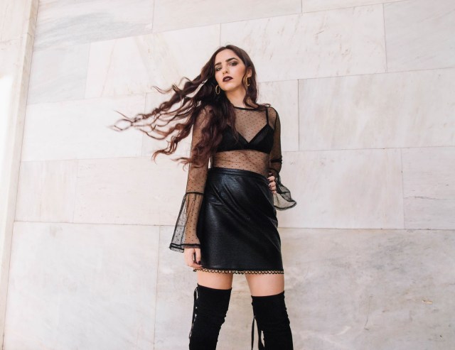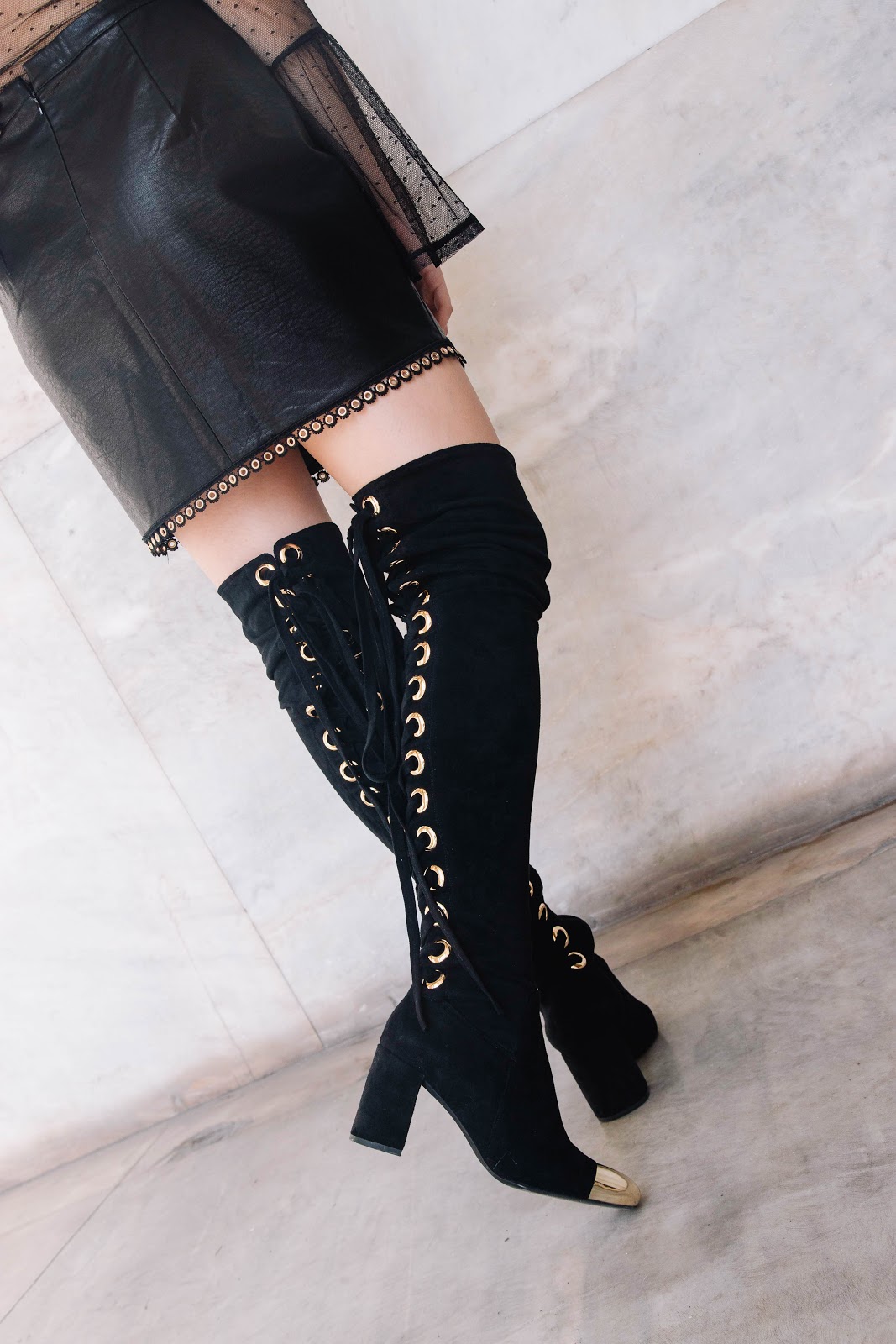 Για να δώσει ένα πιο εφηβικό style στην διαφάνεια της μπλούζας φόρεσα από μέσα ένα μαύρο bralette σε τριγωνικό σχήμα αντί για σουτιέν. Επειδή δεν συμπαθώ πολύ την ιδέα του καλσόν, σκέφτηκα εναλλακτικά να φορέσω over the knee μπότες για να καλύψω το μεγαλύτερο μέρος του ποδιού μου και έτσι να τα κρατήσω όσο πιο ζεστά γίνεται.