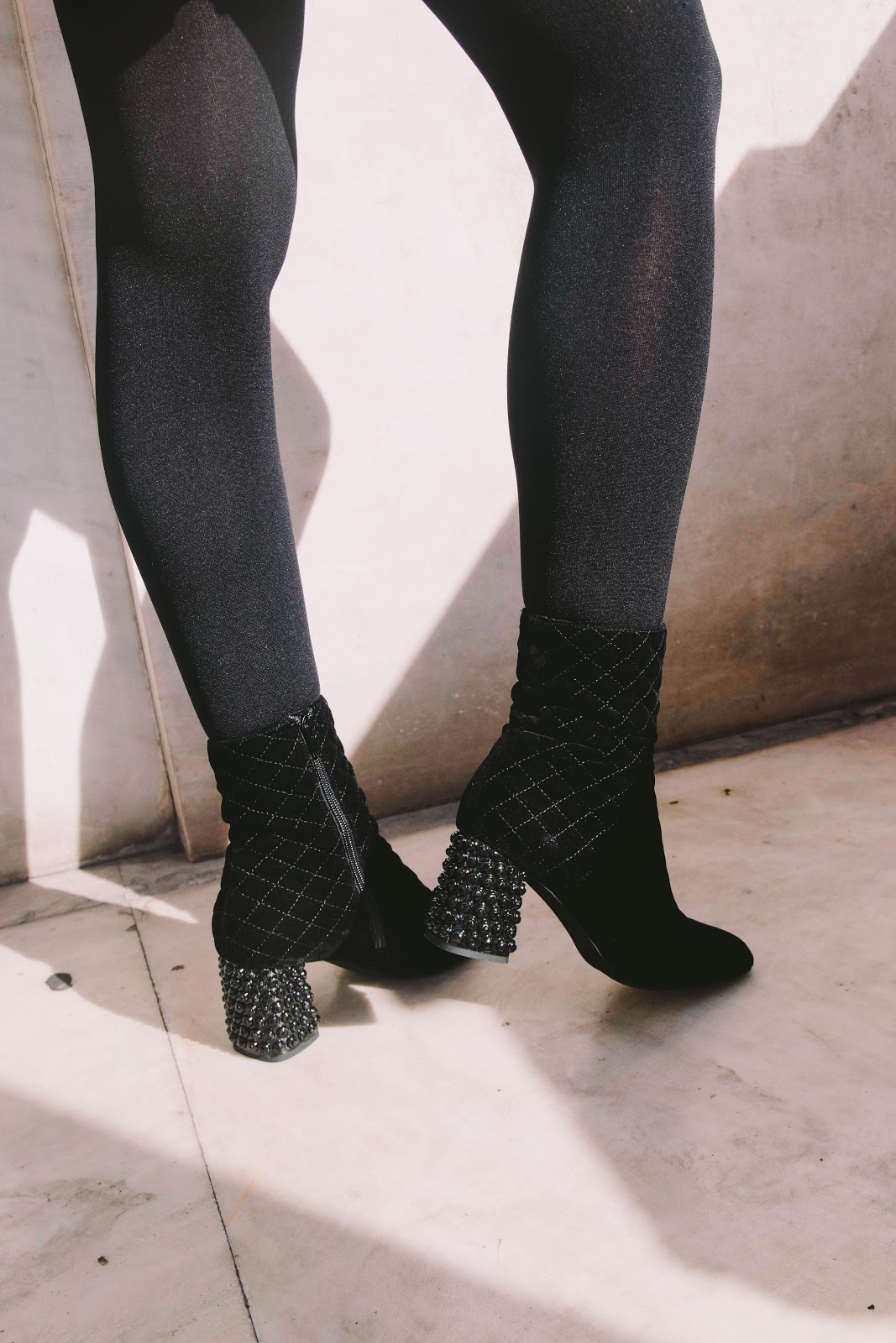 Η αέρινη γραμμή του ειδικά στο κάτω μέρος, το κάνει πιο παιχνιδιάρικο και ρομαντικό και το λάστιχο στη μέση τονίζει το σώμα κάνοντας το σορτς πιο θηλυκό. Επειδή είναι αρκετά κοντό και θα ήθελα να διατηρήσω το χειμωνιάτικο χαρακτήρα του αλλά και να κινούμαι πιο άνετα, το συνδύασα με ένα μαύρο opac καλσόν, ώστε να μην φαίνεται η επιδερμίδα μου αλλά να κολακεύει τα πόδια μου και να παραμένω ζεστή. Για να δώσω την εντύπωση του ενιαίου, φόρεσα μαύρα βελουτέ μποτάκια αστραγάλου, με λεπτομέρειες στο τακούνι που το κάνουν ιδιαίτερο, ενώ για αξεσουάρ προτίμησα ένα ζευγάρι κρεμαστά σκουλαρίκια σε χάλκινη απόχρωση που δίνουν όση λάμψη χρειάζεται.