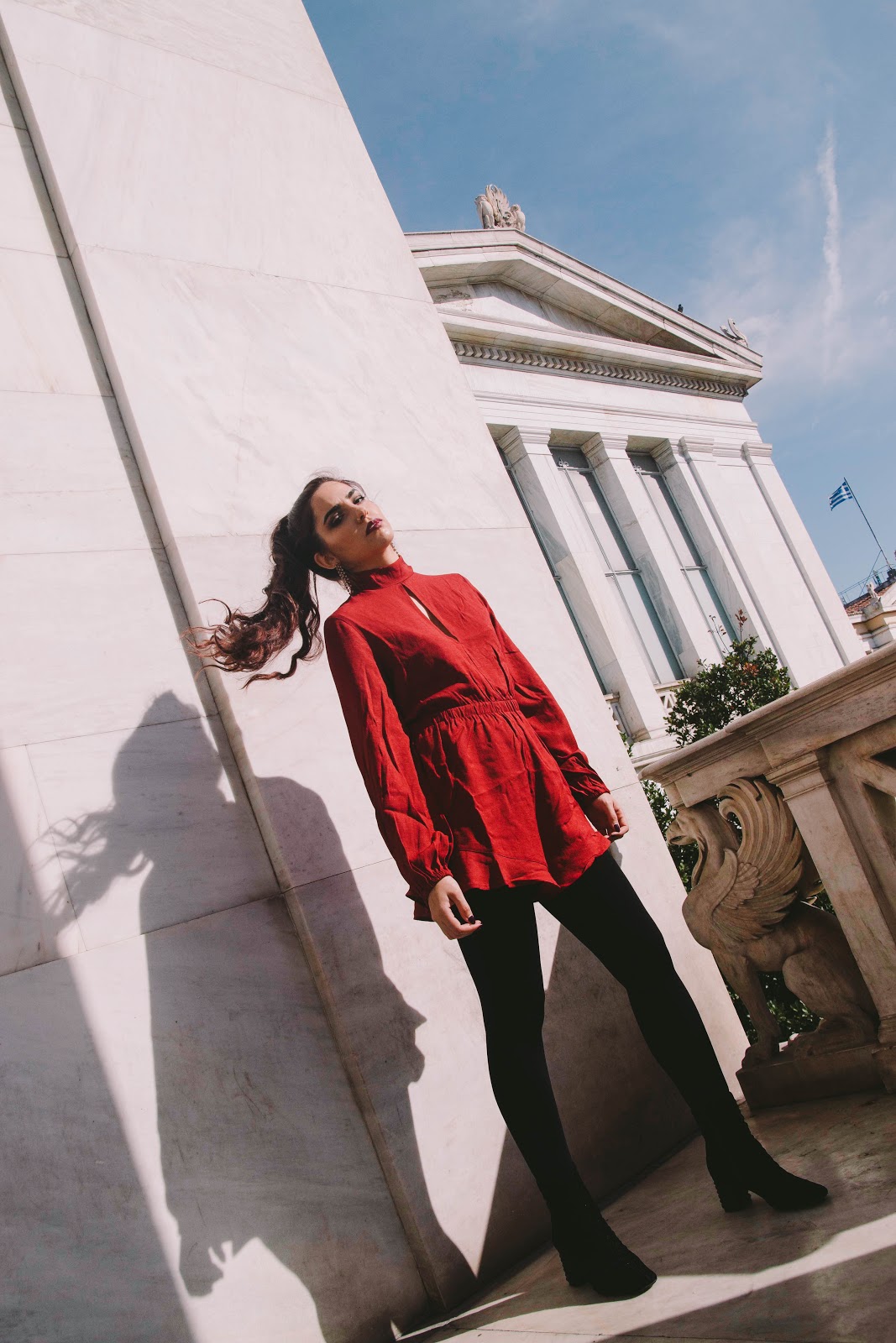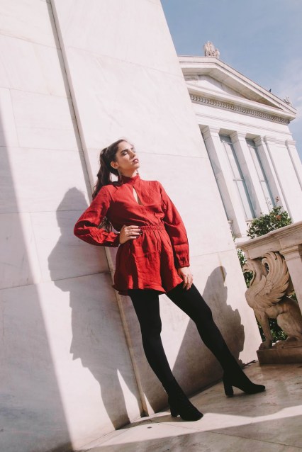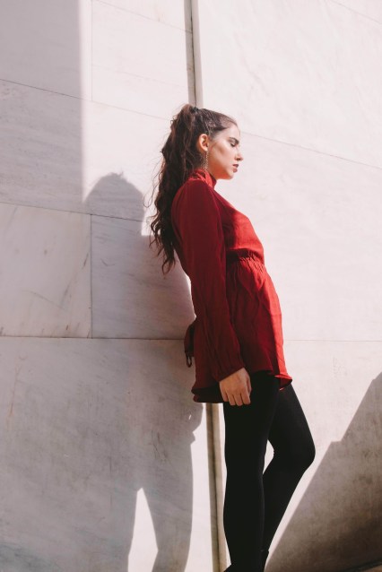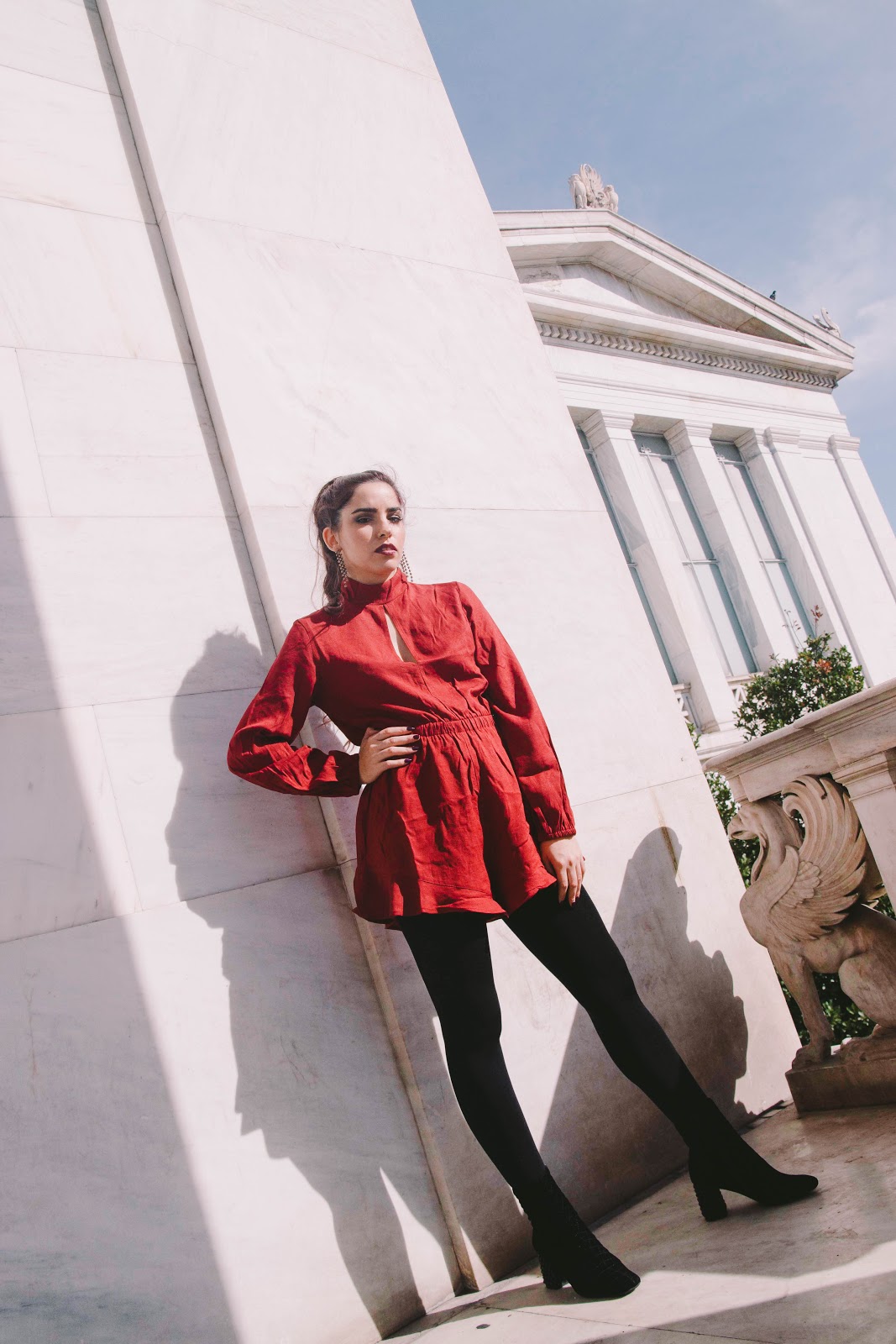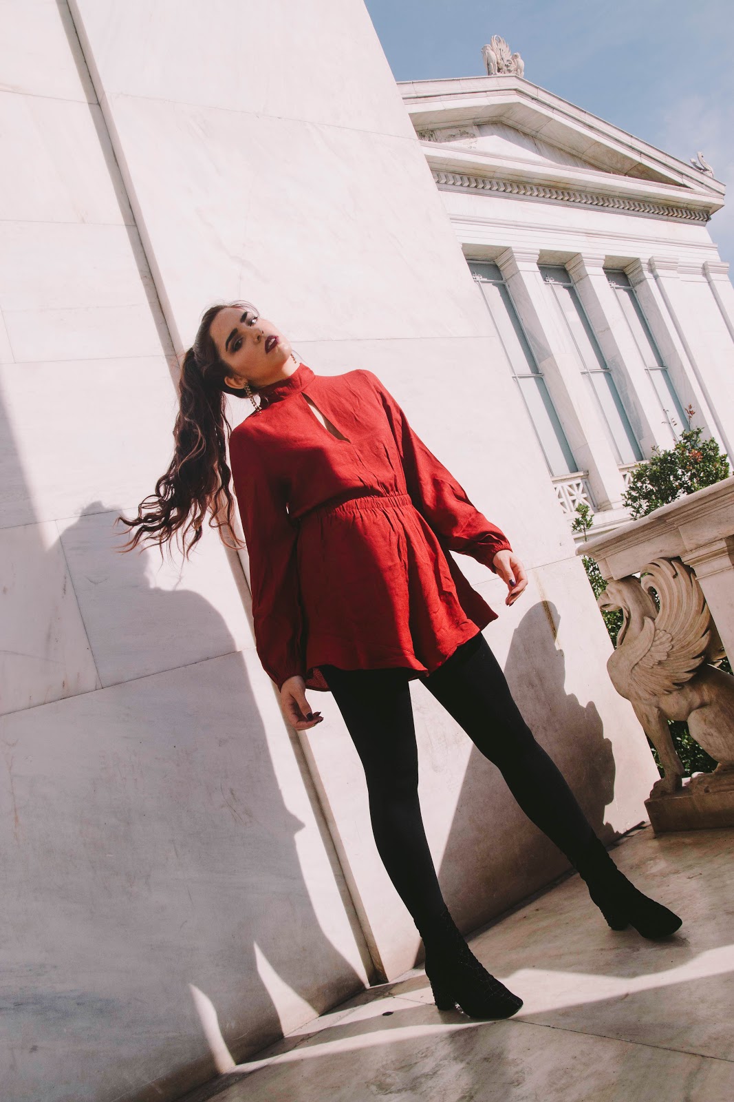 Πρώτο outfit post στο blog, και είναι σίγουρα ένα look που αν το συνδυάσω με ένα ζεστό πανωφόρι, δεν πρόκειται να κρυώσω παρά τα κρύα βράδια του Γενάρη. Γενικά, προτιμώ να επιλέγω ρούχα που αναδεικνύουν την σιλουέτα μου και την κολακεύουν χωρίς όμως να αφήνουν εκτεθειμένο πολύ από το δέρμα μου. Ένα ολόσωμο σορτς, στο χρώμα του κρασιού, με λεπτομέρειες που θυμίζουν βικτωριανή εποχή όπως τα φουσκωτά μανίκια και ο κλειστός γιακάς με ένα ελαφρύ ντεκολτέ.