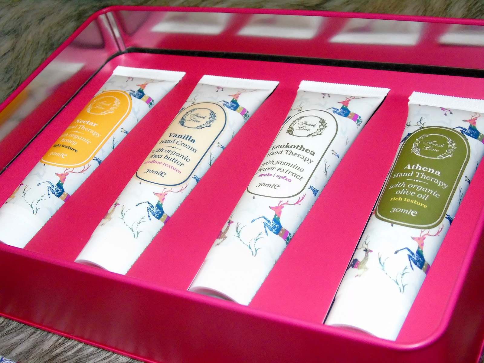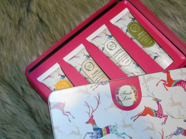 .Ξεκινώντας από την συσκευασία, είναι ένα φανταστικό μεταλλικό κουτί, το οποίο είναι και αρκετά πρακτικό αφού μπορεί να χρησιμοποιηθεί πολλαπλά και μελλοντικά. Συνεχίζοντας με τα προϊόντα, είναι τέσσερις κρέμες χεριών σε συσκευασία των 30 ml , όπου η καθεμία προσφέρει και διαφορετικού επιπέδου ενυδάτωση.