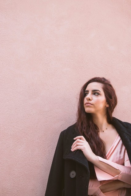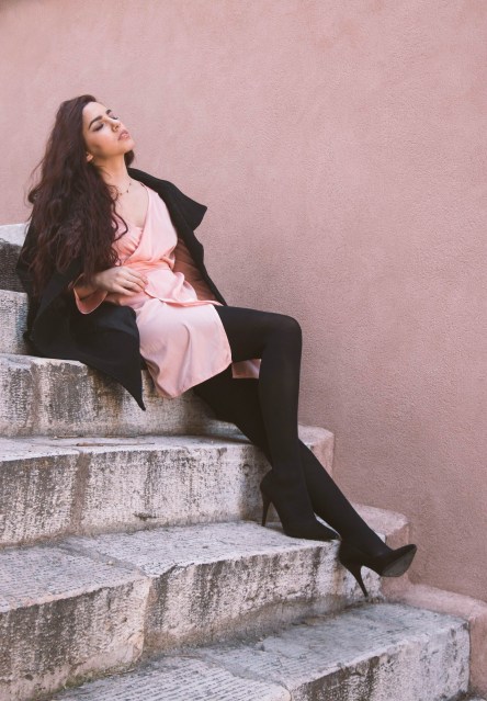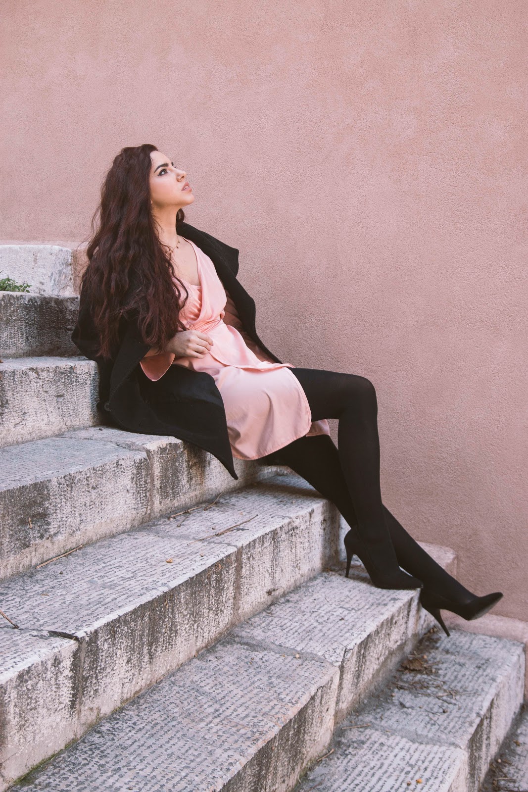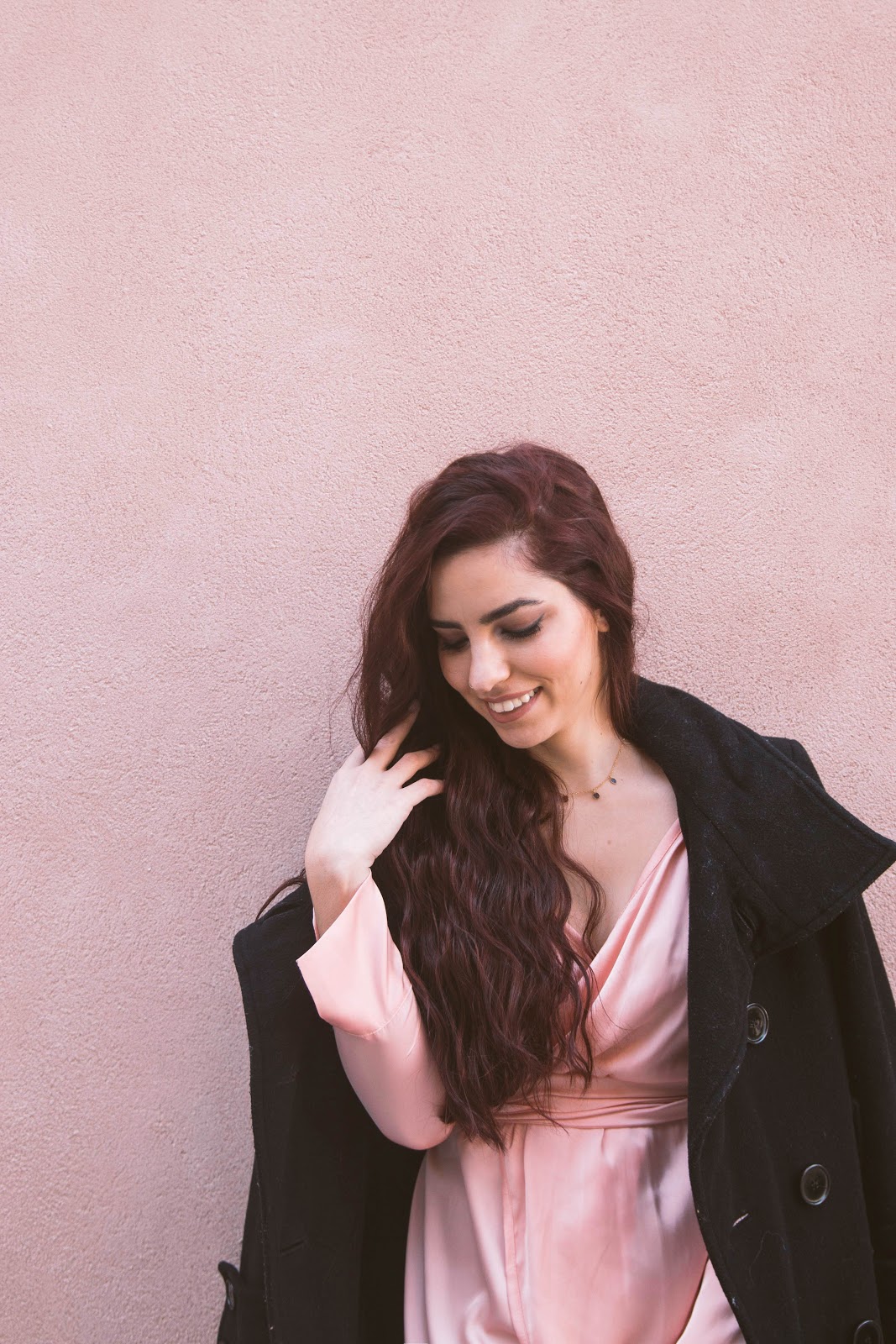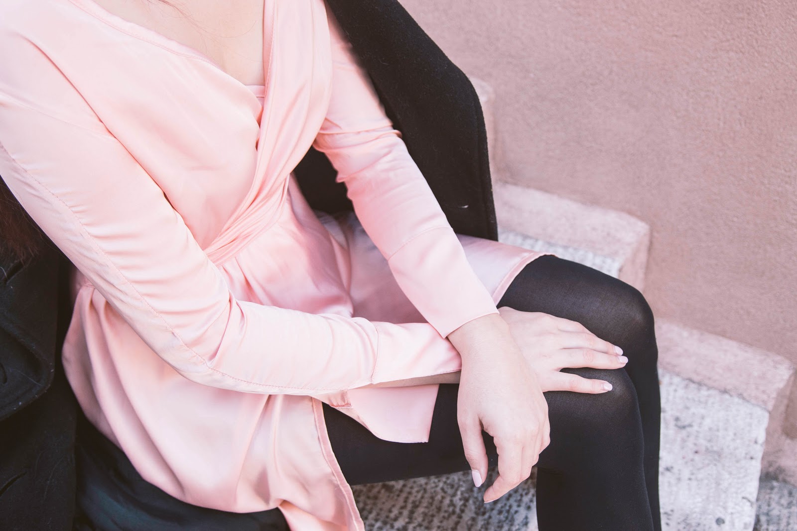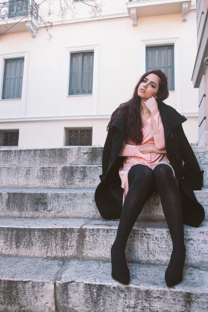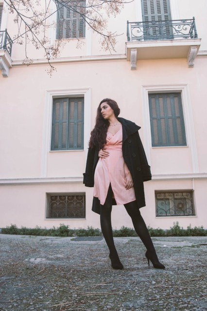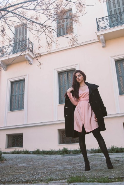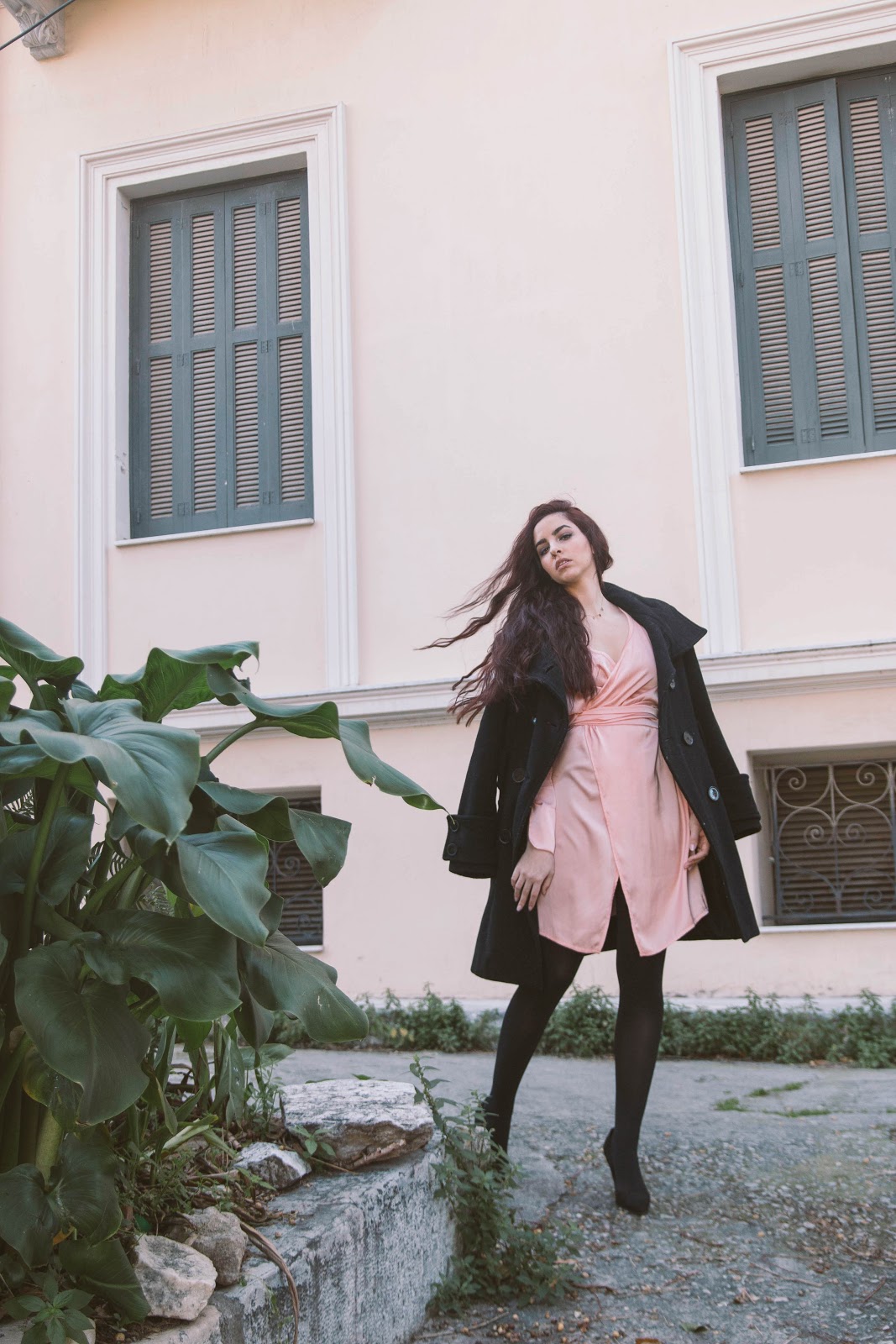 Έτσι, είναι φανερό πως και αυτό το look μου είναι βασισμένο σε αυτό το χρώμα, συνδυασμένο με το πολυαγαπημένο μαύρο χρώμα. Ένα σατέν κρουαζέ slip dress,σε dusty pink,με μακρύ μανίκι γιατί ακόμα κάνει κρύο, με ντεκολτέ που κολακεύει αλλά το διατηρεί ρομαντικό, ήταν ένα ρούχο που φωνάζει από μακριά ότι είναι κατάλληλο για την Ημέρα των Ερωτευμένων. Για να δώσω έμφαση σε αυτό, προτίμησα τα υπόλοιπα κομμάτια να είναι μαύρα, όπως το παλτό μου που είναι σε ίσια γραμμή με γιακά, οι μαύρες suede γόβες μου αλλά και ένα μαύρο opac καλσόν για να δίνει την ψευδαίσθηση του ενιαίου μαζί με τις γόβες και να δείχνει τα πόδια μου μακρύτερα. Το μόνο κόσμημα που πρόσθεσα είναι ένα διακριτικό αλλά κομψό κόσμημα για τον λαιμό, αρκετό για να μην φαίνεται άδειος ο λαιμός.