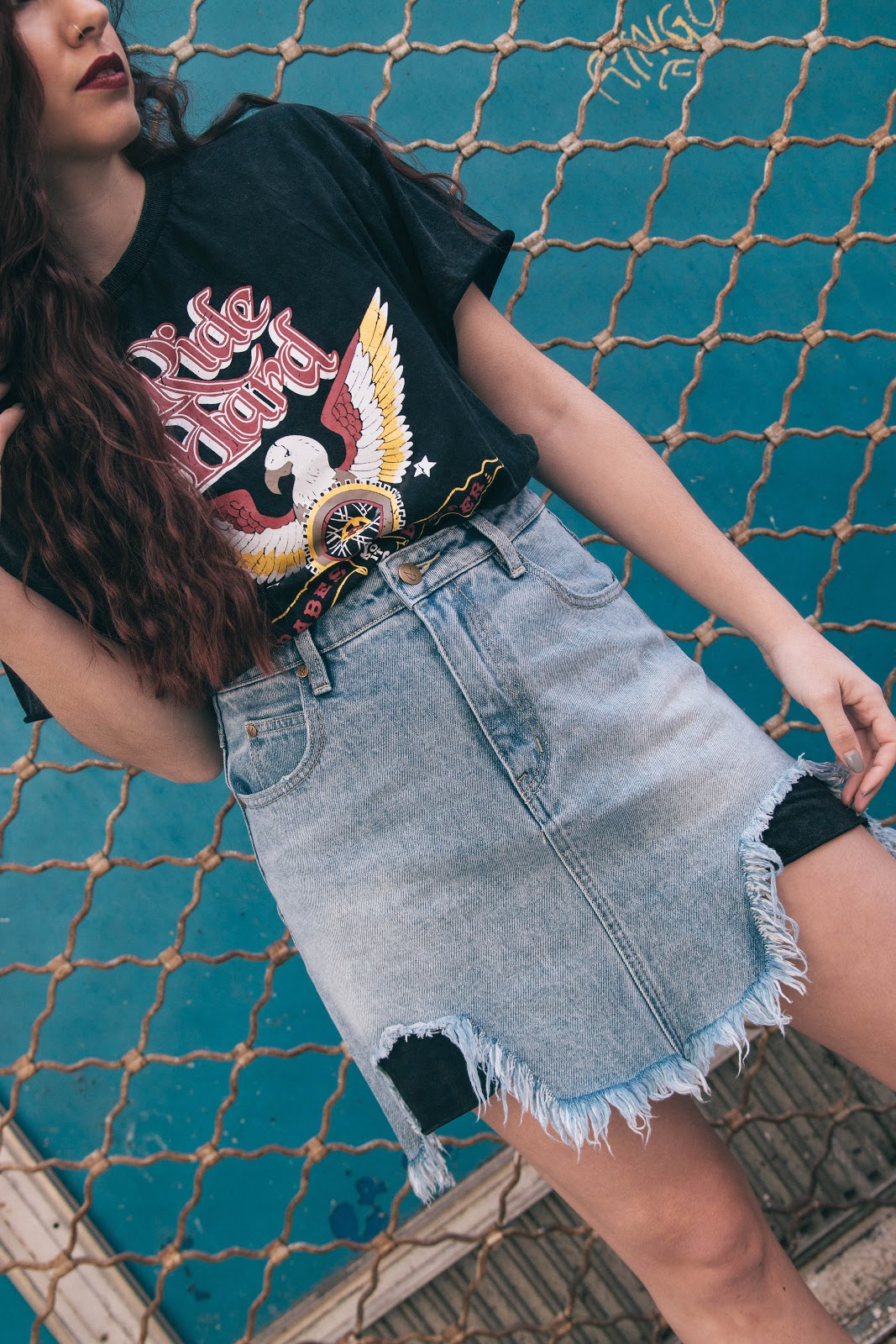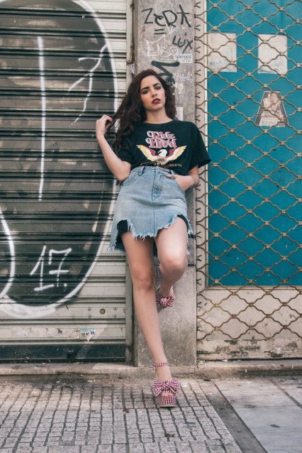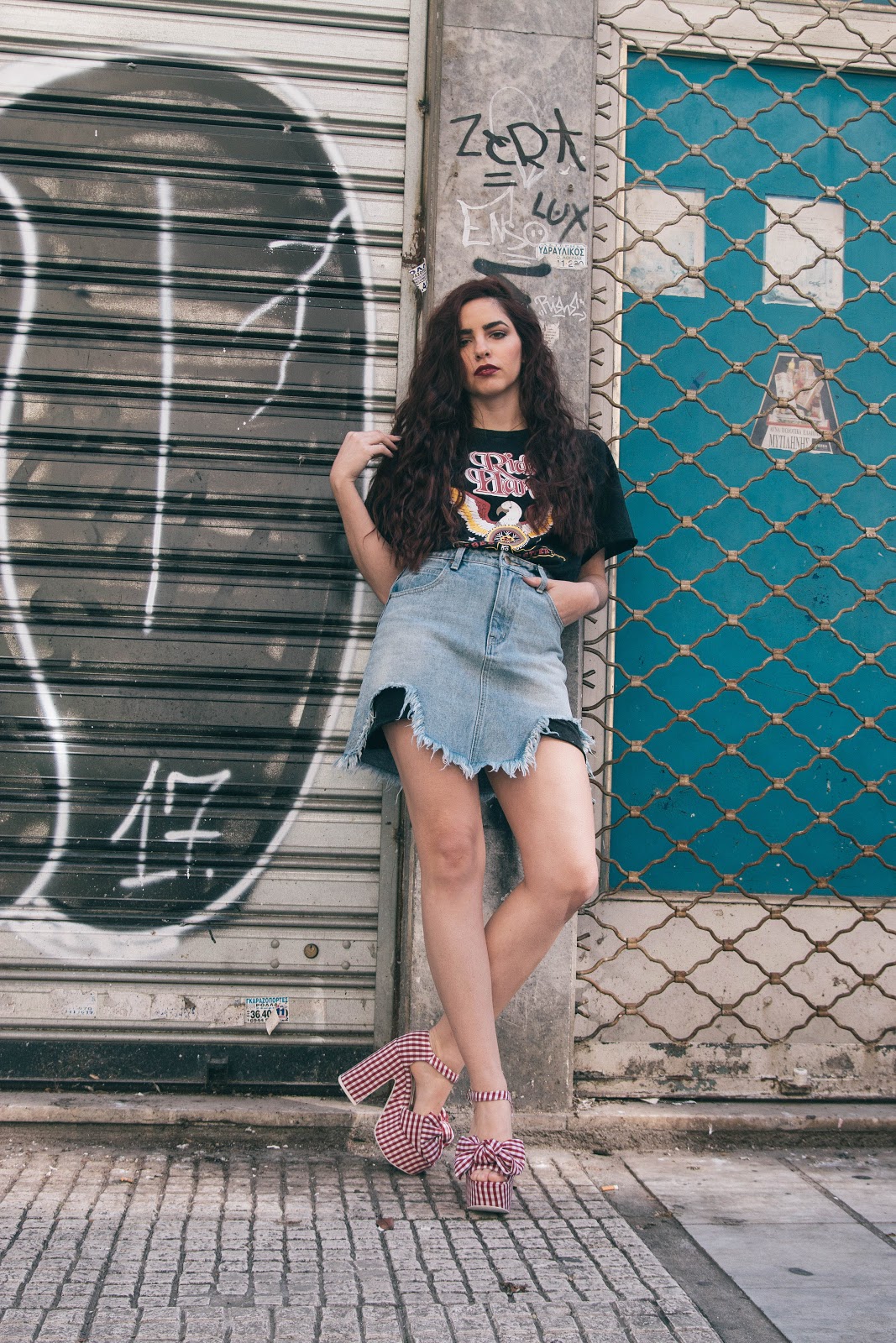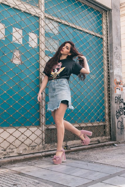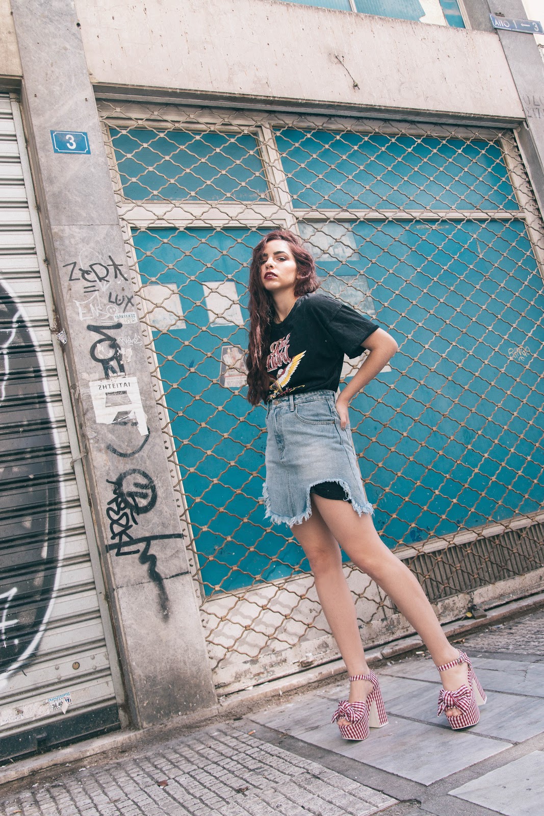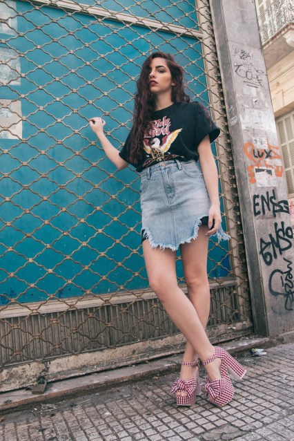 Το denim ήταν και συνεχίζει να είναι και σήμερα βασικό piece της ντουλάπας, και ειδικά όταν είναι highwaisted. Επιλέγοντας μια denim φούστα που δείχνει φθαρμένη, την ταίριαξα με ένα tee dress, το οποίο καλύπτει τα κενά που δημιουργεί η φούστα και είναι και μια μορφή layering, με το σημαντικότερο σαν αποτέλεσμα: να νιώθω άνετα αλλά και stylish.