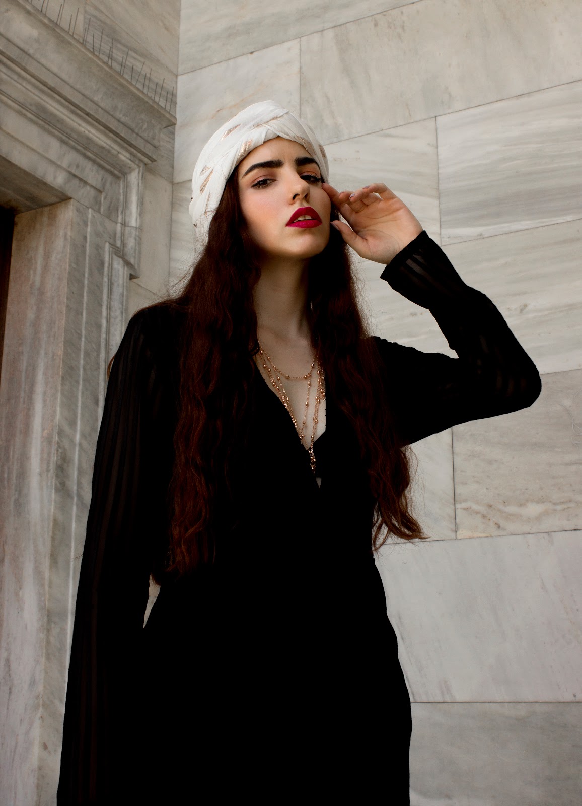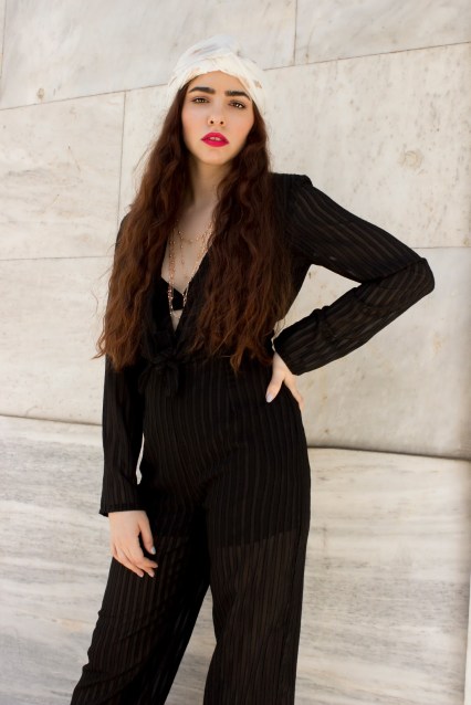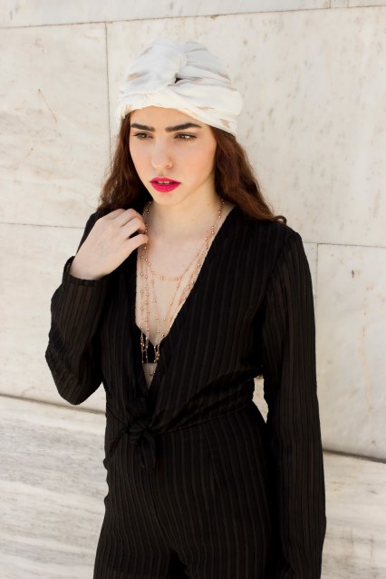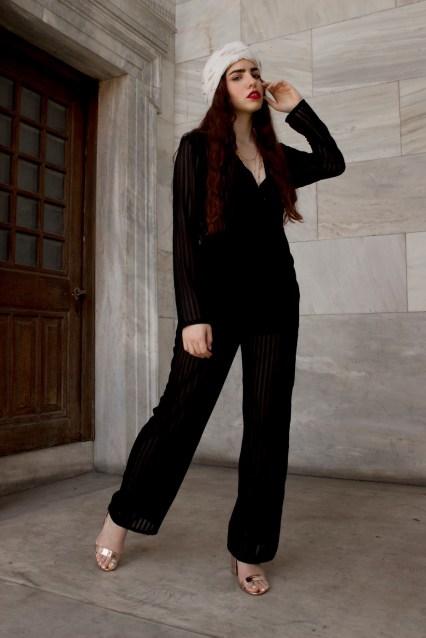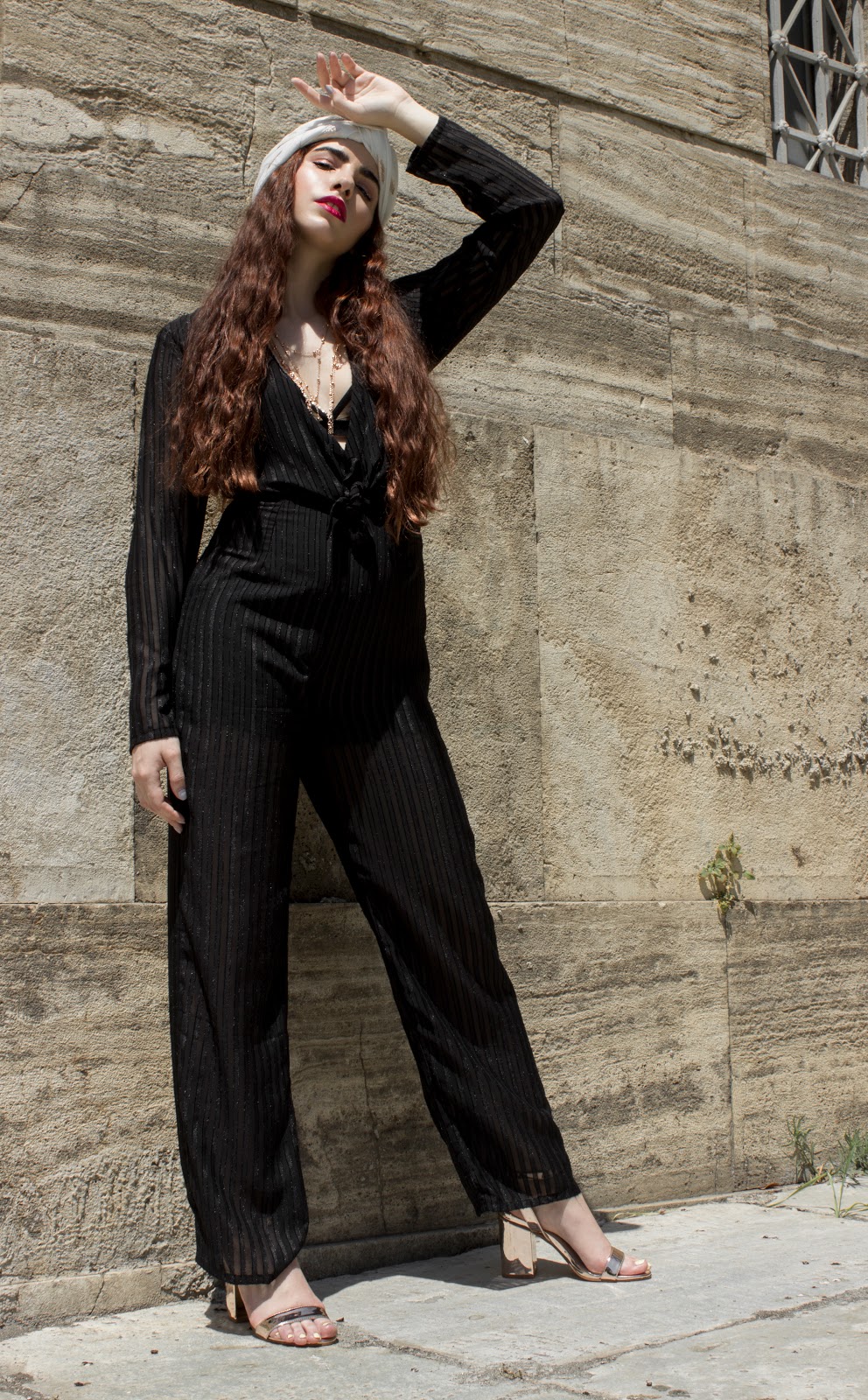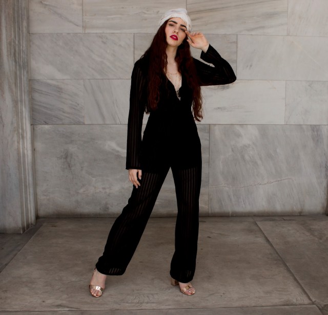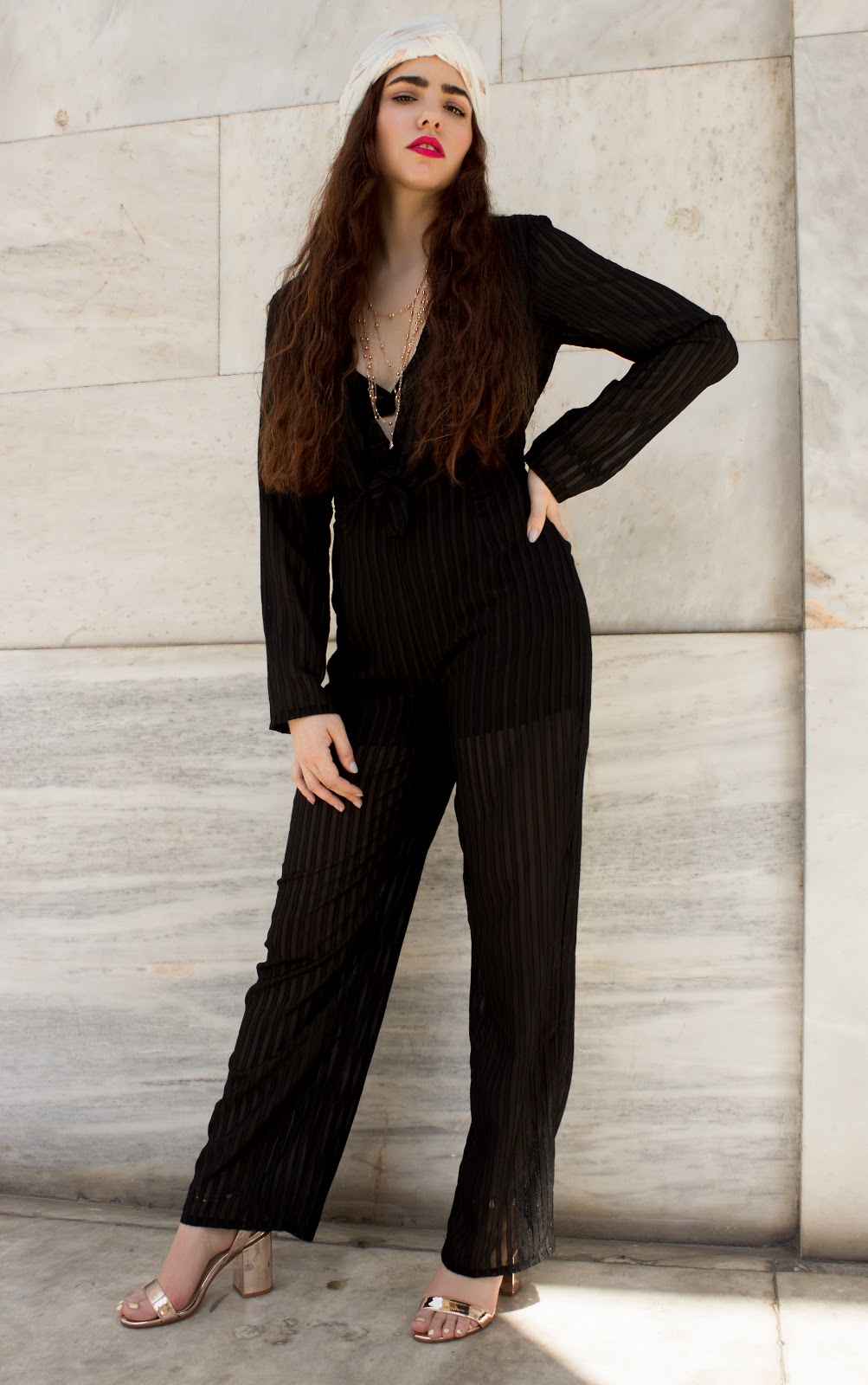 Υποδεχόμαστε τον τελευταίο ανοιξιάτικο μήνα με νέο editorial το οποίο αποτελείται από ένα πολύ βασικό κομμάτι και για το καλοκαίρι και αυτό είναι η ολόσωμη φόρμα : την επέλεξα σε μαύρο χρώμα που είναι all time classic,αλλά είναι δροσερή, αφού έχει διαφάνειες και ανοιχτό ντεκολτέ – με το οποίο συνδύασα το μαύρο bralette μου για να είμαι πιο άνετη. Επειδή θεωρώ ότι ένα αξεσουάρ μπορεί να κάνει τη διαφορά, φόρεσα ένα φουλάρι λευκό με rose gold λεπτομέρειες στο κεφάλι ως τουρμπάνι, το οποίο ταίριαξα με τα πέδιλα μου στο ίδιο χρώμα, αλλά και με το κόσμημα στον λαιμό μου.