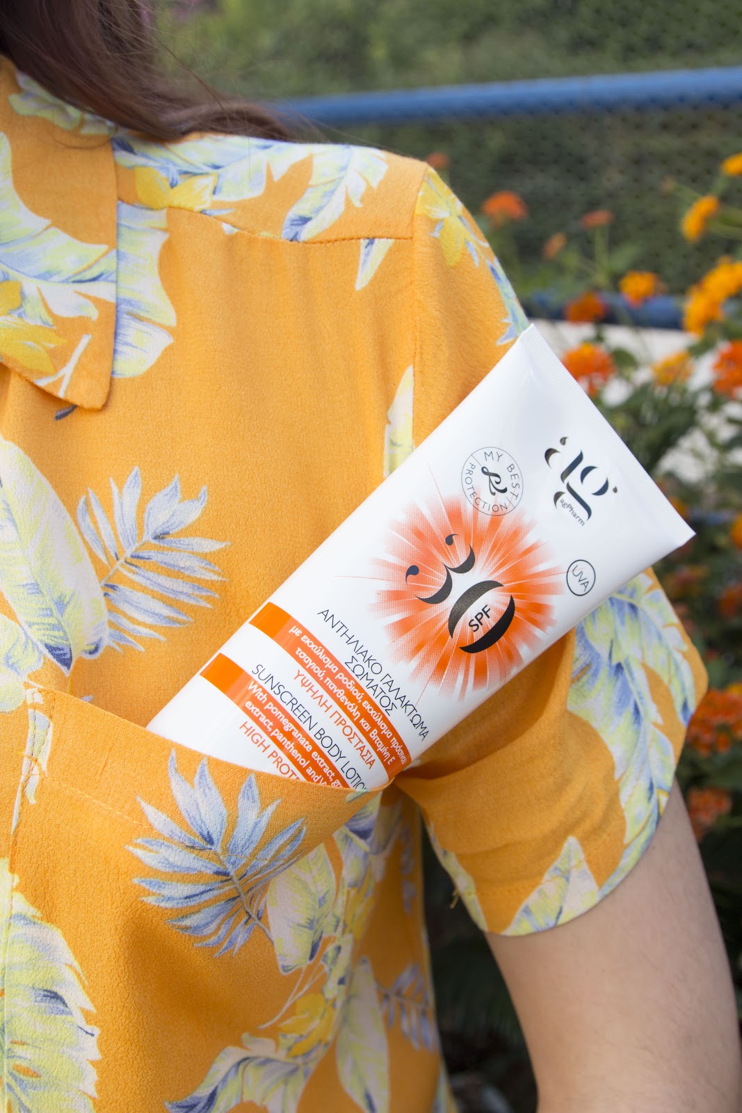 Πρώτο και κύριο είναι το αντηλιακό σώματος το οποίο είναι γαλάκτωμα αλλά δεν αφήνει άσπρα ίχνη στην επιδερμίδα μας, απλώνεται και απορροφάται γρήγορα και ομοιόμορφα διατηρώντας το δέρμα μας ενυδατωμένο. Είναι ανθεκτικό σαν σύνθεση στο νερό αλλά καλό είναι να το ανανεώνουμε μετά από κάθε βουτιά. Έχει μεταξένια υφή,SPF30 προσφέροντας υψηλή προστασία από την ηλιακή ακτινοβολία και βιταμίνη Ε που καταπολεμά την φωτό- γήρανση. Το εφαρμόζουμε από εδώ και πέρα και χωρίς να πάμε στην παραλία, όταν πρέπει να κυκλοφορήσουμε έξω τις πολύ ηλιόλουστες μέρες, κυρίως στην περιοχή των ώμων και των χεριών γενικότερα που κοκκινίζουν εύκολα.