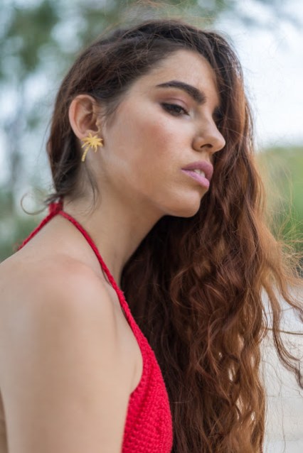 Για να δώσουμε λάμψη σε αυτό το look,επιλέξαμε πλατφόρμες με μεταλλικές λεπτομέρειες και χρυσά σκουλαρίκια σε σχήμα φοίνικα : ό,τι πιο τροπικό έχουμε στη συλλογή μας.