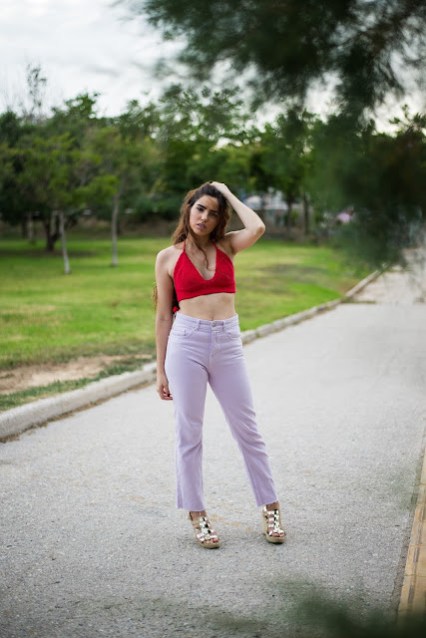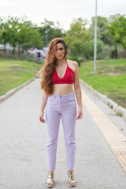 Μέσα σε αυτά θα είναι και δύο από τα trends του καλοκαιριού που είναι το πλεκτό top αλλά και το ultra violet σαν χρώμα. Ξεκινώντας με το top,είναι χειροποίητο πλεκτό κοντό top,σε κατακόκκινο χρώμα που θα κάνει αντίθεση με την μελλοντική μας μαυρισμένη από τον ήλιο επιδερμίδα.Eίναι τέλεια επιλογή για όλη την ημέρα, από την παραλία με ένα denim shorts,μέχρι το βράδυ με ένα jeans παντελόνι όπως αυτό, που συνδυάζει το αγαπημένο σε όλες μας mommy jeans με το pastel μωβ που προσωπικά έχουμε αγαπήσει το τελευταίο διάστημα.
