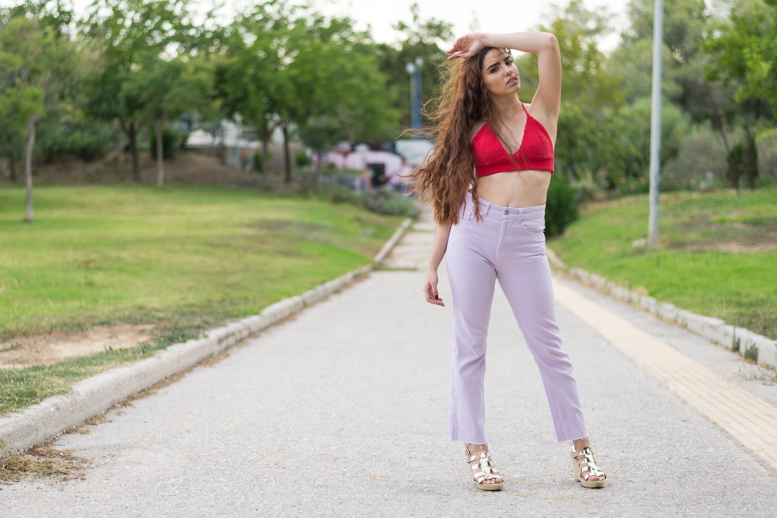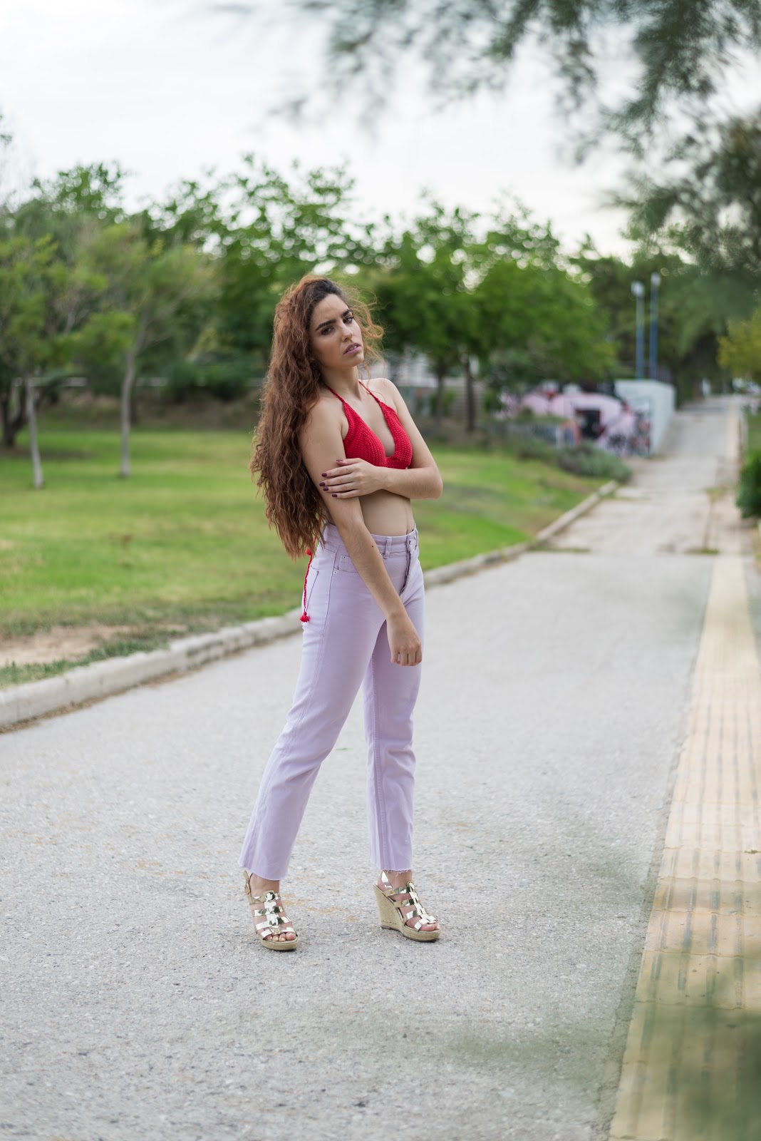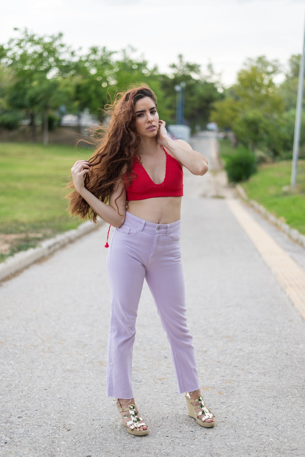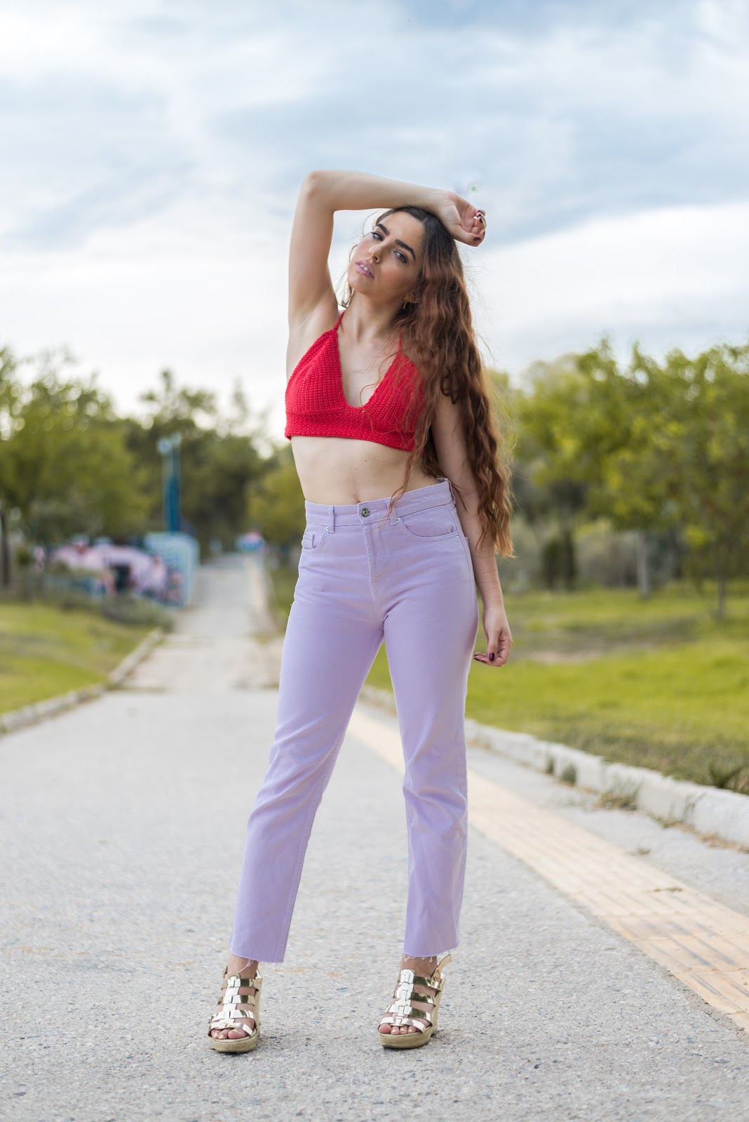 Μέσα σε αυτά θα είναι και δύο από τα trends του καλοκαιριού που είναι το πλεκτό top αλλά και το ultra violet σαν χρώμα. Ξεκινώντας με το top,είναι χειροποίητο πλεκτό κοντό top,σε κατακόκκινο χρώμα που θα κάνει αντίθεση με την μελλοντική μας μαυρισμένη από τον ήλιο επιδερμίδα.Eίναι τέλεια επιλογή για όλη την ημέρα, από την παραλία με ένα denim shorts,μέχρι το βράδυ με ένα jeans παντελόνι όπως αυτό, που συνδυάζει το αγαπημένο σε όλες μας mommy jeans με το pastel μωβ που προσωπικά έχουμε αγαπήσει το τελευταίο διάστημα.