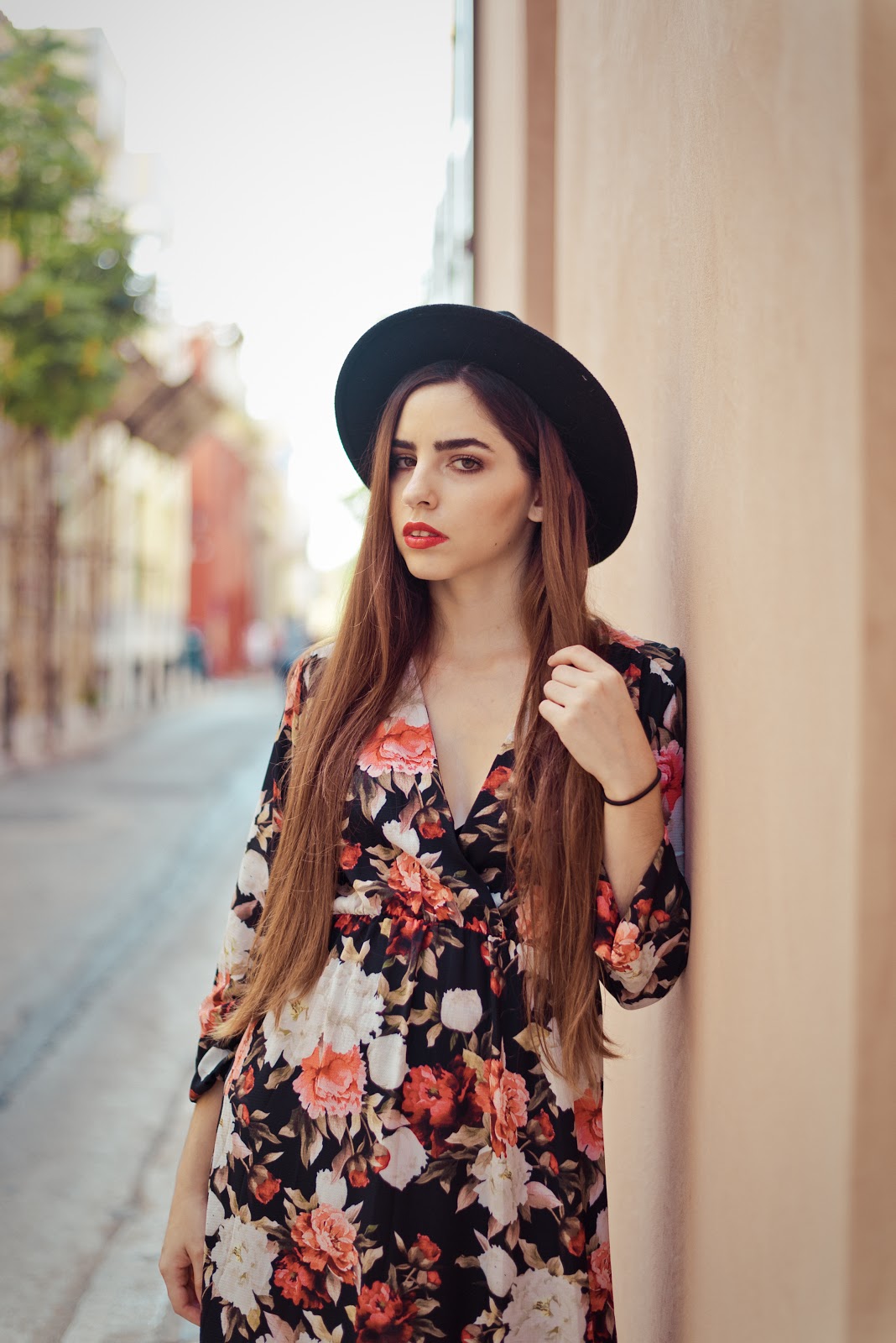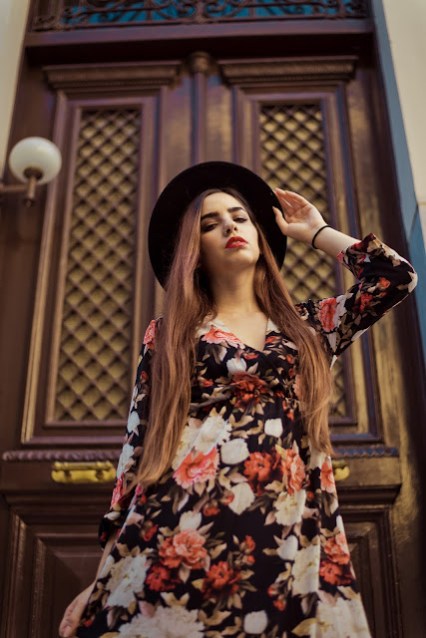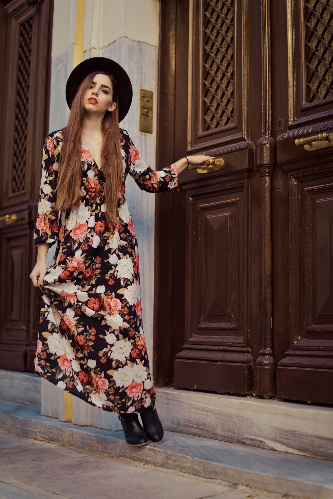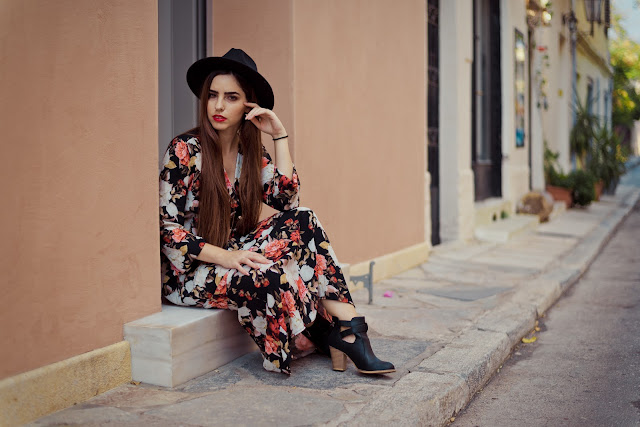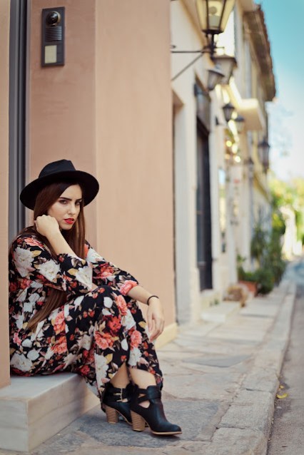 Floral σε πιο μουντές αποχρώσεις και maxi μήκος με βαθύ ντεκολτέ για να υπάρχει ισορροπία. Επιτέλους ξαναφοράμε τα αγαπημένα μας ankle boots,με τακούνι που ευνοεί το περπάτημα και από άποψη ύψους αλλά και πλάτους του τακουνιού, με λεπτομέρεια τα λουράκια τους και το γεγονός ότι αφήνουν τον αστράγαλο πιο εκτεθειμένο, γεγονός που τα κάνει πιο κομψά. Ως αξεσουάρ προφανώς και θα επιλέγαμε ένα μαύρο suede καπέλο που κάνει το outfit πιο boho,ενώ το κόκκινο κραγιόν το ολοκληρώνει και είναι απόδειξη πως πλέον μπορούμε να φοράμε πιο εύκολα τα πιο έντονα και σκούρα lipsticks.