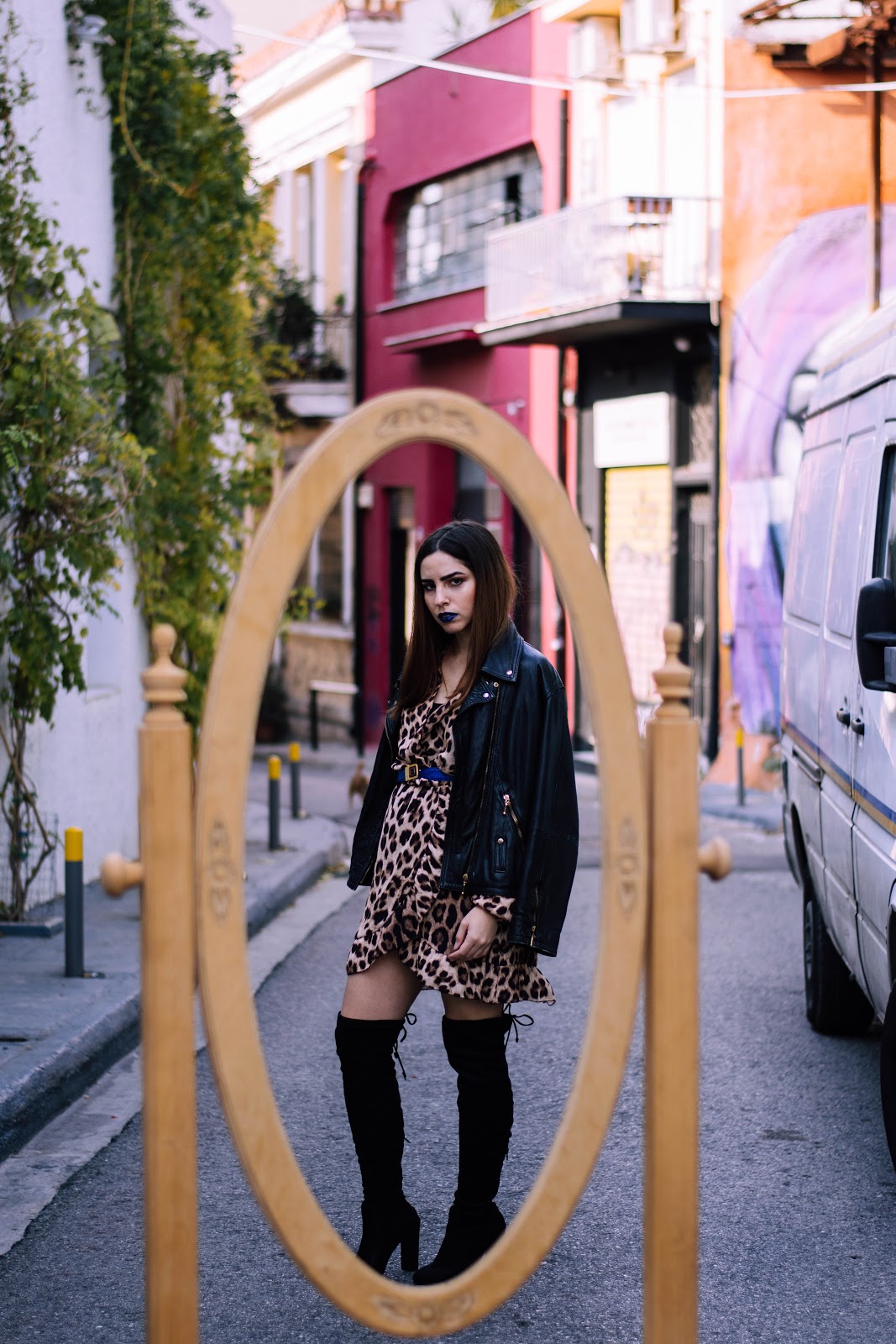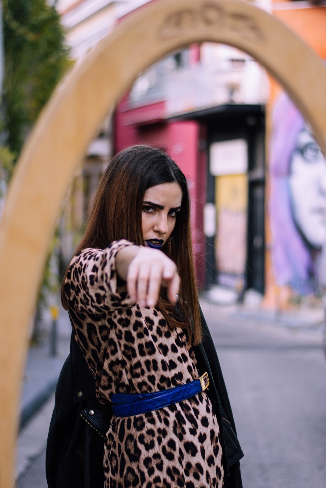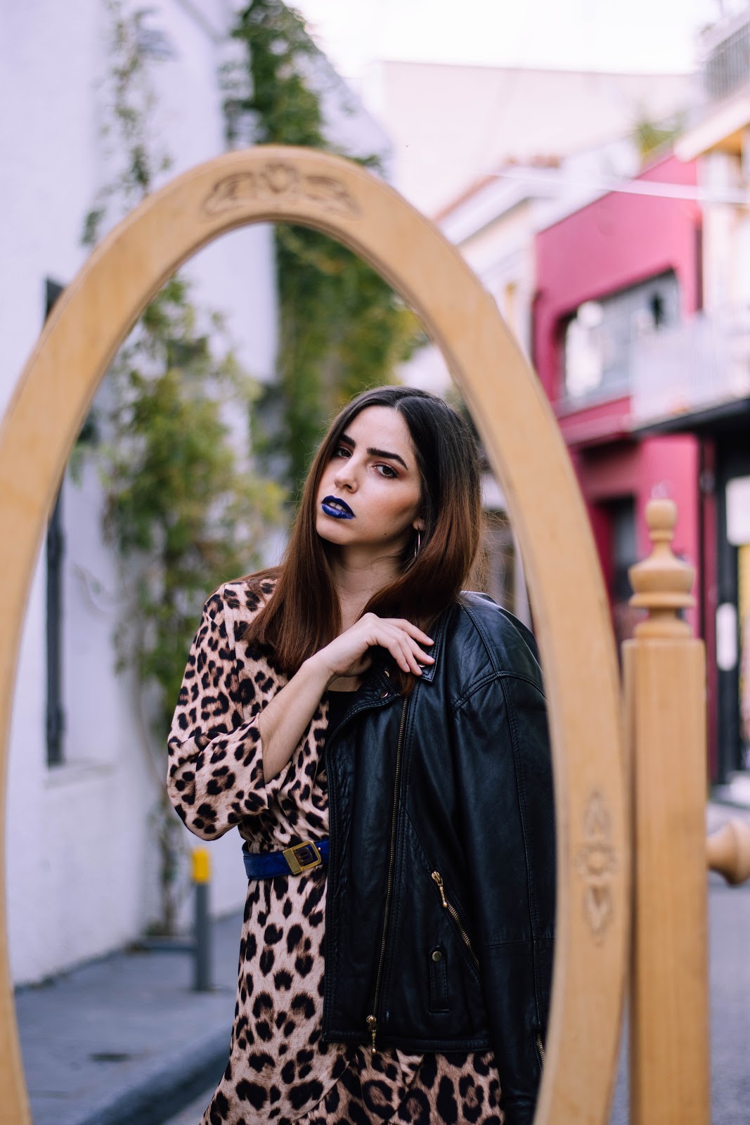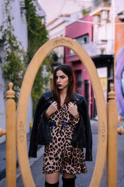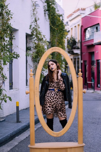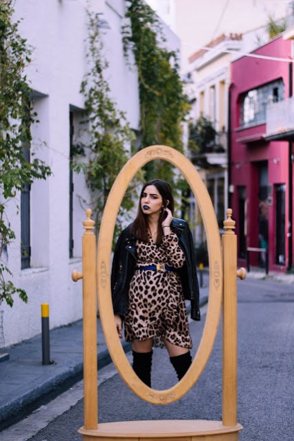 Hello Stalkers, Προφανώς και ξέρετε πως το animal print έχει γίνει η τάση της season,και μπορείτε να το βρείτε σαν μοτίβο σε ό,τι ρούχο ή αξεσουάρ προτιμάτε, σε πολλές αποχρώσεις πέραν των κλασσικών. Έτσι λοιπόν επέλεξα και εγώ να το προσθέσω στα OOTDs που μοιράζομαι μαζί σας μέσω του blog, και να δείτε πώς το προσάρμοσα στο δικό μου στυλ. Προτίμησα να το εντάξω στο look φορώντας ένα φόρεμα animal print,το οποίο είναι ανάλαφρο σαν γραμμή, με βολάν στο τελείωμα του και κρουαζέ δέσιμο στο στήθος. Ακριβώς επειδή έχει πιο φαρδιά γραμμή, πρόσθεσα μια ζώνη για να τονίσει την μέση μου, η οποία κάνει ελαφρώς snakeskin εφέ και είναι μπλε ρουά, ώστε να κάνει αντίθεση με τις γήινες αποχρώσεις του φορέματος μου. Για παπούτσια επέλεξα τις over-the-knee suede μαύρες μπότες μου, γιατί μιας και δεν μου αρέσει το καλσόν στο χρώμα του δέρματος, κάλυψα το μεγαλύτερο μέρος των ποδιών μου για να αντιμετωπίσω το κρύο. Το πανωφόρι μου είναι το αγαπημένο μου oversized vintage leather jacket το οποίο δίνει ένα πιο street mood στο outfit,ενώ το ολοκλήρωσα με μπλε χείλη τα οποία έκανα match με την ζώνη.