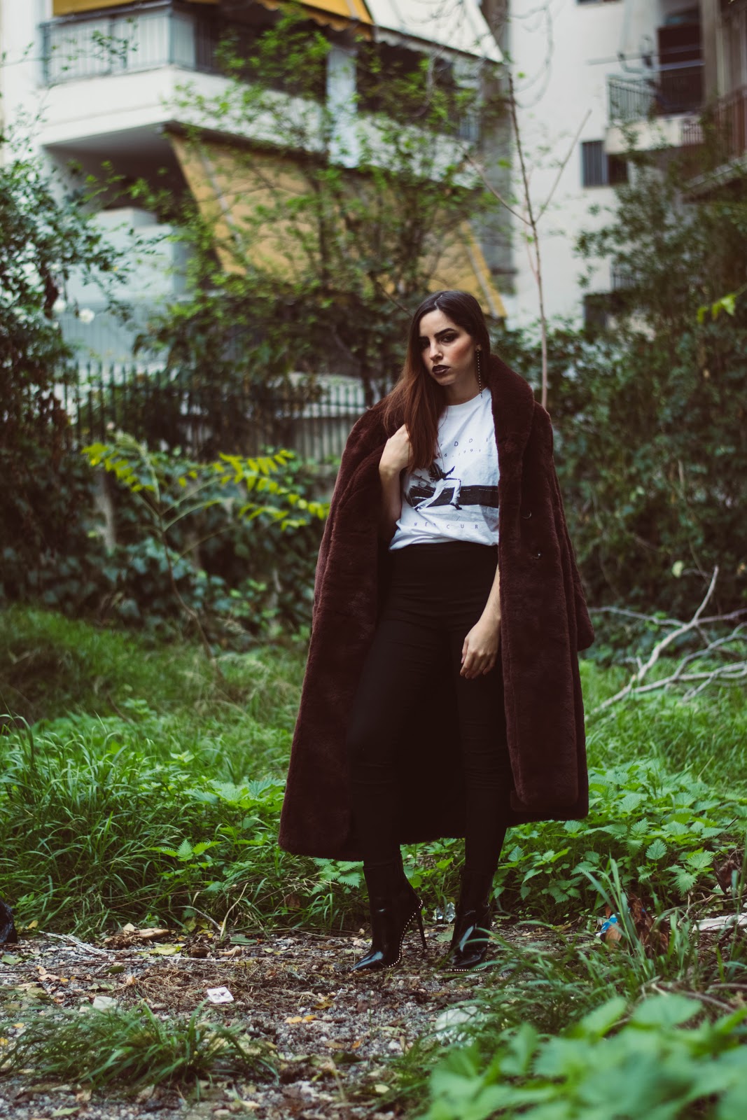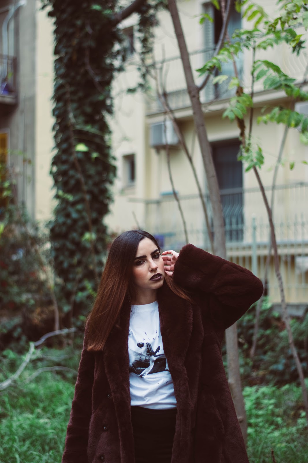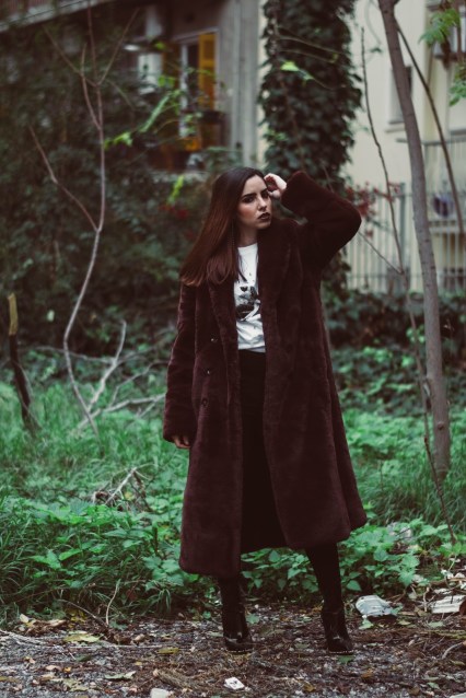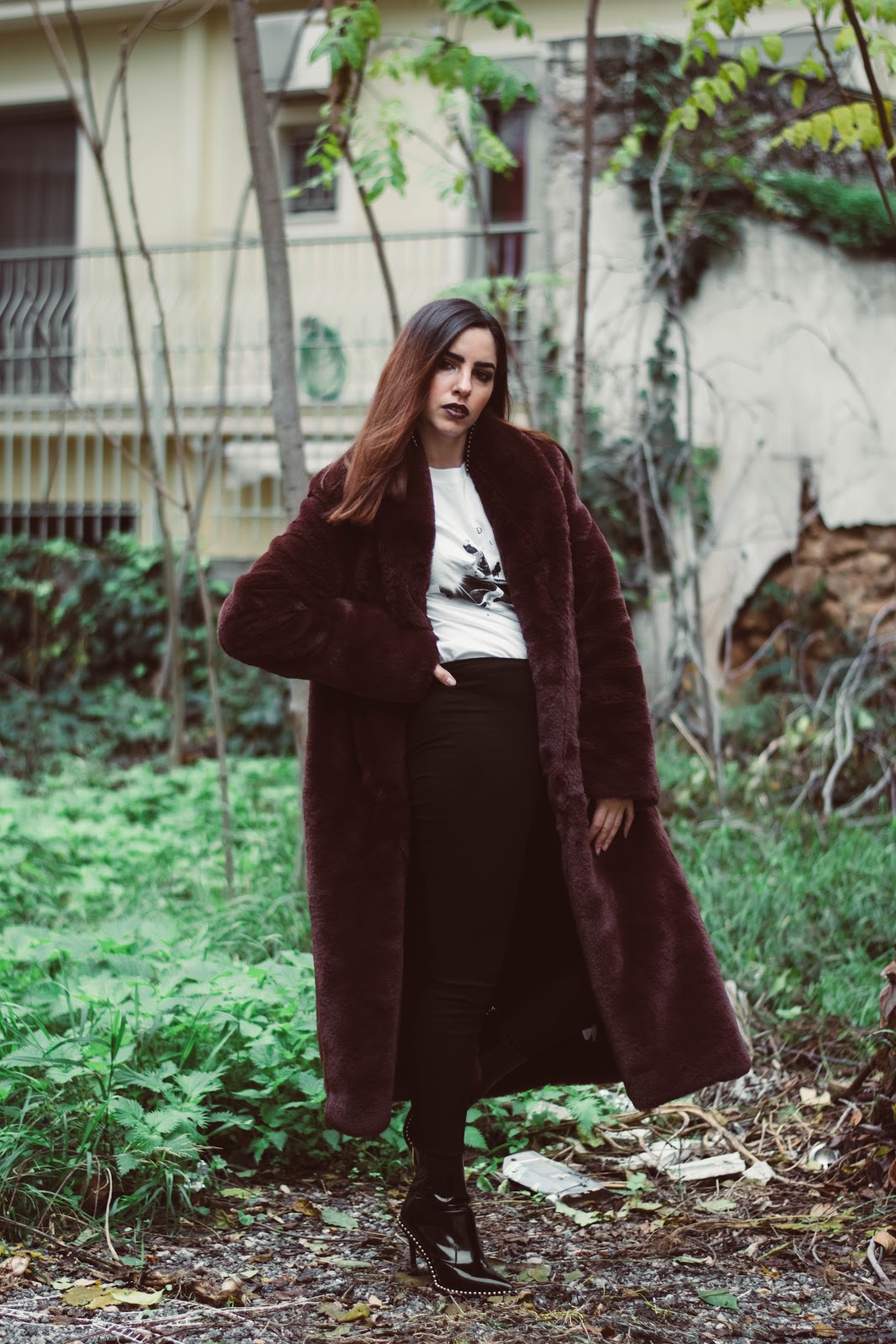 Βασικό και πολύ σημαντικό ρόλο σε αυτό το post,παίζει η maxi γούνα που επιλέξαμε, σε σκούρο καφέ χρώμα, το οποίο ανακαλύψαμε στην πορεία πως ταίριαξε απόλυτα χρωματικά με τα μαλλιά της Χριστίνας. Ακριβώς επειδή αποτελεί ένα κομμάτι του look το οποίο τραβάει τα βλέμματα χωρίς ιδιαίτερη προσπάθεια, προτιμήσαμε να το συνδυάσουμε με ένα απλό μαύρο skinny ψηλόμεσο παντελόνι το οποίο αναδεικνύει την σιλουέτα και ταιριάζει τέλεια στο τελείωμα του με τα vinyl μποτίνια τα οποία αγκαλιάζουν τον αστράγαλο.