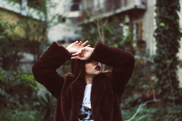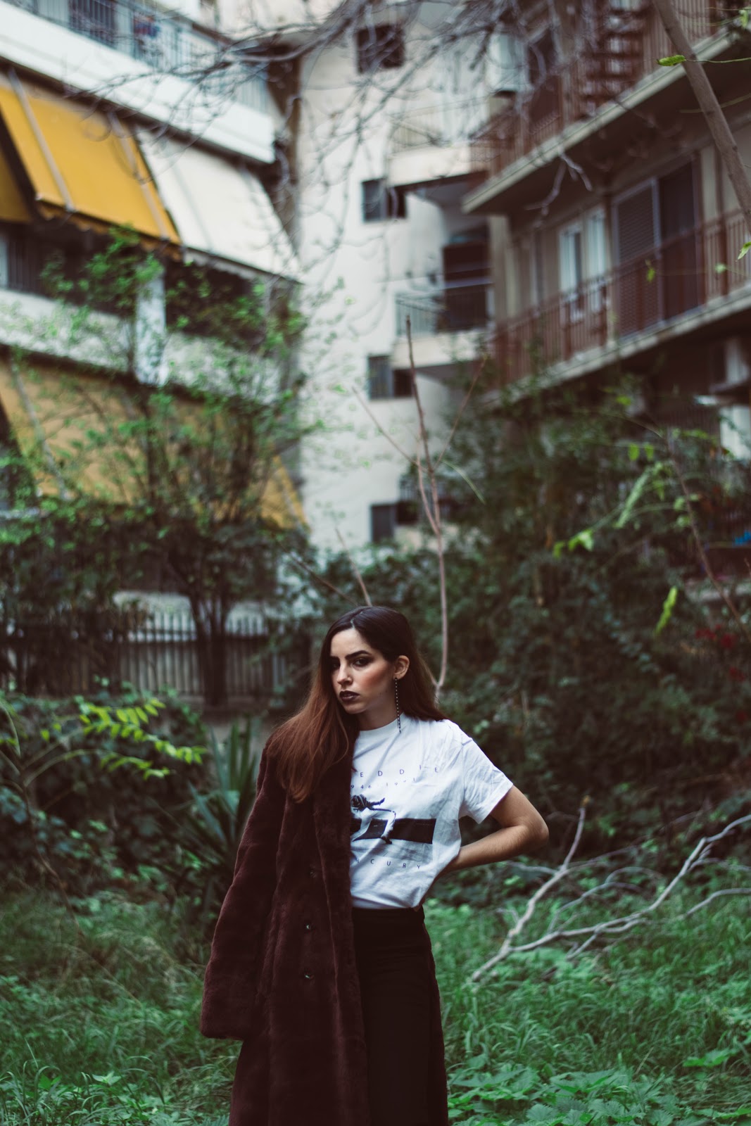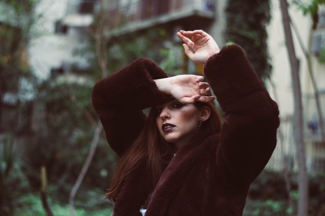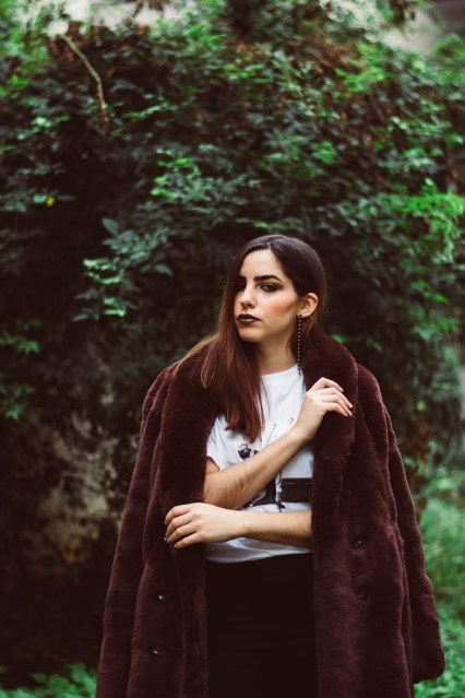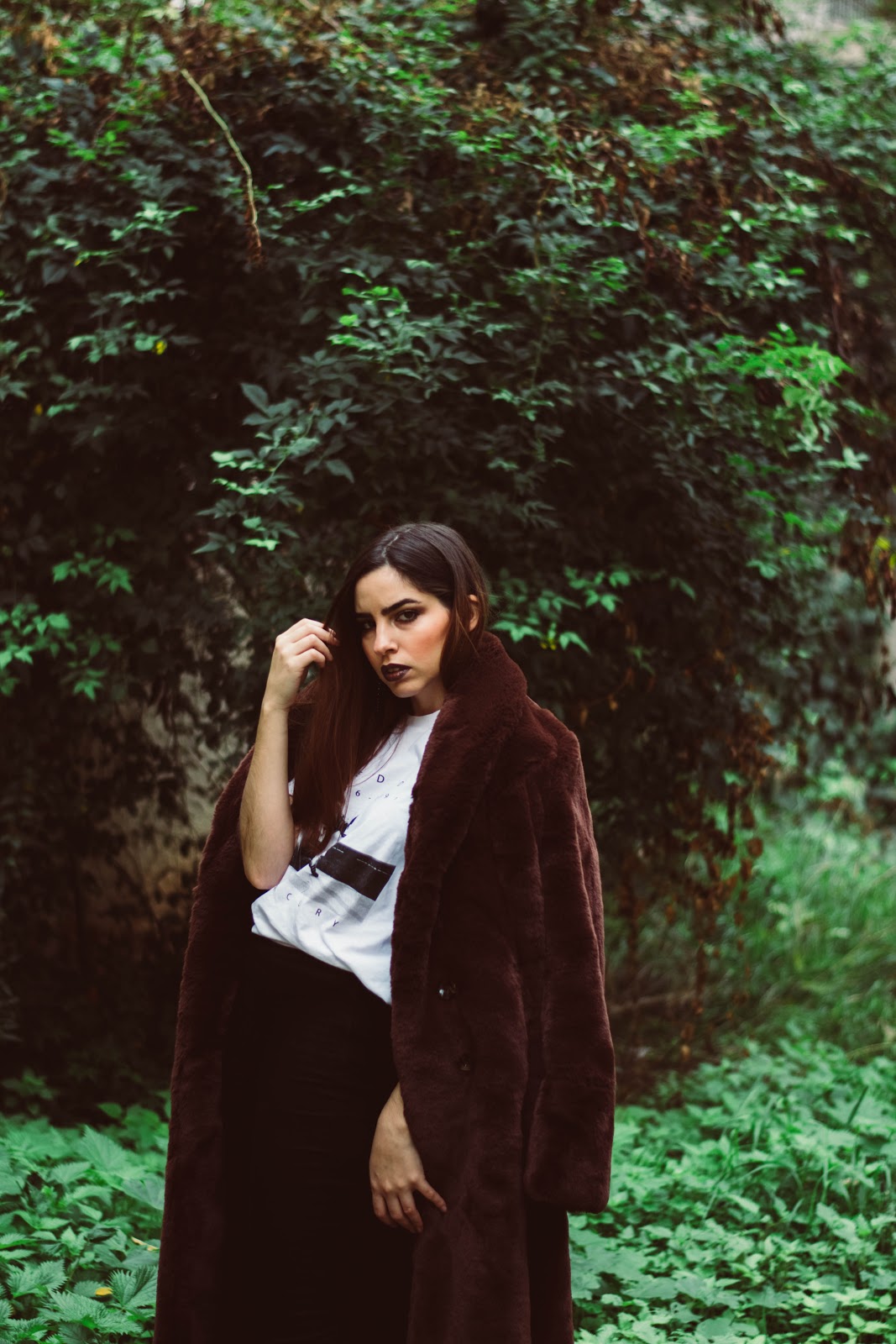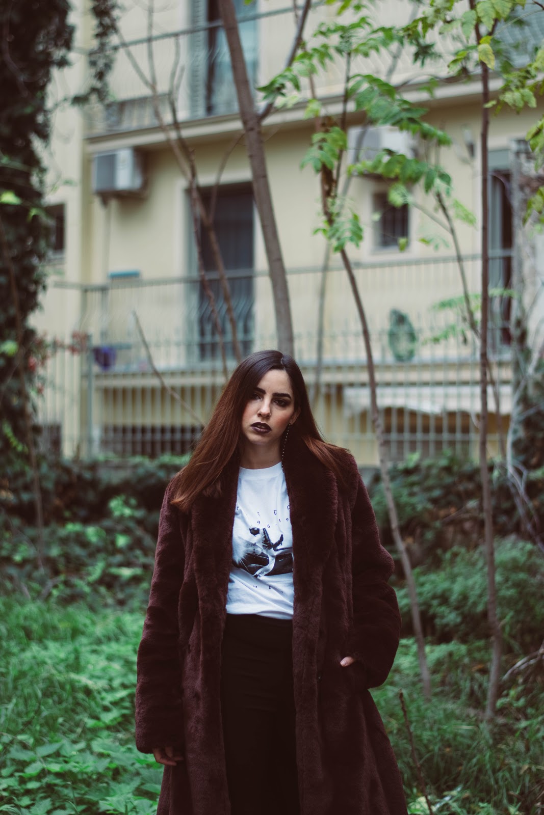 Βασικό και πολύ σημαντικό ρόλο σε αυτό το post,παίζει η maxi γούνα που επιλέξαμε, σε σκούρο καφέ χρώμα, το οποίο ανακαλύψαμε στην πορεία πως ταίριαξε απόλυτα χρωματικά με τα μαλλιά της Χριστίνας. Ακριβώς επειδή αποτελεί ένα κομμάτι του look το οποίο τραβάει τα βλέμματα χωρίς ιδιαίτερη προσπάθεια, προτιμήσαμε να το συνδυάσουμε με ένα απλό μαύρο skinny ψηλόμεσο παντελόνι το οποίο αναδεικνύει την σιλουέτα και ταιριάζει τέλεια στο τελείωμα του με τα vinyl μποτίνια τα οποία αγκαλιάζουν τον αστράγαλο.