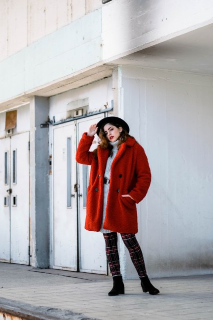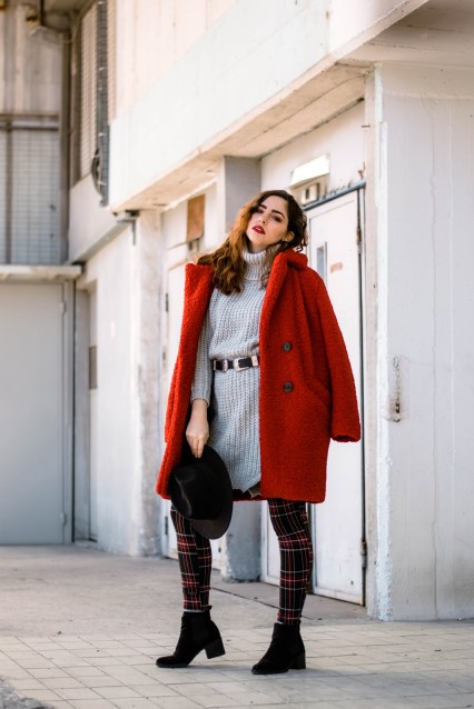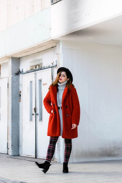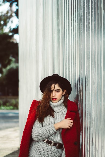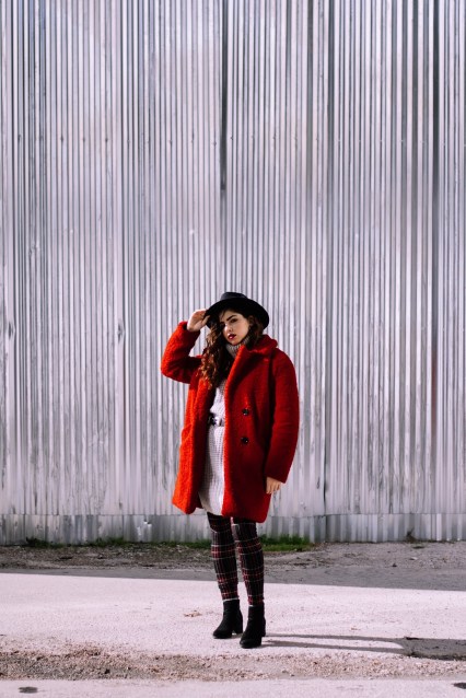 Το πανωφόρι είναι ένα κατακόκκινο παλτό σε μέτριο μήκος και φαρδιά γραμμή με μεγάλο γιακά και κουμπιά, το οποίο αποτελεί κομμάτι statement και δεν χρειάζεται ιδιαίτερο styling για να αναδειχθεί. Η τελευταία πινελιά είναι το μαύρο suede καπέλο που ολοκληρώνει το look και δίνει μια διαφορετική πινελιά γενικότερα.