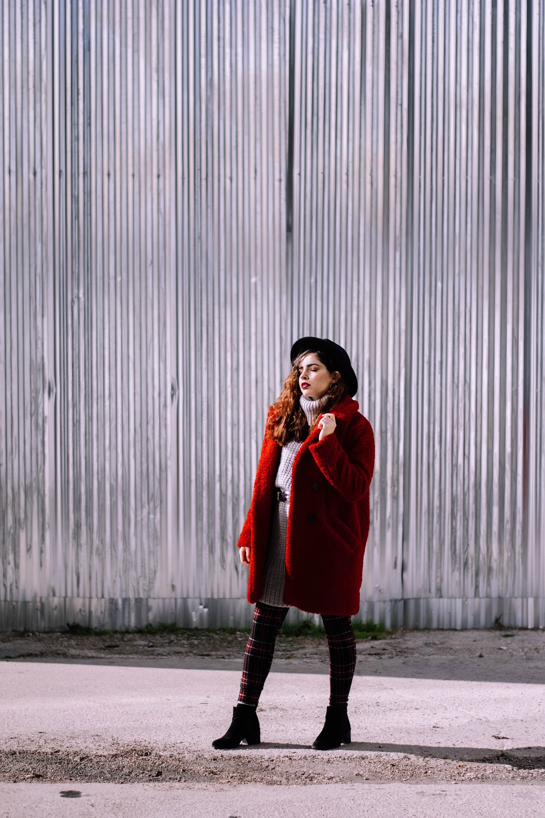 Το πανωφόρι είναι ένα κατακόκκινο παλτό σε μέτριο μήκος και φαρδιά γραμμή με μεγάλο γιακά και κουμπιά, το οποίο αποτελεί κομμάτι statement και δεν χρειάζεται ιδιαίτερο styling για να αναδειχθεί. Η τελευταία πινελιά είναι το μαύρο suede καπέλο που ολοκληρώνει το look και δίνει μια διαφορετική πινελιά γενικότερα.