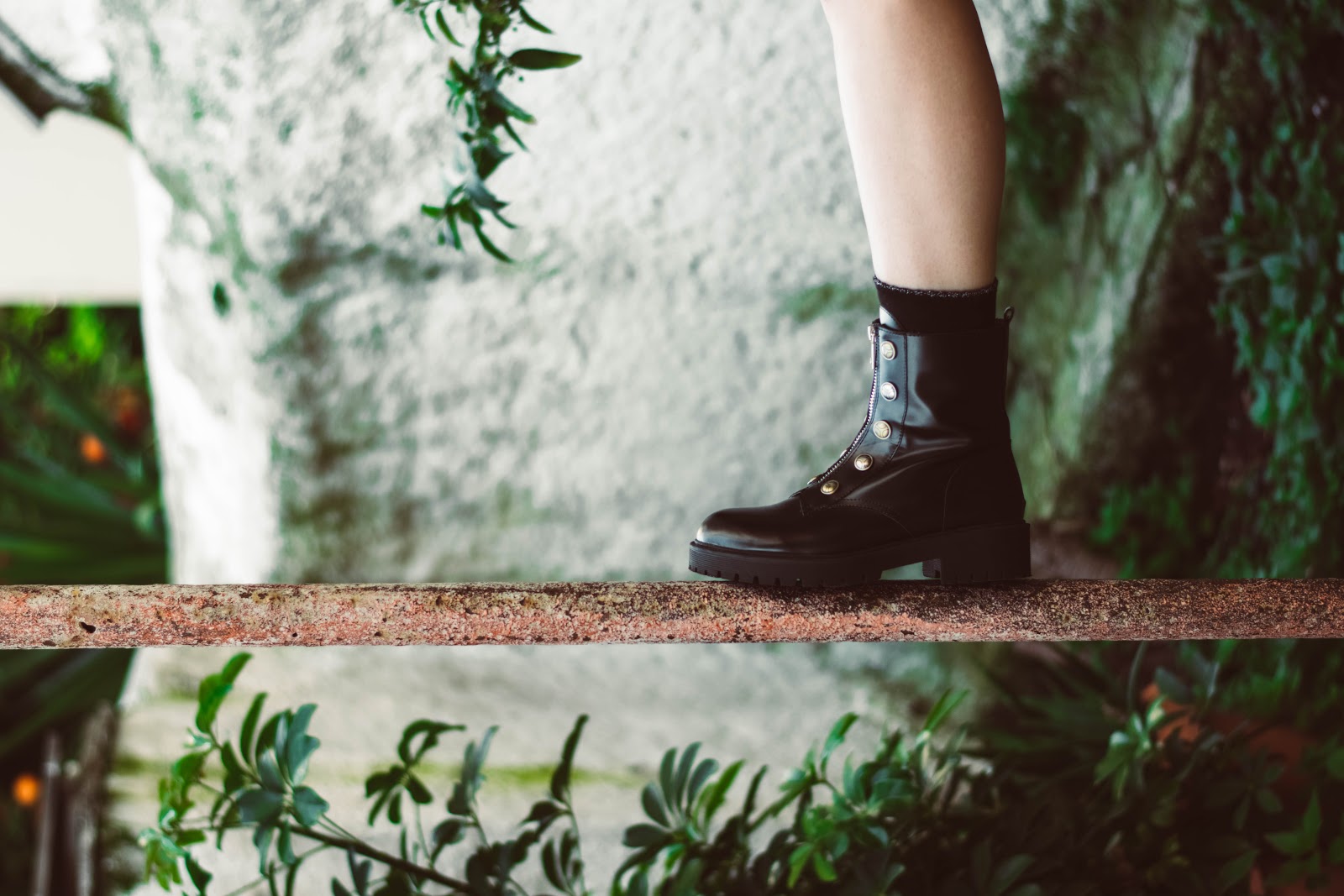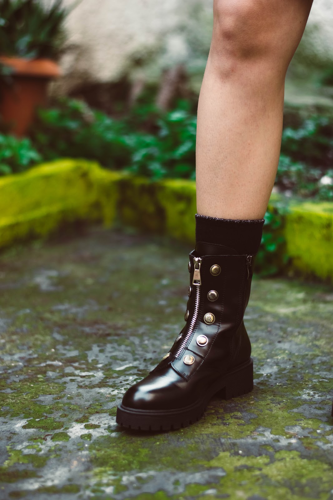 Για να κάνουμε το look πιο street και να πάρει και μια δόση πιο rock,επιλέξαμε για παπούτσια ένα ζευγάρι μαύρα μποτάκια σε στυλ αρβύλας ,με φερμουάρ και χρυσές λεπτομέρειες, ενώ τη διαφορά μπορεί να κάνει το καλτσάκι από μέσα, είτε είναι μαύρο, είτε έχει κάποιο χρώμα.