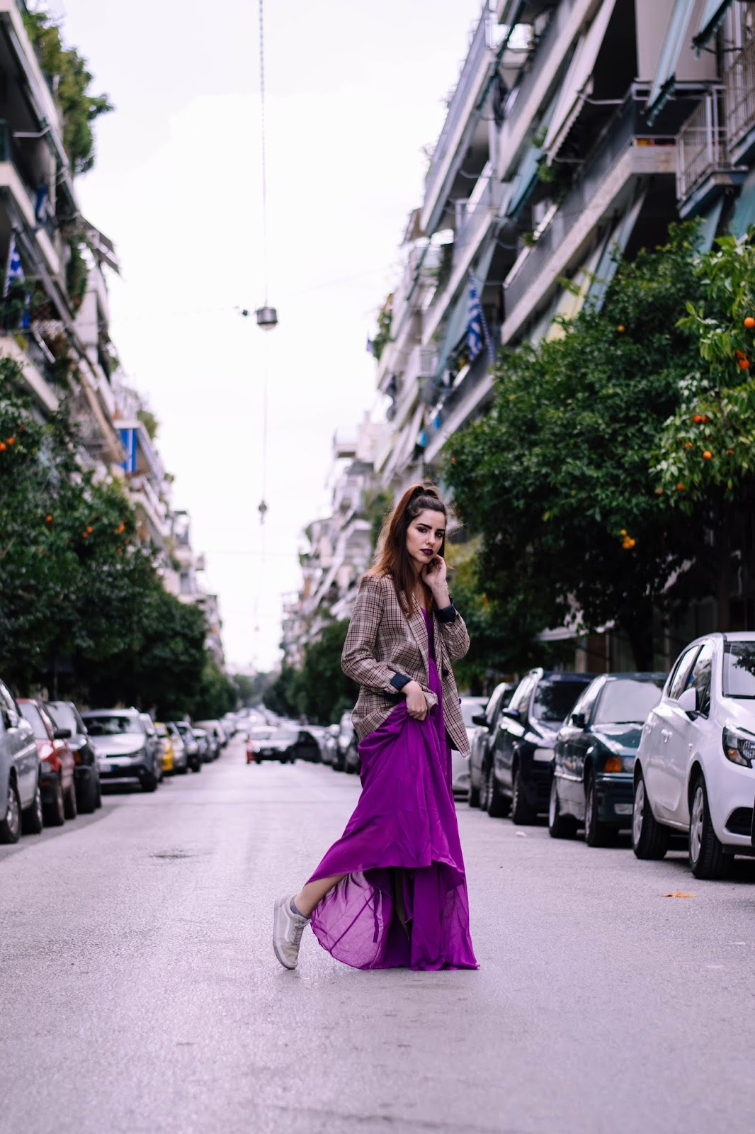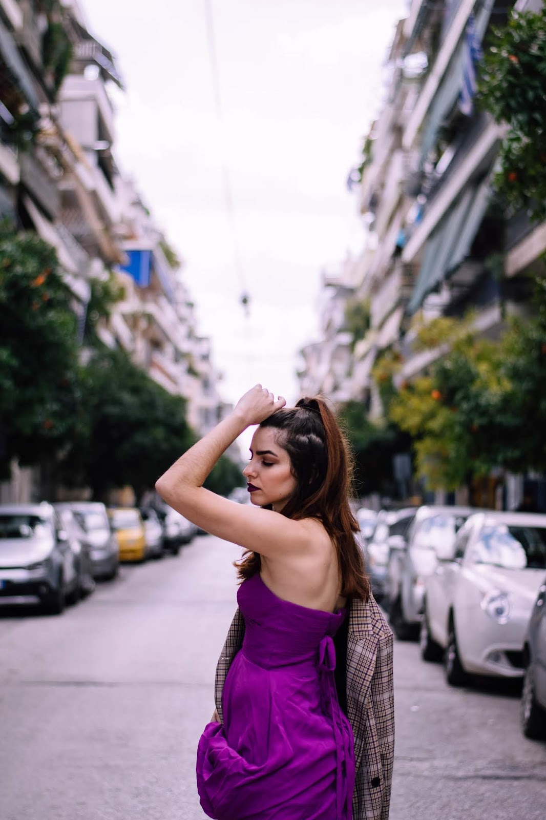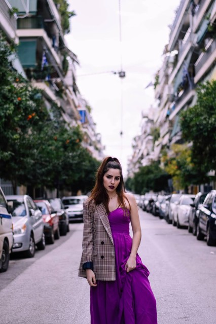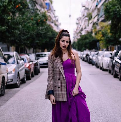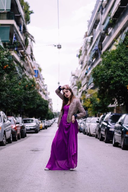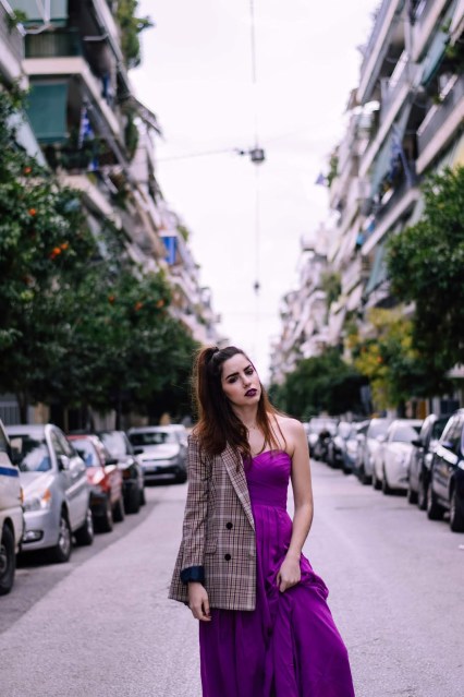 Σε αυτό το outfit post,κεντρικό ρόλο έχει το βραδινό φόρεμα σε μωβ απόχρωση, το οποίο είναι strapless,με κορδόνια στην πλάτη σαν κορσές, το οποίο προσαρμόζεται και αγκαλιάζει ιδανικά το σώμα, ενώ η φούστα του είναι αέρινη με πολλές στρώσεις από το ύφασμα και έτσι δημιουργείται κίνηση κατά το περπάτημα.