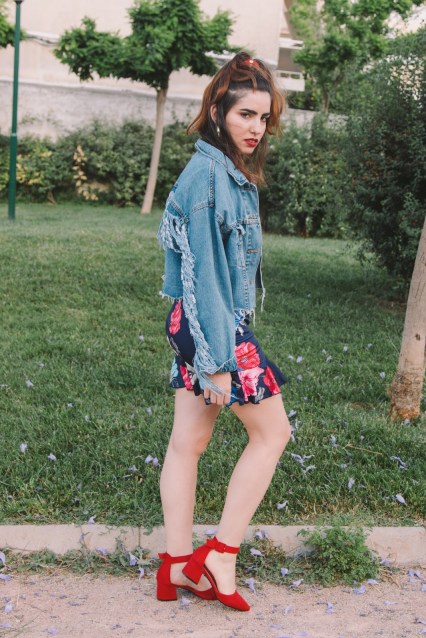 Χαρακτηριστικό ήταν το denim jacket το οποίο το συνδύαζαν με τα πάντα όπως και σήμερα, μόνο που αυτό που διαλέξαμε είναι λίγο πιο ιδιαίτερο από το κλασικό μεσάτο που φορούσε ο μπαμπάς ( αν θες να δεις πόσο τέλεια φοριέται και τώρα κάνε κλικ σε αυτό το post : Daddy’s Jacket ),αφού έχει τζιν κρόσσια στα μανίκια και στην πλάτη. Τα παπούτσια είναι οι αγαπημένες μας κόκκινες γόβες με λουράκι στον αστράγαλο και μέτριο χοντρό τακούνι, ώστε να τις φοράμε και να κινούμαστε άνετα, ενώ φοριούνται όλη την ημέρα και για ένα πιο casual look.Τα αξεσουάρ περιορίστηκαν σε ένα ζευγάρι μεσαίους κρίκους που ταίριαξαν πολύ με τα μαλλιά που είναι ελαφρώς κυματιστά και πιασμένα μισά με ένα λαστιχάκι μαλλιών πουά.