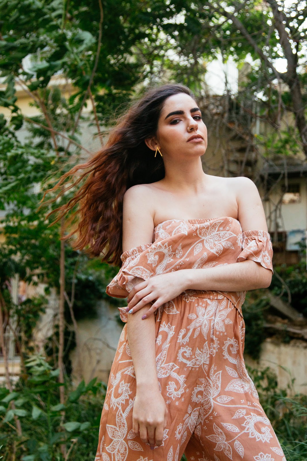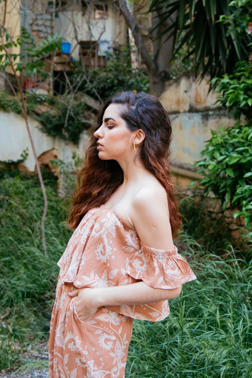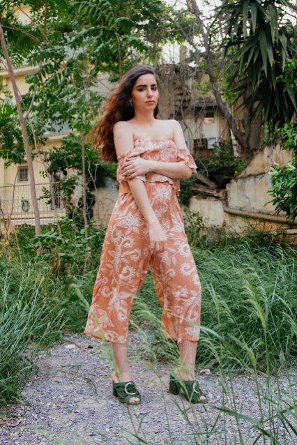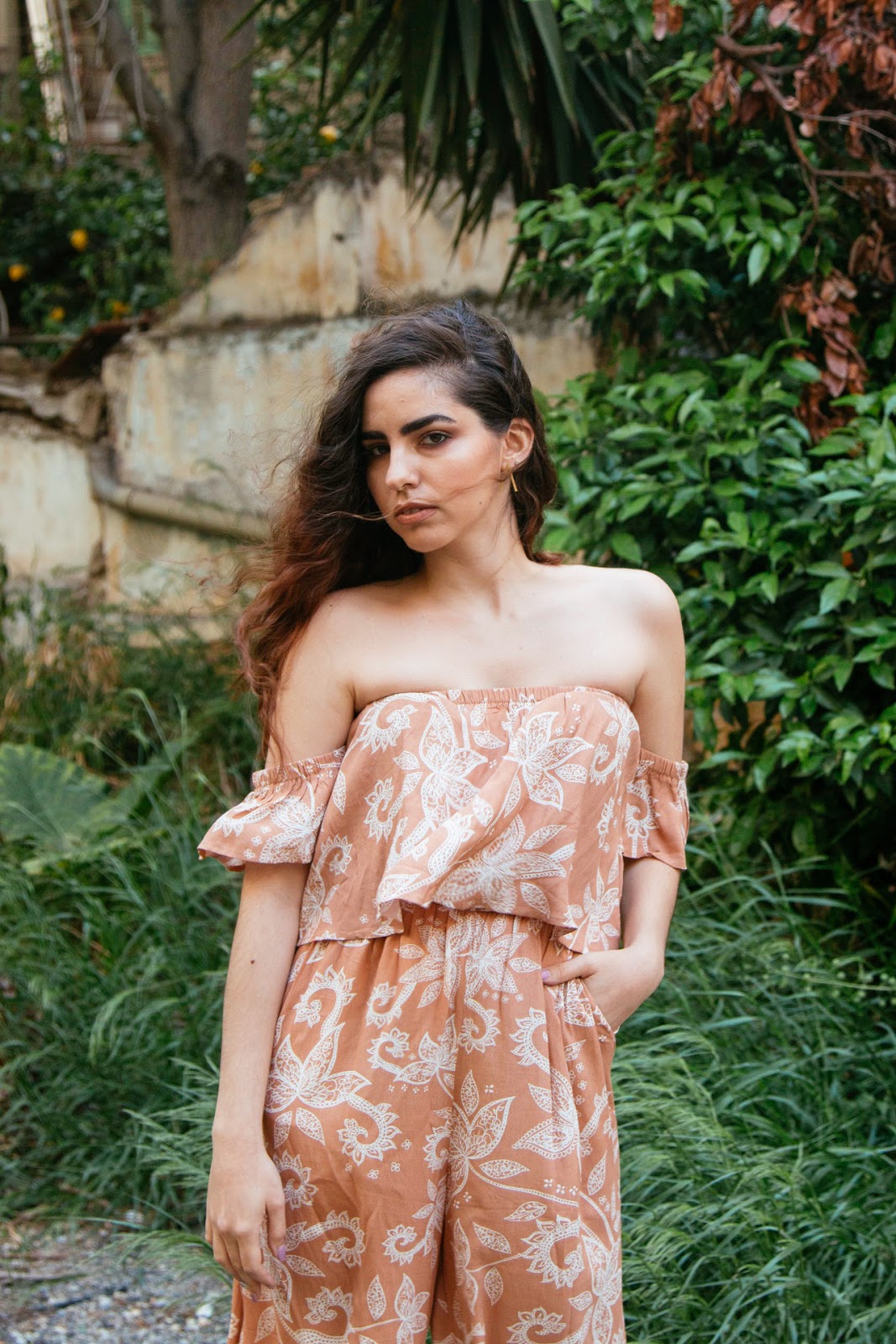 Φορώντας αυτή την ολόσωμη φόρμα, σε απόχρωση του πορτοκαλί, κάνει αντίθεση με την λευκή ακόμα επιδερμίδα μου, ενώ το μοτίβο που έχει με παραπέμπει σε ένα πιο boho mood.Είναι σε φαρδιά γραμμή και πολύ αέρινη, ενώ το off shoulder σχέδιο της κολακεύει τους ώμους και τα κόκαλα γύρω από αυτούς, όντας όσο sexy θέλω. Τα αξεσουάρ μου αποφάσισα να είναι λίγα και αρκετά, φορώντας ένα ζευγάρι minimal και γεωμετρικά χρυσά σκουλαρίκια, ενώ τα παπούτσια μου ξεφεύγουν αφού είναι σε λαδί χρώμα, με χρυσή αγκράφα ,σε στυλ mules.