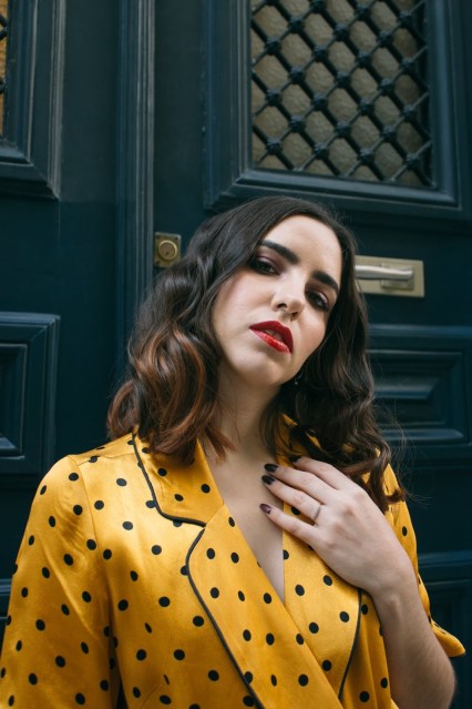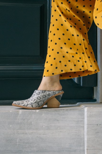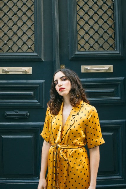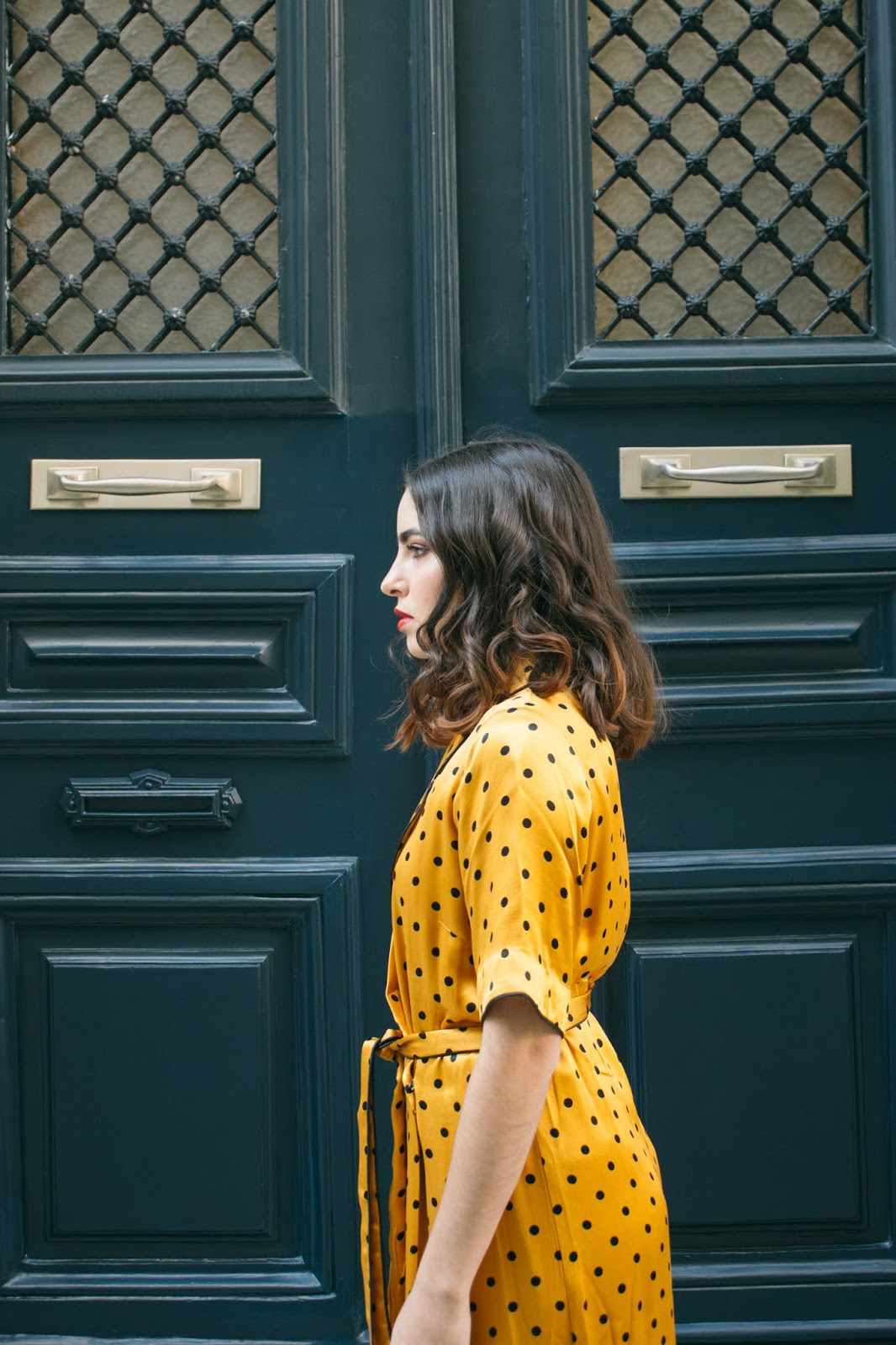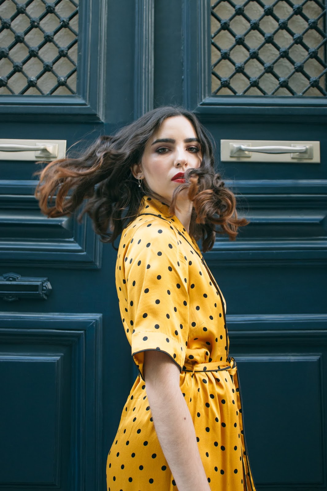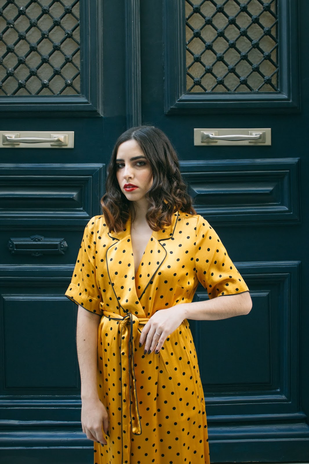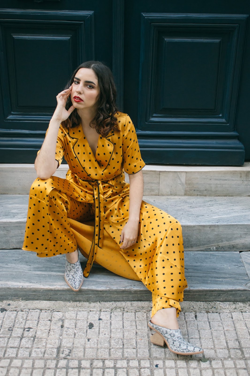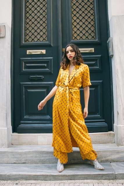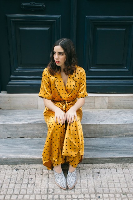 Το πρώτο λοιπόν look του 2020,είναι άνετο,loose και όχι τόσο επιτηδευμένο αλλά έχει μια πιο χαλαρή διάθεση : μια παντελόνα σε flared γραμμή, ψηλόμεση, συνδυασμένη με ένα μακρύ φόρεμα τύπου ρόμπας που δένει στην μέση , σε κίτρινο πουά μοτίβο και μανίκι μέχρι πριν τον αγκώνα. Η γραμμή τους θυμίζει τις αγαπημένες μας πιτζάμες – και η σατέν υφή τους – αλλά είναι πολύ cool για να μην φορεθεί έξω. Τα παπούτσια παραμένουν άνετα αφού είναι mules μέτριου τακουνιού με snakeprint,ενώ το διάφανο τακούνι τους τα κάνει πιο ξεχωριστά. Ανάλαφρες μπούκλες ολοκληρώνουν αυτό το loose feeling ενώ το κόκκινο κραγιόν έρχεται να κάνει αντίθεση με την λευκή επιδερμίδα και το κίτρινο-χρυσό set που τόσο αγαπήσαμε.