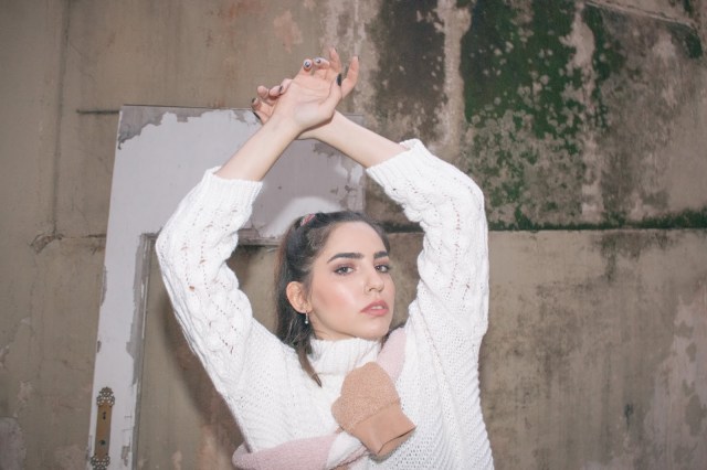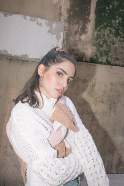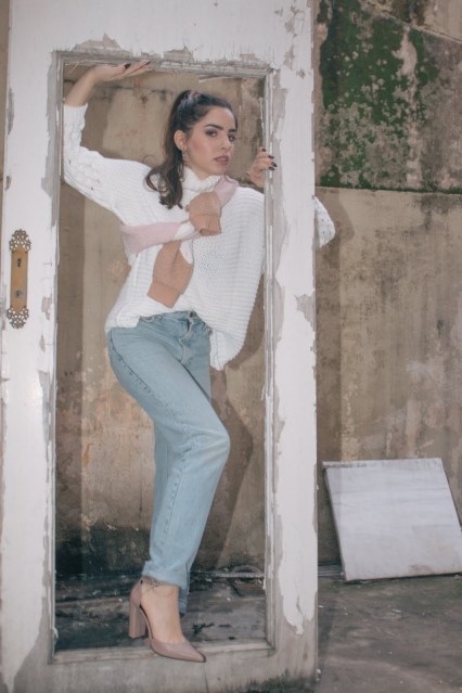 Το δεύτερο top, το οποίο επιλέξαμε να το ρίξουμε στην πλάτη στραβά και να δέσουμε τα μανίκια του στο στήθος, είναι ένα πουλόβερ-φούτερ το οποίο είναι σαν προβατάκι η υφή του και συνδυάζει αποχρώσεις του λευκού, του ροζ και του μπεζ. Ολοκληρώνει το πάνω μέρος του outfit και δίνει λίγο χρώμα στο λευκό πουλόβερ που φορέσαμε πρώτο, ενώ για παπούτσια επιλέξαμε ένα ζευγάρι μυτερές γόβες με χοντρό τακούνι και λουράκι στον αστράγαλο σε σάπιο μήλο, τα οποία είναι πολύ σταθερά στο περπάτημα και αναδεικνύουν την σιλουέτα, αντίθετα με το υπόλοιπο πιο loose look.