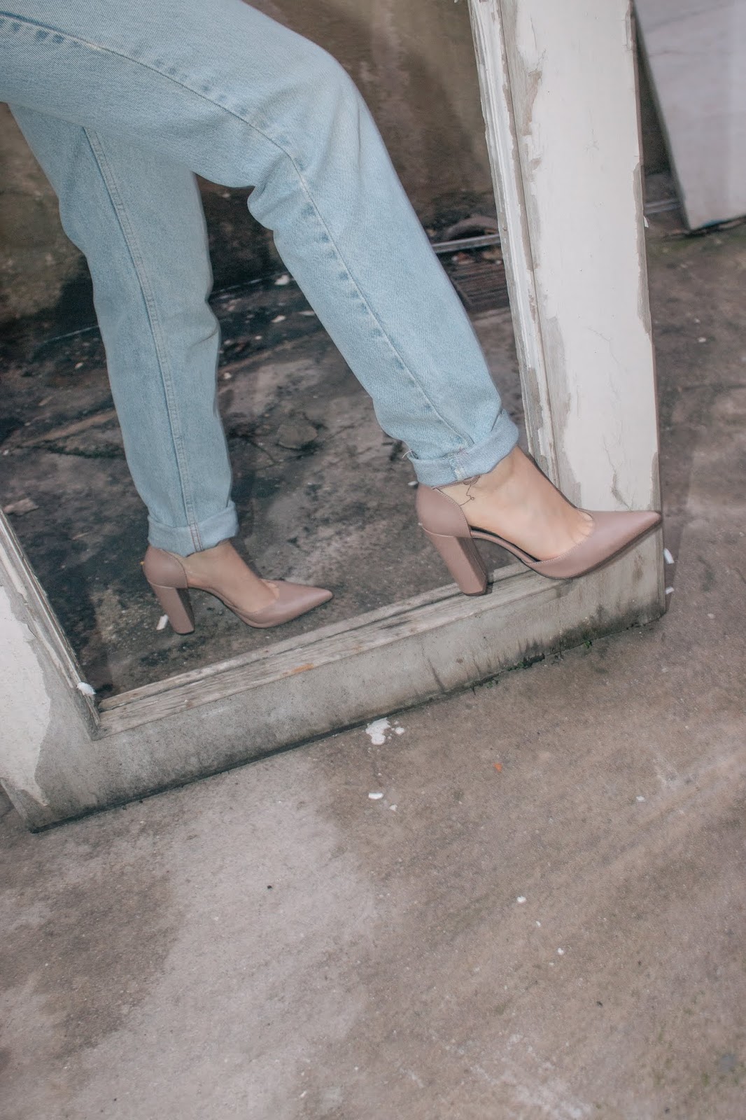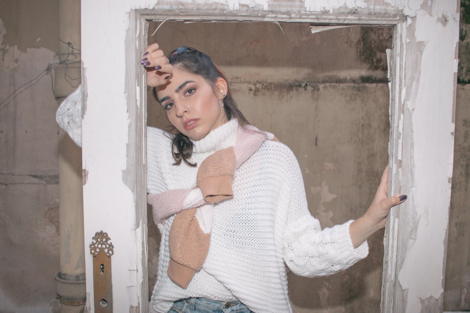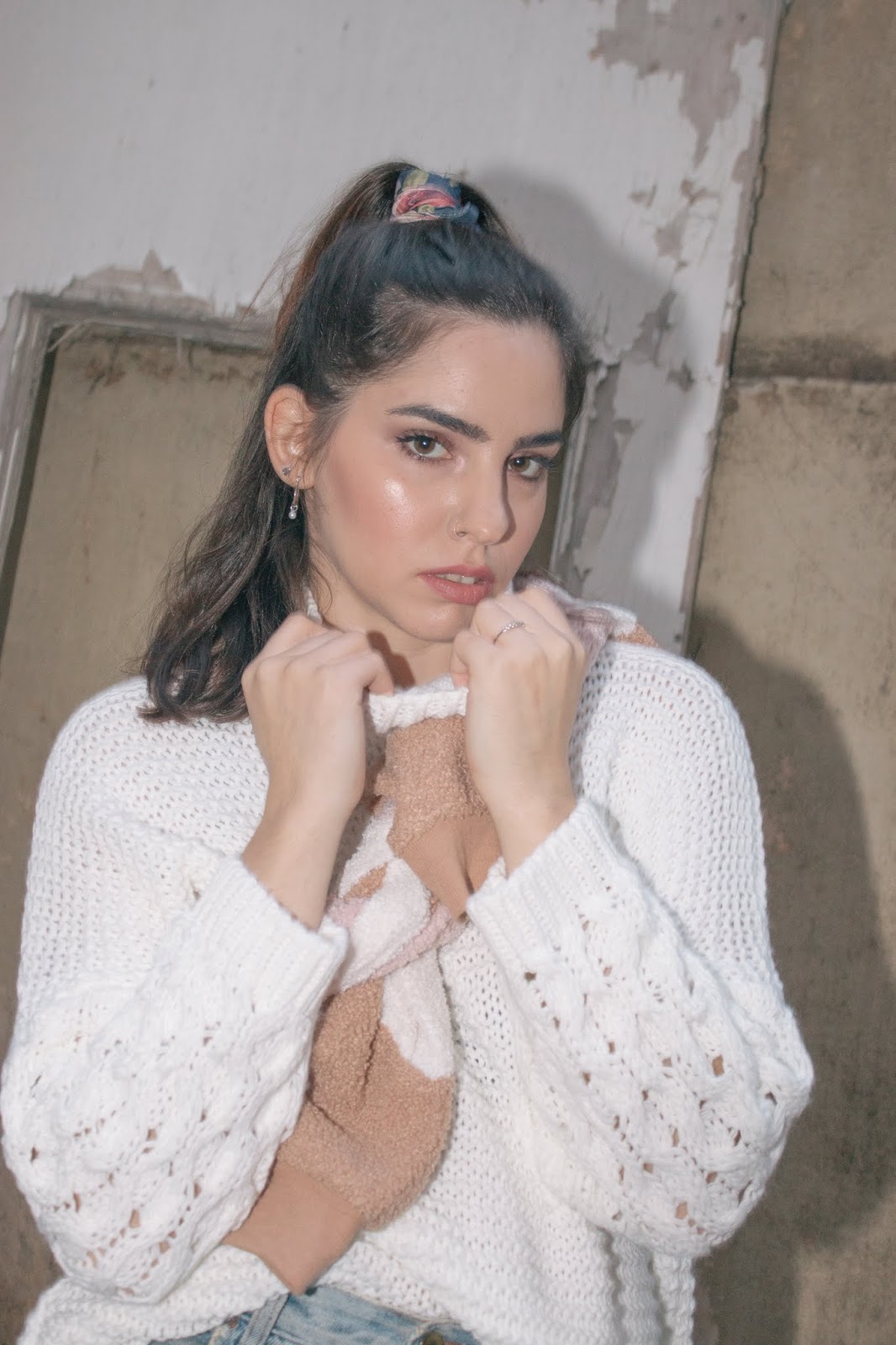 Το δεύτερο top, το οποίο επιλέξαμε να το ρίξουμε στην πλάτη στραβά και να δέσουμε τα μανίκια του στο στήθος, είναι ένα πουλόβερ-φούτερ το οποίο είναι σαν προβατάκι η υφή του και συνδυάζει αποχρώσεις του λευκού, του ροζ και του μπεζ. Ολοκληρώνει το πάνω μέρος του outfit και δίνει λίγο χρώμα στο λευκό πουλόβερ που φορέσαμε πρώτο, ενώ για παπούτσια επιλέξαμε ένα ζευγάρι μυτερές γόβες με χοντρό τακούνι και λουράκι στον αστράγαλο σε σάπιο μήλο, τα οποία είναι πολύ σταθερά στο περπάτημα και αναδεικνύουν την σιλουέτα, αντίθετα με το υπόλοιπο πιο loose look.