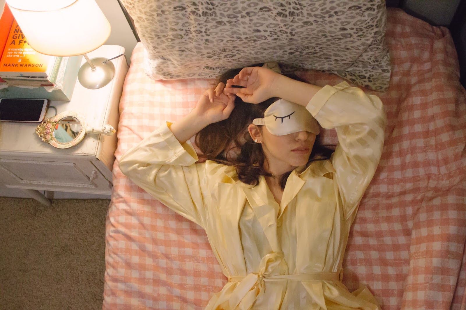 Όλα ξεκινούν από τον σωστό ύπνο και ποιοτικά, αλλά και ποσοτικά. Αν είμαστε άυπνες δεν έχουμε την απαίτηση από κανένα προϊόν να κρύψει αυτή την έλλειψη ξεκούρασης, για αυτό και πάντα το beaute μας συνδυάζεται με ένα 8ωρο ύπνου. Επειδή αντιμετωπίζουμε δυσκολία στον ύπνο αρκετές φορές, επιλέγουμε να φοράμε μάσκα ματιών που διευκολύνει τον ύπνο, ενώ επειδή δεν είναι σφιχτή δεν επηρεάζει καθόλου τις βλεφαρίδες μας.