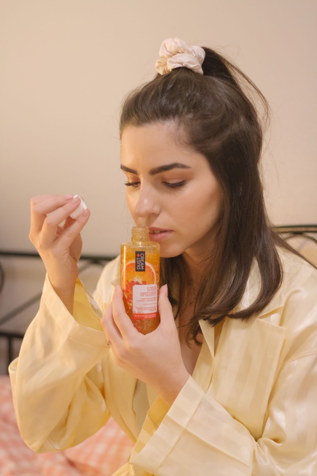 Το επόμενο βήμα είναι η σωστή απολέπιση, ώστε να φύγουν τα νεκρά κύτταρα της επιδερμίδας μας, και να αποκτήσει μια πιο λεία όψη και αίσθηση. Χρησιμοποιούμε συνδυαστικά και το Scrub προσώπου της Dust & Cream το οποίο περιέχει και αυτό εκχύλισμα πορτοκαλιού. Έχει κόκκους που δεν είναι πολύ έντονοι κατά την εφαρμογή, και έτσι δεν ερεθίζουν το δέρμα μας αλλά καθαρίζουν σε βάθος , ενώ αφήνει αίσθηση φρεσκάδας.