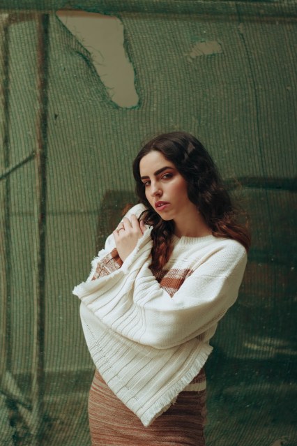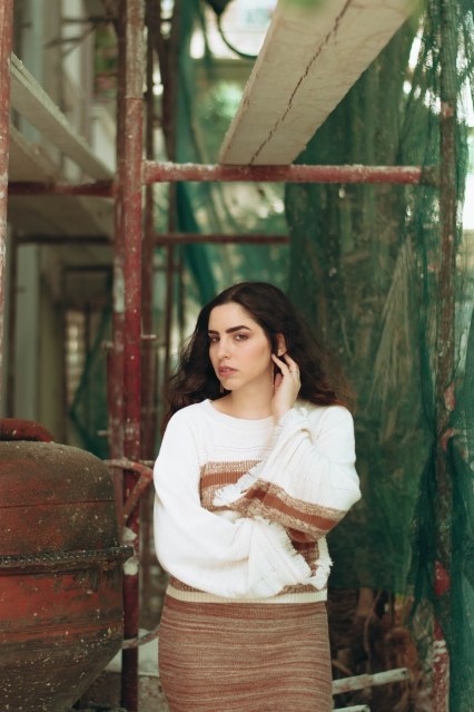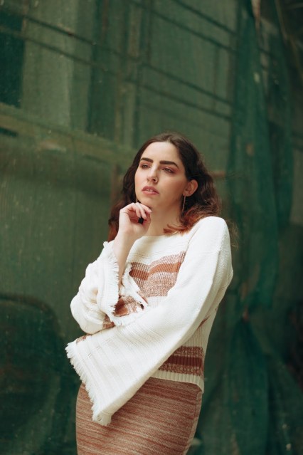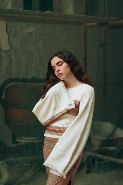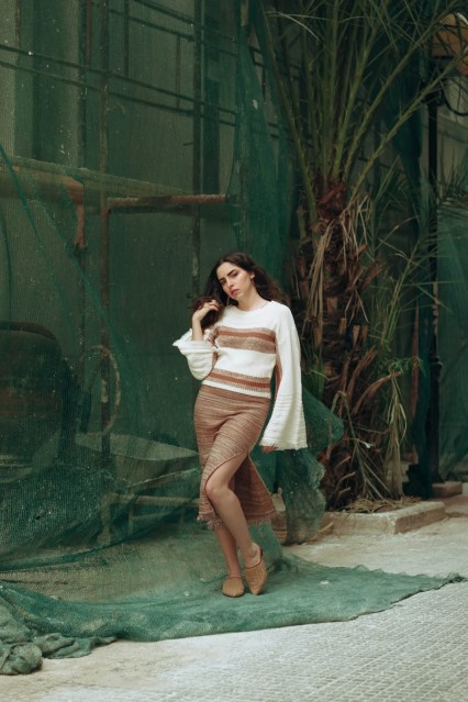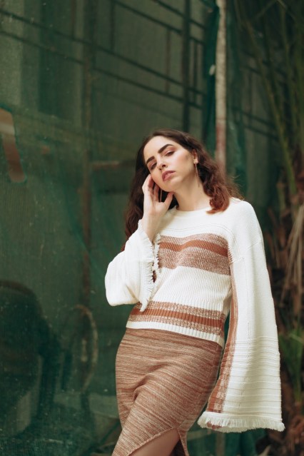 Επιλέγουμε λοιπόν ένα πλεκτό σετ που αποτελείται από ένα crop πουλόβερ με φαρδιά μανίκια τύπου καμπάνα και στρογγυλή λαιμόκοψη, το οποίο έχει ως βάση του το offwhite και έτσι φωτίζει το πρόσωπο. Στο στήθος και στην μέση έχει ρίγες σε σκούρο μπεζ και καφέ χρώμα που ταιριάζει και «δένει» ομοιόμορφα με την midi φούστα που κινείται στους ίδιους τόνους και στην ίδια πλέξη.