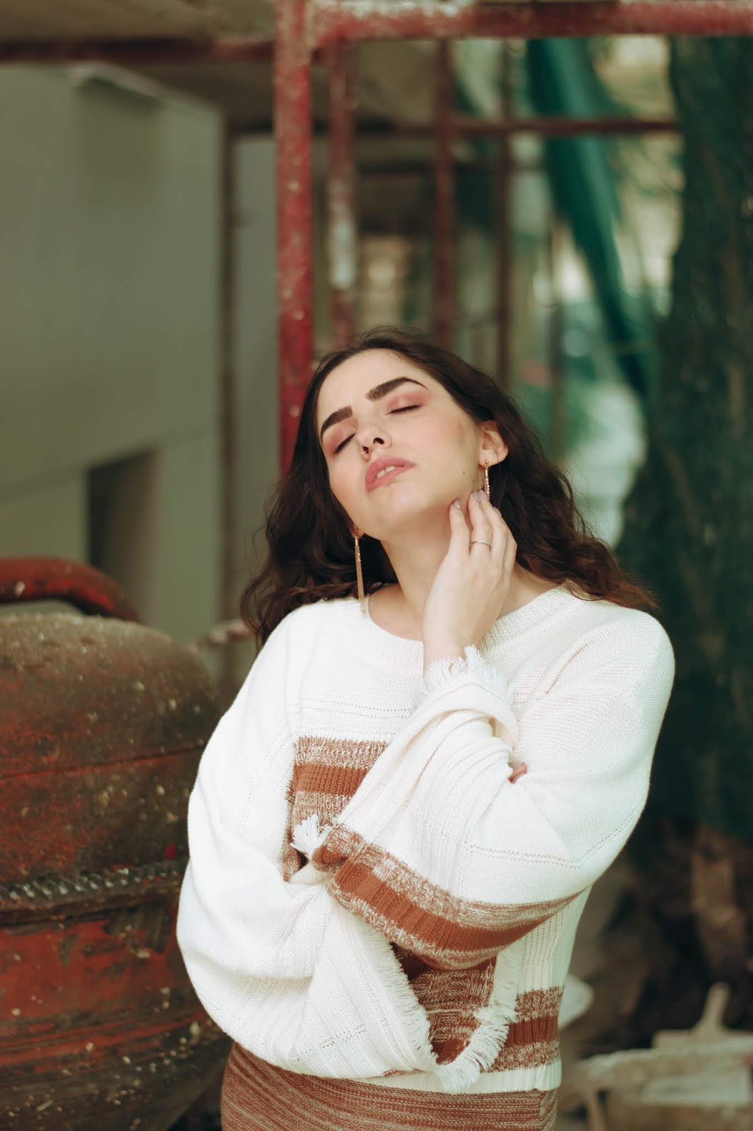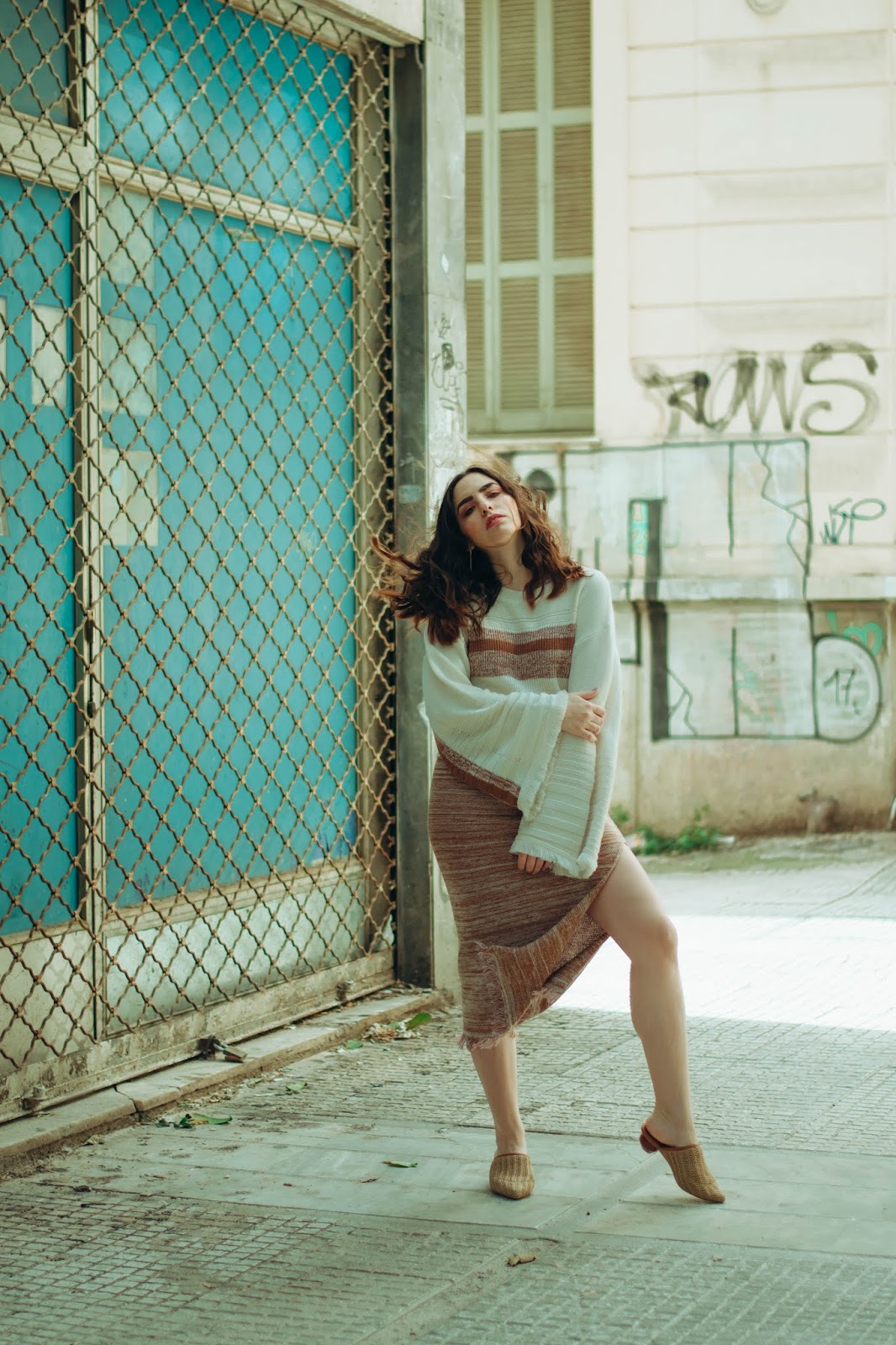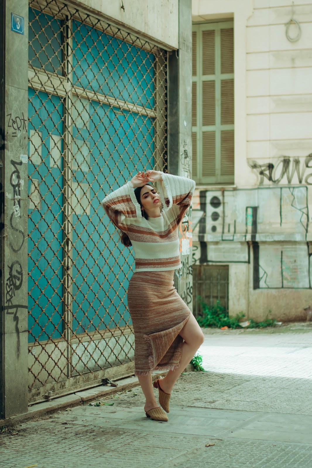 Επιλέγουμε λοιπόν ένα πλεκτό σετ που αποτελείται από ένα crop πουλόβερ με φαρδιά μανίκια τύπου καμπάνα και στρογγυλή λαιμόκοψη, το οποίο έχει ως βάση του το offwhite και έτσι φωτίζει το πρόσωπο. Στο στήθος και στην μέση έχει ρίγες σε σκούρο μπεζ και καφέ χρώμα που ταιριάζει και «δένει» ομοιόμορφα με την midi φούστα που κινείται στους ίδιους τόνους και στην ίδια πλέξη.