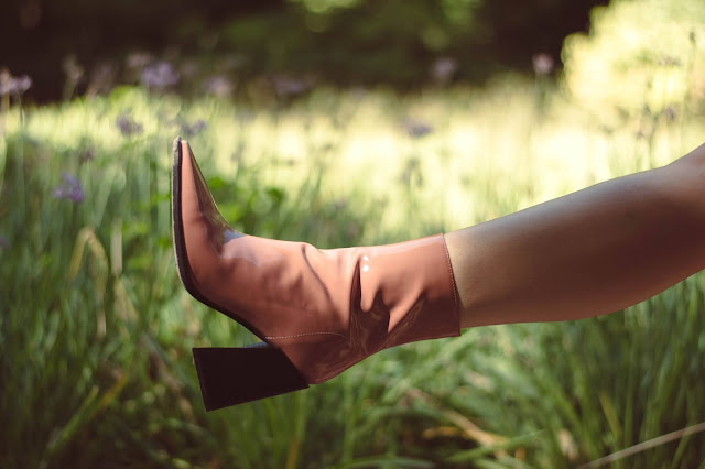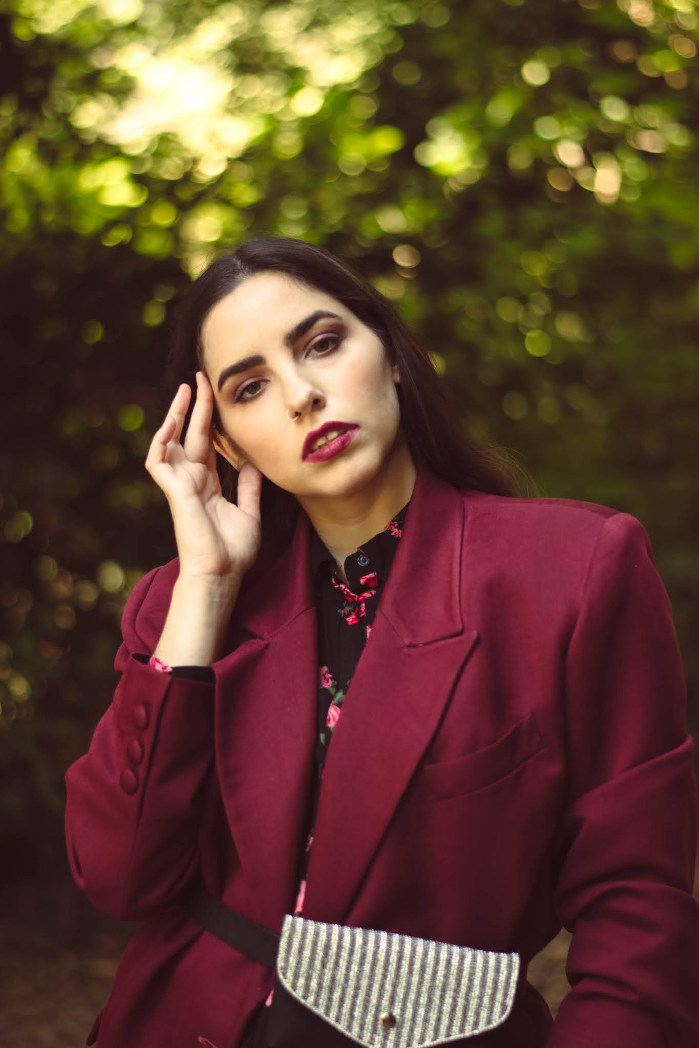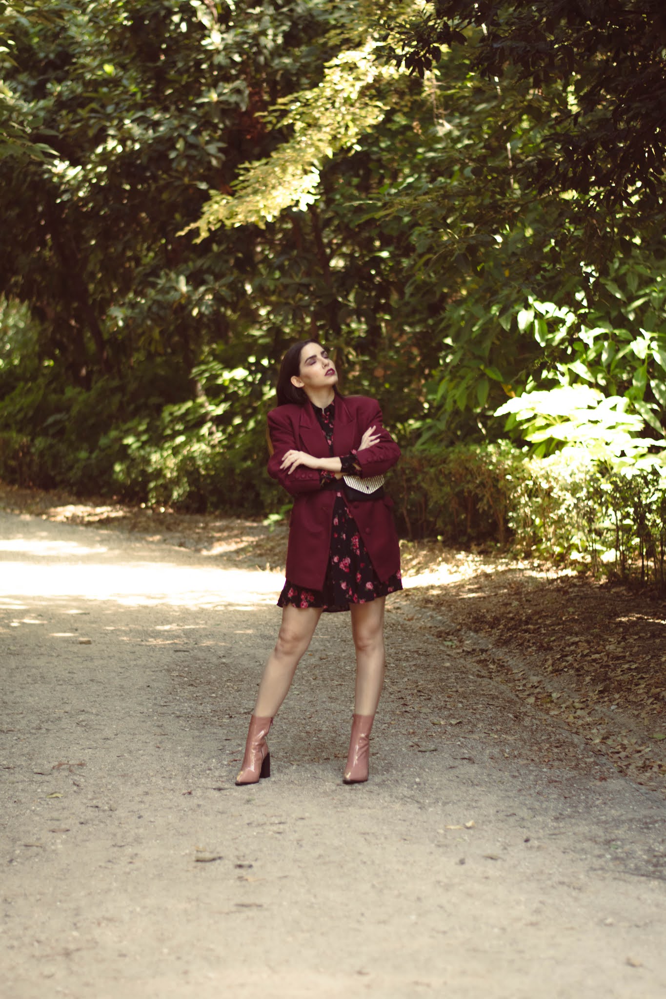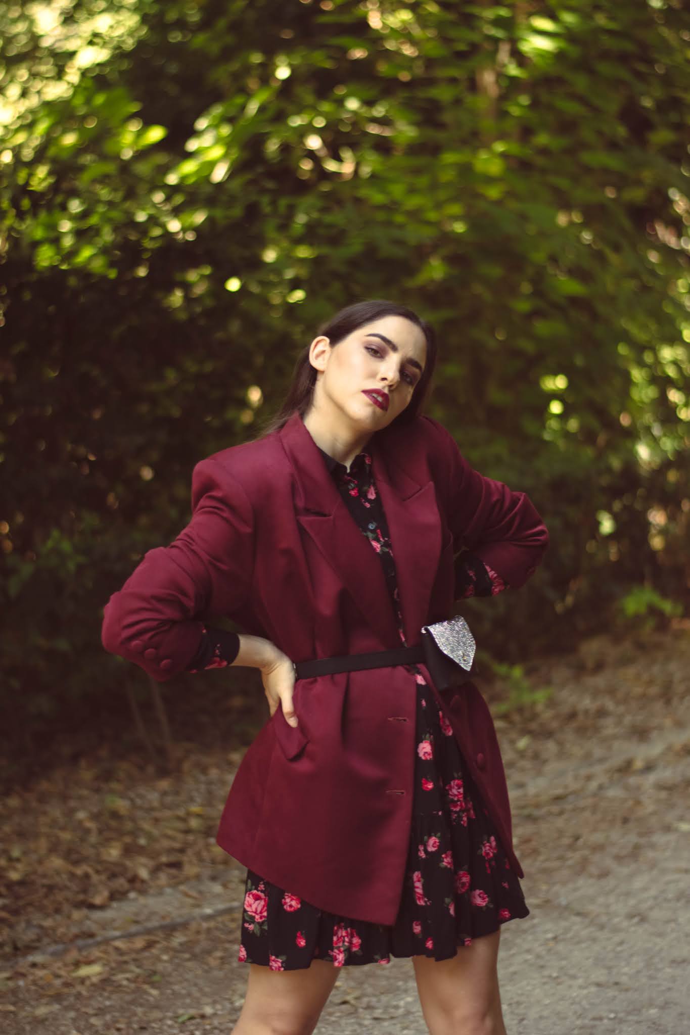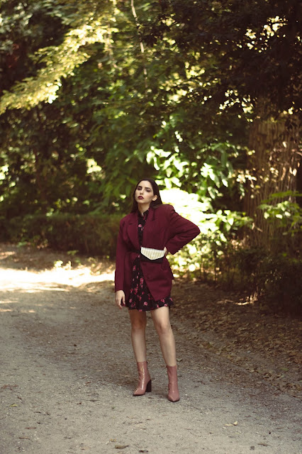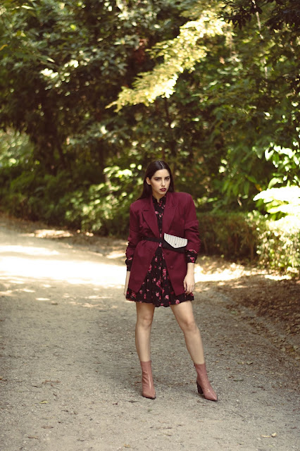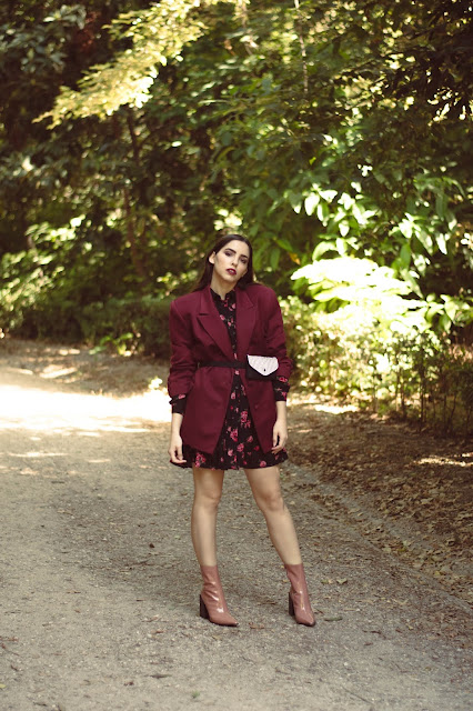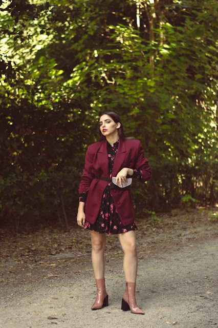 Έτσι λοιπόν, το συνδυάσαμε με ένα shirt dress, με ρομαντικό floral μοτίβο, το οποίο κινείται στις ίδιες αποχρώσεις για αυτό και δένουν έτσι ομοιόμορφα. Για να δώσουμε σχήμα στην σιλουέτα φορέσαμε από πάνω ένα super λαμπερό waist bag που χωράει ίσα τα πολύ απαραίτητα αλλά δίνει extra πόντους στυλ, ενώ τα glossy μποτάκια με το ιδιαίτερο τακούνι και την nude απόχρωση, ολοκληρώνει το outfit και προσθέτει την θηλυκότητα που λείπει από το bossy σακάκι.
